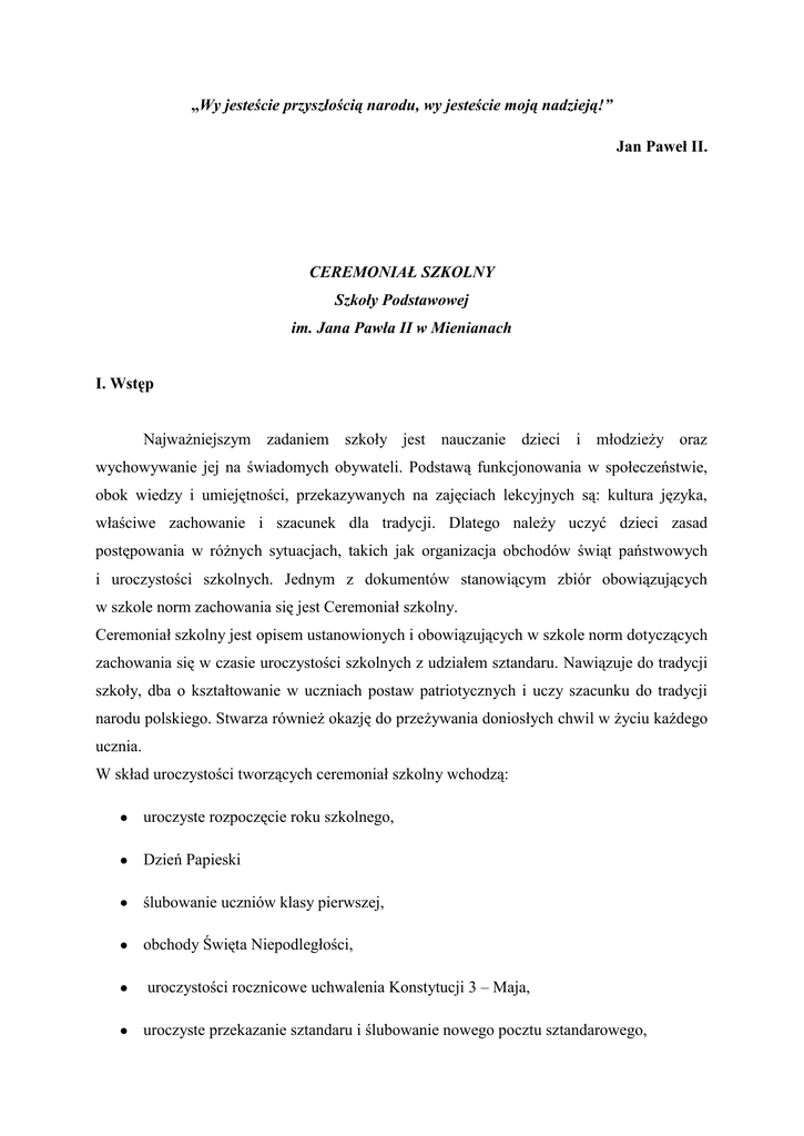 „Wy jesteście przyszłością narodu, wy jesteście moją nadzieją!” Jan Paweł II. CEREMONIAŁ SZKOLNY Szkoły Podstawowej im. Jana Pawła II w Mienianach I. Wstęp Najważniejszym zadaniem szkoły jest nauczanie dzieci i młodzieży oraz wychowywanie jej na świadomych obywateli. Podstawą funkcjonowania w społeczeństwie, obok wiedzy i umiejętności, przekazywanych na zajęciach lekcyjnych są: kultura języka, właściwe zachowanie i szacunek dla tradycji. Dlatego należy uczyć dzieci zasad postępowania w różnych sytuacjach, takich jak organizacja obchodów świąt państwowych i uroczystości szkolnych. Jednym z dokumentów stanowiącym zbiór obowiązujących w szkole norm zachowania się jest Ceremoniał szkolny. Ceremoniał szkolny jest opisem ustanowionych i obowiązujących w szkole norm dotyczących zachowania się w czasie uroczystości szkolnych z udziałem sztandaru. Nawiązuje do tradycji szkoły, dba o kształtowanie w uczniach postaw patriotycznych i uczy szacunku do tradycji narodu polskiego. Stwarza również okazję do przeżywania doniosłych chwil w życiu każdego ucznia. W skład uroczystości tworzących ceremoniał szkolny wchodzą: uroczyste rozpoczęcie roku szkolnego, Dzień Papieski ślubowanie uczniów klasy pierwszej, obchody Święta Niepodległości, uroczystości rocznicowe uchwalenia Konstytucji 3 – Maja, uroczyste przekazanie sztandaru i ślubowanie nowego pocztu sztandarowego, uroczyste zakończenie roku szkolnego. II Symbole szkoły Szkoła Podstawowa im. Jana Pawła II w Mienianach posiada: a). Patrona c). Sztandar e). Ceremoniał szkolny III Patron szkoły Patronem Szkoły Podstawowej w Mienianach jest Jan Paweł II. Fot. 1 Zdjęcie Patrona IV. Sztandar szkoły Fot.2. Sztandar szkoły- awers Fot. 3. Sztandar szkoły- rewers. Sztandar posiada kształt kwadratu o wymiarach 95 x 95 cm, wykonany jest z jedwabnego rypsu przytwierdzonego do drzewca. Obszyty jest złotymi frędzlami o długości 4 cm. Strona główna - awers płata - jest w kolorze biało-czerwonym. Motywem centralnym jest godło Polski: wizerunek orła białego, o wymiarach 48 cm, głową zwrócony do drzewca, haftowany srebrnym sztychem, natomiast korona, dziób i szpony orła haftowane są złotym sztychem. W otoku wizerunku orła napis Szkoła Podstawowa im Jana Pawła II w Mienianach. Strona odwrotna - rewers płata - jest w kolorze białym. W części środkowej płata znajduje się wyhaftowany wizerunek Jana Pawła II, a pod wizerunkiem widnieje napis: „Wy jesteście przyszłością świata, wy jesteście moją nadzieją!” Jan Paweł II. Drzewiec sztandaru jest wykonany z drewna toczonego, w kolorze dębu. Jest dwudzielny, łączony tuleją z białego metalu. Na końcu drzewca umieszczona jest głowica. Głowicę sztandaru stanowi orzeł wykonany z metalu. Ponieważ uczestnictwo w poczcie sztandarowym to najbardziej honorowa funkcja w szkole, dlatego w jego skład wchodzą uczniowie o nienagannej postawie i godni takiego szacunku. Skład osobowy pocztu sztandarowego tworzą: chorąży ( sztandarowy) – uczeń i asysta (dwie uczennice). Kandydatury składu pocztu sztandarowego oraz składu zastępczego są przedstawione na czerwcowej Radzie Pedagogicznej i przez nią zatwierdzone. Kadencja pocztu sztandarowego trwa jeden rok (począwszy od przekazania w dniu uroczystego zakończenia roku szkolnego) i decyzją Rady Pedagogicznej uczniowie mogą być odwołani ze składu pocztu sztandarowego. W takim przypadku dokonuje się wyboru uzupełniającego. Chorąży i asysta ubrani są odświętnie. Uczeń – garnitur lub ciemne spodnie, biała koszula, krawat, czarne obuwie, a uczennice – biała bluzka i ciemne spódnice tej samej długości, czarne obuwie. Uzupełnieniem stroju jest biało- czerwona szarfa przewieszona przez prawe ramię, zwrócona kolorem białym w stronę kołnierzyka, spięta na lewym biodrze oraz białe rękawiczki. Sztandar ma dla szkoły ogromne znaczenie. Jest jej symbolem i reprezentantem. Towarzyszy jej w ważnych chwilach, podczas szkolnych uroczystości, ślubowania, imprez szkolnych. Może również brać udział w uroczystościach rocznicowych organizowanych przez administrację samorządową i państwową oraz pogrzebowych i w uroczystościach religijnych: innych. W przypadku, gdy mszy świętej, poczet uroczystościach sztandarowy uczestniczy w uroczystościach pogrzebowych lub ogłoszono żałobę narodową, sztandar powinien być ozdobiony czarnym kirem. Na sztandarze wstążkę kiru przywiesza się w miejscu jego zamocowania na drzewcu od lewej górnej strony do prawej. Sztandar jest przechowywany na korytarzu szkoły, w specjalnej gablocie. Uroczystości z udziałem sztandaru wymagają zachowania powagi, a przechowywanie, transport i przygotowanie sztandaru do prezentacji – właściwych postaw dla jego poszanowania. Poczet sztandarowy opuszcza miejsce uroczystości przed częścią artystyczną. Postawy sztandaru i pocztu sztandarowego: - postawa ,,spocznij” sztandar trzymany przy prawej nodze jak w postawie ,,zasadniczej”. Chorąży i asysta w postawie ,,spocznij”. - postawa ,,na ramię” - chorąży prawą ręką (pomagając sobie lewą) kładzie drzewiec na prawe ramię i trzyma je pod kątem 45º w stosunku do ramienia. Prawa ręka wyciągnięta wzdłuż drzewca, - postawa ,,prezentuj” z postawy ,,zasadniczej” chorąży podnosi sztandar prawą ręką i pionowo do góry wzdłuż prawego ramienia (dłoń prawej ręki na wysokości barku). Następnie lewą ręką chwyta drzewiec sztandaru tuż pod prawą i opuszcza prawą rękę na całej jej długości, obejmując dolną część drzewca. Asysta w postawie ,,zasadniczej”. ,,Prezentuj” - Chorąży robi zwrot w prawo skos z równoczesnym wysunięciem lewej nogi w przód na odległość jednej stopy i pochyla sztandar do przodu pod kątem 45º. Po czasie ,,salutowania” przenosi sztandar do postawy ,,prezentuj”. Przebieg uroczystości z udziałem sztandaru 1. Wpr