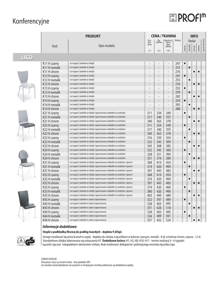 Konferencyjne CENA / TKANINA ( III ) 311 317 340 311 317 340 316 322 345 322 328 351 368 374 397 368 374 397 374 380 403 322 328 351 328 334 357 334 340 363 334 340 363 339 345 368 345 351 374 414 420 443 414 420 443 420 426 449 397 403 426 403 409 432 349 355 378 349 355 378 354 360 383 360 366 389 454 460 483 454 460 483 460 466 489 489 495 518 495 501 524 LIGO K11 H czarny K11 H metalik K11 H chrom K12 H czarny K12 H metalik K12 H chrom K13 H czarny K13 H metalik K13 H chrom K14 H czarny K14 H metalik K14 H chrom K21 H czarny K21 H metalik K21 H chrom K22 H czarny K22 H metalik K22 H chrom K23 H czarny K23 H metalik K23 H chrom K24 H czarny K24 H metalik K24 H chrom K31 H czarny K31 H metalik K31 H chrom K32 H czarny K32 H metalik K32 H chrom K33 H czarny K33 H metalik K33 H chrom K43 H czarny K43 H metalik K43 H chrom K44 H czarny K44 H metalik K44 H chrom na nogach, kubełek ze sklejki na nogach, kubełek ze sklejki na nogach, kubełek ze sklejki na nogach, kubełek ze sklejki na nogach, kubełek ze sklejki na nogach, kubełek ze sklejki na nogach, kubełek ze sklejki na nogach, kubełek ze sklejki na nogach, kubełek ze sklejki na nogach, kubełek ze sklejki na nogach, kubełek ze sklejki na nogach, kubełek ze sklejki na nogach, kubełek ze sklejki, tapicerowana nakładka na siedzisko na nogach, kubełek ze sklejki, tapicerowana nakładka na siedzisko na nogach, kubełek ze sklejki, tapicerowana nakładka na siedzisko na nogach, kubełek ze sklejki, tapicerowana nakładka na siedzisko na nogach, kubełek ze sklejki, tapicerowana nakładka na siedzisko na nogach, kubełek ze sklejki, tapicerowana nakładka na siedzisko na nogach, kubełek ze sklejki, tapicerowana nakładka na siedzisko na nogach, kubełek ze sklejki, tapicerowana nakładka na siedzisko na nogach, kubełek ze sklejki, tapicerowana nakładka na siedzisko na nogach, kubełek ze sklejki, tapicerowana nakładka na siedzisko na nogach, kubełek ze sklejki, tapicerowana nakładka na siedzisko na nogach, kubełek ze sklejki, tapicerowana nakładka na siedzisko na nogach, kubełek ze sklejki, tapicerowane nakładki na siedzisko i oparcie na nogach, kubełek ze sklejki, tapicerowane nakładki na siedzisko i oparcie na nogach, kubełek ze sklejki, tapicerowane nakładki na siedzisko i oparcie na nogach, kubełek ze sklejki, tapicerowane nakładki na siedzisko i oparcie na nogach, kubełek ze sklejki, tapicerowane nakładki na siedzisko i oparcie na nogach, kubełek ze sklejki, tapicerowane nakładki na siedzisko i oparcie na nogach, kubełek ze sklejki, tapicerowane nakładki na siedzisko i oparcie na nogach, kubełek ze sklejki, tapicerowane nakładki na siedzisko i oparcie na nogach, kubełek ze sklejki, tapicerowane nakładki na siedzisko i oparcie na nogach, kubełek w całości tapicerowany na nogach, kubełek w całości tapicerowany na nogach, kubełek w całości tapicerowany na nogach, kubełek w całości tapicerowany na nogach, kubełek w całości tapicerowany na nogach, kubełek w całości tapicerowany satyna ( II ) 247 253 276 247 253 276 253 259 282 259 265 288 - Informacje dodatkowe: Stopki z podkładką filcową do podłóg twardych - dopłata 9 zł/kpl. Istnieje możliwość łączenia krzeseł w rzędy - dopłata do stelaża z łącznikiem w kolorze czarnym, metalik - 8 zł; w kolorze chrom, satyna - 12 zł. Standardowo sklejka lakierowana wg oznaczenia H7. Dodatkowe kolory: H1, H2, H8, H10, H11 - termin realizacji 4 - 6 tygodni. Łącznik Ligo jest integralalnym elementem stelaża. Brak możliwości dokupienia i późniejszego montażu łącznika Ligo. UWAGI OGÓLNE: Powyższe ceny są cenami netto - bez podatku VAT. Za wyroby niestandardowe nie zawarte w niniejszym cenniku pobierane są dodatkowe opłaty. opcja drewna (I) INFO Stelaż Sklejka chrom Ilio, Aquarius, Softline Fame, Step, Ultima czarny Opis modelu Kod Eco, Evo, Next metalik PRODUKT