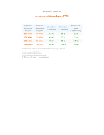 FiberNET - cennik przyłącze światłowodowe – FTTH Prędkość Prędkość ściągania wysyłania danych* danych* 100 Mb/s Umowa na Umowa na Umowa na 24 miesiące 12 miesięcy 10 Mb/s 55 zł 69 zł 99 zł 300 Mb/s 30 Mb/s 69 zł 79 zł 129 zł 600 Mb/s 60 Mb/s 79 zł 89 zł 179 zł 1000 Mb/s 100 Mb/s 99 zł 129 zł 199 zł * maksymalna prędkość mierzona do routera brzegowego Operatora. cennik ważny od 01.03.2017 oferta ograniczona terytorialnie. oferta skierowana do osób fizycznych brak limitu pobierania i wysyłania danych czas nieokreślony