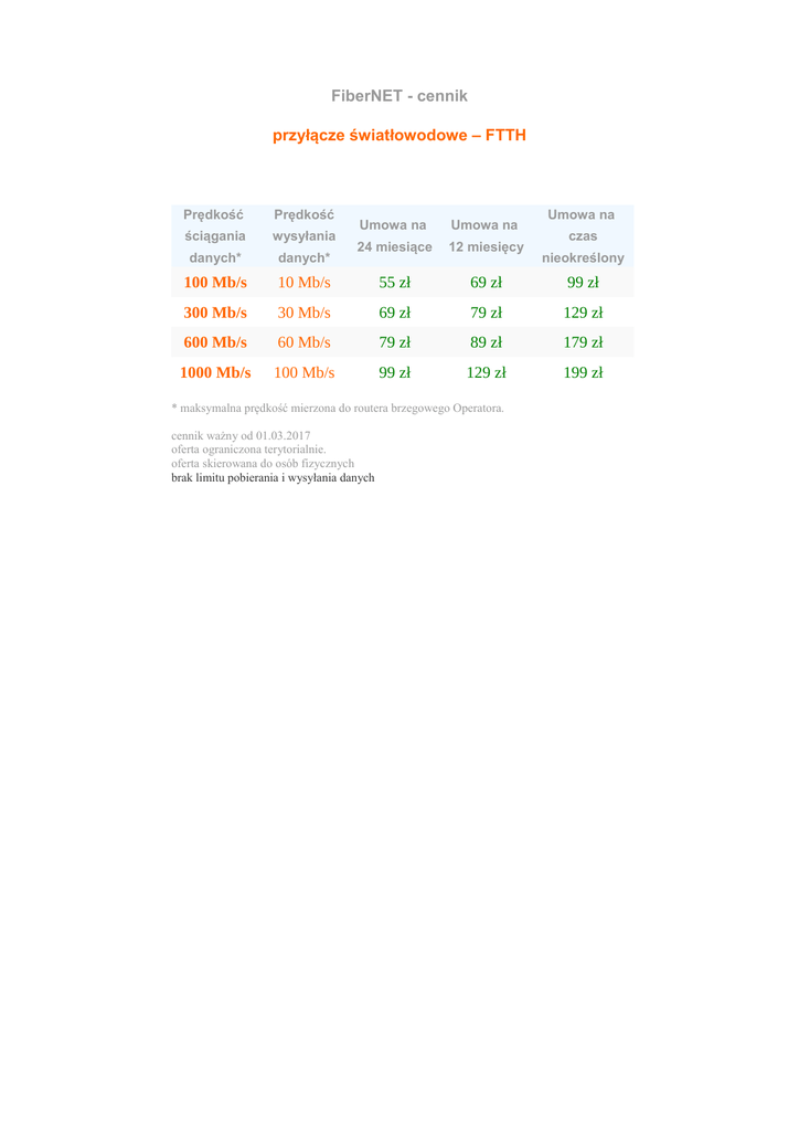 FiberNET - cennik przyłącze światłowodowe – FTTH 100 Mb/s 10