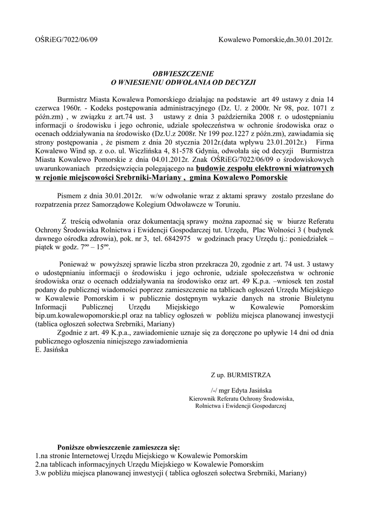 OŚRiEG/7022/06/09 Kowalewo Pomorskie,dn.30.01.2012r. OBWIESZCZENIE O WNIESIENIU ODWOŁANIA OD DECYZJI Burmistrz Miasta Kowalewa Pomorskiego działając na podstawie art 49 ustawy z dnia 14 czerwca 1960r. - Kodeks postępowania administracyjnego (Dz. U. z 2000r. Nr 98, poz. 1071 z późn.zm) , w związku z art.74 ust. 3 ustawy z dnia 3 października 2008 r. o udostępnianiu informacji o środowisku i jego ochronie, udziale społeczeństwa w ochronie środowiska oraz o ocenach oddziaływania na środowisko (Dz.U.z 2008r. Nr 199 poz.1227 z późn.zm), zawiadamia się strony postępowania , że pismem z dnia 20 stycznia 2012r.(data wpływu 23.01.2012r.) Firma Kowalewo Wind sp. z o.o. ul. Wiczlińska 4, 81-578 Gdynia, odwołała się od decyzji Burmistrza Miasta Kowalewo Pomorskie z dnia 04.01.2012r. Znak OŚRiEG/7022/06/09 o środowiskowych uwarunkowaniach przedsięwzięcia polegającego na budowie zespołu elektrowni wiatrowych w rejonie miejscowości Srebrniki-Mariany , gmina Kowalewo Pomorskie Pismem z dnia 30.01.2012r. w/w odwołanie wraz z aktami sprawy zostało przesłane do rozpatrzenia przez Samorządowe Kolegium Odwoławcze w Toruniu. Z treścią odwołania oraz dokumentacją sprawy można zapoznać się w biurze Referatu Ochrony Środowiska Rolnictwa i Ewidencji Gospodarczej tut. Urzędu, Plac Wolności 3 ( budynek dawnego ośrodka zdrowia), pok. nr 3, tel. 6842975 w godzinach pracy Urzędu tj.: poniedziałek – piątek w godz. 7ºº – 15ºº. Ponieważ w powyższej sprawie liczba stron przekracza 20, zgodnie z art. 74 ust. 3 ustawy o udostępnianiu informacji o środowisku i jego ochronie, udziale społeczeństwa w ochronie środowiska oraz o ocenach oddziaływania na środowisko oraz art. 49 K.p.a. –wniosek ten został podany do publicznej wiadomości poprzez zamieszczenie na tablicach ogłoszeń Urzędu Miejskiego w Kowalewie Pomorskim i w publicznie dostępnym wykazie danych na stronie Biuletynu Informacji Publicznej Urzędu Miejskiego w Kowalewie Pomorskim bip.um.kowalewopomorskie.pl oraz na tablicy ogłoszeń w pobliżu miejsca planowanej inwestycji (tablica ogłoszeń sołectwa Srebrniki, Mariany) Zgodnie z art. 49 K.p.a., zawiadomienie uznaje się za doręczone po upływie 14 dni od dnia publicznego ogłoszenia niniejszego zawiadomienia E. Jasińska Z up. BURMISTRZA /-/ mgr Edyta Jasińska Kierownik Referatu Ochrony Środowiska, Rolnictwa i Ewidencji Gospodarczej Poniższe obwieszczenie zamieszcza się: 1.na stronie Internetowej Urzędu Miejskiego w Kowalewie Pomorskim 2.na tablicach informacyjnych Urzędu Miejskiego w Kowalewie Pomorskim 3.w pobliżu miejsca planowanej inwestycji ( tablica ogłoszeń sołectwa Srebrniki, Mariany)