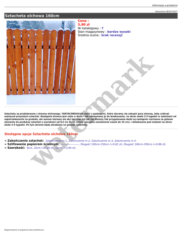 Informacje o produkcie Utworzono 08-03-2017 Sztacheta olchowa 160cm Cena : 5,90 zł er m ar k Nr katalogowy : 7 Stan magazynowy : bardzo wysoki Średnia ocena : brak recenzji Sztachety są produkowane z drewna olchowego, TARTACZNEGO(nie mylić z opałowym), które staramy się zakupić porą zimową, żeby uniknąć wykręceń przyszłych sztachet. Następnie drewno jest cięte w deski i tak odstawiamy je do leżakowania, na okres około 3-5 tygodni w zależności od zapotrzebowania na produkt, ale zawsze staramy się aby ten czas był jak naj dłuższy.Tak przygotowane deski są następnie rozcinane na gotowe elementy do produkcji sztachet o szerokości od 8,5 cm do 12 cm(na specjalne zamówienie nawet do 16 cm), i składowane pod wiatami na okres około 2-4 tygodni. Po tym okresie będą obrabiana na gotowe sztachety. at Dostępne opcje Sztacheta olchowa 160cm w » Zakończenie sztachet: Zakończenie nr.1, Zakończenie nr.2, Zakończenie nr.3, Zakończenie nr.4. » Szlifowanie papierem ściernym: --------------------, Długość 100cm-150cm (+0,62 zł), Długość 160cm-200cm (+0,86 zł). » Szerokość: 8cm, 10cm (+2,09 zł), 12cm (+3,94 zł). Wygenerowano w programie www.oscGold.com