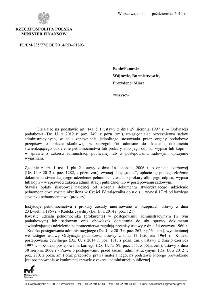 Warszawa, dnia października 2014 r. RZECZPOSPOLITA POLSKA MINISTER FINANSÓW PL/LM/835/77/EOB/2014/RD 91893 Panie/Panowie Wójtowie, Burmistrzowie, Prezydenci Miast /wszyscy/ Działając na podstawie art. 14a § 1 ustawy z dnia 29 sierpnia 1997 r. Ordynacja podatkowa (Dz. U. z 2012 r. poz. 749, z późn. zm.), uwzględniając orzecznictwo sądów administracyjnych, w celu zapewnienia jednolitego stosowania przez organy podatkowe przepisów o opłacie skarbowej, w szczególności odnośnie do składania dokumentu stwierdzającego udzielenie pełnomocnictwa lub prokury albo jego odpisu, wypisu lub kopii – w sprawie z zakresu administracji publicznej lub w postępowaniu sądowym, uprzejmie wyjaśniam. Zgodnie z art. 1 ust. 1 pkt 2 ustawy z dnia 16 listopada 2006 r. o opłacie skarbowej (Dz. U. z 2012 r. poz. 1282, z późn. zm.), zwanej dalej „u.o.s.”, opłacie tej podlega złożenie dokumentu stwierdzającego udzielenie pełnomocnictwa lub prokury albo jego odpisu, wypisu lub kopii – w sprawie z zakresu administracji publicznej lub w postępowaniu sądowym. Stawka opłaty skarbowej należnej od złożenia dokumentu stwierdzającego udzielenie pełnomocnictwa została określona w Części IV załącznika do u.o.s. i wynosi 17 zł od każdego stosunku pełnomocnictwa (prokury). Instytucje pełnomocnictwa i prokury zostały unormowane w przepisach ustawy z dnia 23 kwietnia 1964 r. - Kodeks cywilny (Dz. U. z 2014 r. poz. 121). Kwestię udziału pełnomocnika (prokurenta) w postępowaniu administracyjnym (w tym podatkowym) lub sądowym oraz obowiązek dołączania do akt sprawy dokumentu stwierdzającego udzielenie pełnomocnictwa regulują przepisy ustawy z dnia 14 czerwca 1960 r. - Kodeks postępowania administracyjnego (Dz. U. z 2013 r. poz. 267, z późn. zm.), wymienionej we wstępie ustawy Ordynacja podatkowa, ustawy z dnia 17 listopada 1964 r.- Kodeks postępowania cywilnego (Dz. U. z 2014 r. poz. 101, z późn. zm.), ustawy z dnia 6 czerwca 1997 r. Kodeks postępowania karnego (Dz. U. Nr 89, poz. 555, z późn. zm.), ustawy z dnia 30 sierpnia 2002 r.- Prawo o postępowaniu przed sądami administracyjnymi (Dz. U. z 2012 r. poz. 270, z późn. zm.) oraz przepisów prawa materialnego, na podstawie którego prowadzone jest postępowanie w konkretnej sprawie z zakresu administracji publicznej. ul. Świętokrzyska 12, 00-916 Warszawa | tel.: +48 22 694 58 04 | fax: +48 22 694 41 03 | e-mail: [email protected] Obowiązek pełnomocnika dołączenia do akt oryginału lub urzędowo poświadczonego odpisu pełnomocnictwa wynika jednoznacznie, m.in. z art. 33 § 3 Kodeksu postępowania administracyjnego, art. 137 § 3 Ordynacji podatkowej, art. 89 § 1 Kodeksu postępowania cywilnego, art. 89 Kodeksu postępowania karnego przez odesłanie do przepisów obowiązujących w postępowaniu cywilnym i art. 37 § 1 ustawy Prawo o postępowaniu przed sądami administracyjnymi. Wyjątek został określony w art. 25a ust. 1 ustawy z dnia 2 lipca 2004 r. o swobodzie działalności gospodarczej (Dz. U. z 2013 r. poz. 672, z późn. zm.). Zgodnie z tym przepisem, jeżeli w Centralnej Ewidencji i Informacji o Działalności Gospodarczej wpisano dane, o których mowa w art. 25 ust. 1 pkt 11 (dane pełnomocnika upoważnionego do prowadzenia spraw przedsiębiorcy, wraz ze wskazaniem zakresu spraw, które obejmuje dane pełnomocnictwo, o ile przedsiębiorca udzielił pełnomocnictwa i zgłosił informację o jego udzieleniu we wniosku o wpis do CEIDG), do wykazania przed organem administracji publicznej upoważnienia do prowadzenia sprawy w imieniu przedsiębiorcy nie stosuje się przepisu art. 33 § 3 Kodeksu postępowania administracyjnego. W konsekwencji brak jest obowiązku załączania pełnomocnictwa do akt sprawy, bowiem organ administracji publicznej z urzędu potwierdza w CEIDG upoważnienie pełnomocnika do prowadzenia sprawy w imieniu przedsiębiorcy. Wyjątek ten nie ma zastosowania w sprawach prowadzonych na podstawie ustawy z dnia 29 sierpnia 1997 r. - Ordynacja podatkowa oraz ustawy z dnia 28 września 1991 r. o kontroli skarbowej (Dz. U. z 2011 r. Nr 41, poz. 214, z późn. zm.), o czym stanowi art. 25a ust. 3 ustawy o swobodzie działalności gospodarczej. W efekcie, w sprawach prowadzonych na podstawie przepisów ustawy Ordynacja podatkowa i ustawy o kontroli skarbowej na pełnomocniku ciąży obowiązek dołączenia do akt oryginału lub urzędowo poświadczonego odpisu pełnomocnictwa. Wobec powyższego, jeżeli zgodnie z przepisami proceduralnymi do akt jest składany dokument potwierdzający udzielenie pełnomocnictwa (prokury), to powstaje obowiązek zapłaty opłaty skarbowej. Jak stwierdził Naczelny Sąd Administracyjny w uzasadnieniu wyroku z dnia 23 lipca 2013 r., sygn. akt II FSK 2303/11: „(…) każdorazowe złożenie dokumentu stwierdzającego udzielenie pełnomocnictwa lub prokury albo jego odpisu, wypisu lub kopii obligowało do uiszczenia opłaty skarbowej od takiego dokumentu, a obowiązek ten powstaje zawsze z chwilą złożenia takiego dokumentu. (…) Właśnie od takiego dokumentu pełnomocnictwa każdorazowo dołączanego do akt w sprawie (…) wymagane jest uiszczenie opłaty skarbowej. Pogląd ten znajduje potwierdzenie zarówno w judykaturze, jak również w orzecznictwie sądów administracyjnych. WSA w Gliwicach w wyroku z dnia 16 września 2008 r. zauważał, że przepis art. 1 ust. 1 pkt 2 ustawy o opłacie skarbowej nie wiąże powstania obowiązku podatkowego w opłacie skarbowej z faktem ustanowienia pełnomocnika (jak było na gruncie ustawy z 2000 r. o opłacie skarbowej), ani istnienia już w obrocie ważnego umocowania, ale z faktem złożenia tego dokumentu jego odpisu, wypisu lub kopii (zob. wyrok WSA, sygn. akt I SA/Gl 192/08, opublikowany w: LEX nr 488122).”. Treść art. 1 ust. 1 pkt 2 u.o.s. wskazuje, że ustawodawca połączył obowiązek uiszczenia opłaty skarbowej ze złożeniem pełnomocnictwa w konkretnej sprawie administracyjnej. W kons