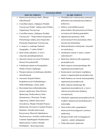 ANALIZA SWOT MOCNE STRONY SŁABE STRONY Intensywna promocja marki „Miasto Nieefektywnie wykorzystany potencjał Zakochanych” Certyfikat miasta „Najlepszy Produkt Turystyczny Polski” nadany przez Polską Organizację Turystyczną; Certyfikat miasta „Najlepszy Produkt Turystyczny” Województwa Kujawsko- położenia oraz potencjał przyrodniczokulturowy; Deficyt wykwalifikowanych pracowników dla priorytetowych branż rozwojowych lokalnej gospodarki; Ograniczona promocja i brak Pomorskiego nadany przez Kujawsko- nowoczesnych form prezentacji oferty Pomorską Organizację Turystyczną; turystyczno-kulturalnej; 6. miejsce w rankingu National Geographic „7 cudów Polski”; Duża liczba zabytków, w tym o znaczeniu ponadregionalnym; obecność miasta na Liście Pomników Historii Prezydenta RP; Lokalizacja miasta na Europejskim Szlaku Gotyku Ceglanego; Przeprowadzona rewitalizacja zabytków nieruchomych; otoczenie Zespołu Parków Krajobrazowych Chełmińskiego i Nadwiślańskiego, zieleń, parki; Rozwinięta baza infrastrukturalna Brak przełożenia walentynek i turystyki na rynek pracy; Zamknięcie miasta w marce „miasto zakochanych”; Brak bazy lokalowej dla organizacji pozarządowych; Brak wsparcia instytucjonalnego dla organizacji pozarządowych; Konieczność rozwinięcia współpracy miasta z organizacjami pozarządowymi; Brak funduszy na rozwój instytucjonalny organizacji pozarządowych; Brak wsparcia doradczego dla organizacji pozarządowych, w tym w pomocy społecznej- Dom Pomocy zakresie pozyskiwania funduszy Społecznej, Środowiskowy Dom zewnętrznych; Samopomocy, Warsztaty Terapii Zależność organizacji pozarządowych od Zajęciowej, Zakład Aktywności środków finansowych pochodzących z Zawodowej, Miejski Ośrodek Pomocy samorządu; Społecznej, Powiatowe Centrum Pomocy Duża liczba osób i gospodarstw Rodzinie- Ośrodek Interwencji domowych korzystających z pomocy Kryzysowej, Placówki Opiekuńczo- społecznej; Wychowawcze, świetlice środowiskowe, Centrum Zapobiegania Wykluczeniu Społecznemu, Caritas, Ośrodek Profilaktyki i Rozwiązywania Rosnąca liczba osób wymagających wsparcia , opieki, pielęgnacji; Niska aktywność społeczna; Problemów Uzależnień; Działający Bank Żywności; Działający sklep socjalny; Aktywność organizacji pozarządowych w sferze społecznej; System pomocy społecznej zbudowany na współpracy interdyscyplinarnej; Standaryzacja instytucji pomocowych; Potencjał do budowania srebrnej ekonomii/ gospodarki senioralnej; Potencjał do budowania szkolnictwa wyższego; Dobrze zdiagnozowana sytuacja w Niechęć do korzystania proponowanych ofert, programów pomocowych; Niska dostępność do pomocy psychologicznej i psychiatrycznej; Niski poziom dochodów; Pogłębiający się poziom ubóstwa; Niskie zainteresowanie działalnością społeczną i wolontariatem; Niski poziom wykształcenia osób bezrobotnych ; Ograniczony zasób mieszkań socjalnych i komunalnych; Niewystarczająca infrastruktura zakresie pomocy społecznej (badania i społeczna wobec aktualnej sytuacji i raporty); prognoz demograficznych; Uniwersytet III wieku; Kluby seniora; Złożoność i współistnienie problemów podopiecznych pomocy społecznej; Rada seniorów; Słaby kolportaż informacji w mieście Zwiększająca się liczba inicjatyw Brak dziennego domu spotkań dla społecznych; Kapitał do rozwoju ekonomii społecznej Duży potencjał w zakresie kapitału społecznego; Duża liczba firm rodzinnych; Duża aktywność przedsiębiorców; Dobrze rozwinięta branża meblarska; Duża liczba osób bezrobotnychpotencjał rynku pracy; dostępność komunikacyjna: bliskość dużych ośrodków pracy- Toruń, seniorów; Niski poziom i dostępność usług specjalistycznych przy jednoczesnym wzroście orzeczeń lekarskich (m.in. autyzm, Zespół Aspergera); Ograniczona wewnętrzna dostępność komunikacyjna- transport publiczny; Silna konkurencja wewnętrzna i małe doświadczenie we współpracy między przedsiębiorcami; Obecność obszarów wymagających Bydgoszcz i dostępność dróg krajowych rewitalizacji i restrukturyzacji, w tym oraz autostrady A1; infrastruktura powojskowa; Wsparcie instytucjonalne lokalnego Niski poziom rozwoju społeczeństwa rynku pracy: PUP, OHP, informacyjnego – w tym wykorzystanie Młodzieżowego Centrum Kariery nowoczesnych technologii; Niska dynamika i poziom ośrodek Europejskiego Centrum Współpracy Młodzieży. innowacyjności w zakresie integracji działań edukacyjnych z potrzebami rynku pracy i lokalnej gospodarki; Brak monitoringu ruchu turystycznego służącego do analiz i wzmocnienia kluczowej branży gospodarki lokalnej; Brak lokalnych tour-operatorów; Ograniczona oferta usług w zakresie opieki senioralnej w zestawieniu z trendami demograficznymi; Brak nowych atrakcyjnych terenów inwestycyjnych; Brak ośrodka inkubacji przedsiębiorczości; Brak atrakcyjnych ofert pracy dla osób z wyższym wykształceniem; Niska jakość szkolnictwa zawodowego; Brak ośrodka kursów praktycznychrównież dla dorosłych; Brak miejskiego programu promocyjnego - Chełmna miejsca lokalizacji inwestycji; Niewystarczająca baza dla turystyki zorganizowanej; SZANSE Wysokie walory turystyczne i przyrodnicze; Potencjał związany z obecnością obszarów przyrodniczych prawnie chronionych, w tym NATURA 2000; Wpis na Listę UNESCO; Niewielka odległość od miast metropolitalnych i subregionalnych Dobra lokalizacja w sieci dróg regionalnych, krajowych i autostrad; ZAGROŻENIA niekorzystna struktura demograficzna, w tym ujemne saldo przyrostu naturalnego i starzejące się społeczeństwo; lokalizacja strefy ochrony konserwatorskiej i Parku Krajobrazowego; krótki sezon turystyczny; Silna konkurencja większych ośrodków miejskich w regionie (ujemne saldo migracji); Rozwój sieci miast CITASLOW i Silna konkurencja większych ośrodków panująca moda na to zjawisko; miejskich w regionie (ujemne saldo Stworzenie sieci produktów 