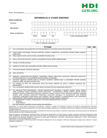 Numer wniosku/polisy:______________________ INFORMACJA O STANIE ZDROWIA Dane osobowe: Imiona: Nazwisko: Data urodzenia: dzień miesiąc rok numer ewidencyjny PESEL seria i nr dowodu osobistego PYTANIE TAK 1. Czy w przeszłości chorował/a Pan/i lub choruje obecnie na choroby wymienione poniżej: a) b) zawał mięśnia sercowego, choroba wieńcowa, arytmia, nadciśnienie, przewlekłe choroby układu krążenia, wady serca; stany zapalne nerek, kamica nerek, przewlekłe choroby nerek; c) astma, chroniczny bronchit, gruźlica, przewlekłe choroby układu oddechowego; d) cukrzyca, choroby tarczycy; e) zapalenie trzustki, jelit, przewlekłe choroby układu pokarmowego; f) nowotwory (guzy), chłoniaki, białaczka; g) udar, porażenie; h) padaczka, uzależnienie (od alkoholu, narkotyków, leków), zaburzenia nerwicowe, zaburzenia psychiczne, choroby psychiczne, inne przewlekłe choroby układu nerwowego; wirusowe zapalenie wątroby typu B, wirusowe zapalenie wątroby typu C, przewlekłe choroby wątroby, bolerioza, AIDS, zakażenie wirusem HIV; i) 2. Czy ubiegał się Pan/i lub otrzymywał rentę lub Pana/i zdolność do pracy w pełnym wymiarze jest ograniczona? 3. Czy w przeszłości palił(a) Pan(i) lub pali obecnie powyżej 50 sztuk papierosów dziennie? 4. Czy wykonuje Pan/i którykolwiek z poniżej wymienionych zawodów o wysokim stopniu ryzyka: bokser; cieśla; cyrkowiec; dekarz; detektyw; drwal; dziennikarz - korespondent; dżokej; elektryk; górnik; hutnik; kaskader; kierowca ciężarówek; kominiarz; marynarz; monter; murarz; nurek; ochroniarz; operator ciężkiego sprzętu; pilot; policjant; pracownik budowlany; pracownik pracujący: na wysokościach; przy budowie rusztowań; materiałach chemicznych; przy azbeście; żwirze; paliwach; w kamieniołomie; przy materiałach wybuchowych; rybak; spawacz; sportowiec zawodowy; strażak; tynkarz; wojskowy? Czy posiada Pan/i w naszym Towarzystwie inne polisy ubezpieczeniowe na życie: grupowe indywidualne Jeśli tak, prosimy o podanie numeru polisy lub certyfikatu. 5. NIE Oświadczam, że wyżej podane informacje są kompletne i zgodne z prawdą. W przypadku zatajenia lub podania nieprawdziwych informacji HDI-Gerling Życie Towarzystwo Ubezpieczeń SA może odmówić wypłaty świadczenia, na zasadach określonych w ogólnych warunkach ubezpieczenia i Kodeksie Cywilnym. Wyrażam zgodę na wykorzystanie moich danych osobowych do tworzenia bazy danych o klientach Towarzystwa, ich przetwarzania oraz dalszego ich wykorzystywania do celów ubezpieczeniowych. Wyrażam zgodę na udostępnienie HDI-Gerling Życie Towarzystwo Ubezpieczeń SA przez właściwe organy i Instytucje informacji dotyczących mojej osoby, niezbędnych do weryfikacji zgłoszonych roszczeń wobec Towarzystwa oraz na udostępnianie HDI-Gerling Życie Towarzystwo Ubezpieczeń SA przez lekarzy oraz placówki medyczne, w których się leczę bądź leczyłem/am, informacji i dokumentacji medycznych o moim stanie zdrowia, niezbędnych do realizacji zgłaszanych roszczeń. Jednocześnie upoważniam HDI-Gerling Życie Towarzystwo Ubezpieczeń SA do zasięgania informacji dotyczących mojego stanu zdrowia w innych zakładach ubezpieczeń. ______________________________________ miejscowość data _________________________________________________________ czytelny podpis osoby przystępującej do ubezpieczenia ZOR/UG/10.2008
