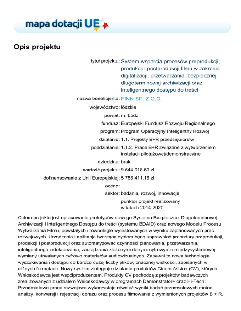 Opis projektu tytuł projektu: System wsparcia procesów preprodukcji, produkcji i postprodukcji filmu w zakresie digitalizacji, przetwarzania, bezpiecznej długoterminowej archiwizacji oraz inteligentnego dostępu do treści nazwa beneficjenta: FINN SP. Z O.O. województwo: łódzkie powiat: m. Łódź fundusz: Europejski Fundusz Rozwoju Regionalnego program: Program Operacyjny Inteligentny Rozwój działanie: 1.1. Projekty B+R przedsiębiorstw poddziałanie: 1.1.2. Prace B+R związane z wytworzeniem instalacji pilotażowej/demonstracyjnej dziedzina: brak wartość projektu: 9 644 018.60 zł dofinansowanie z Unii Europejskiej: 5 786 411.16 zł ocena: sektor: badania, rozwój, innowacje punktor projekt realizowany w latach 2014-2020 Celem projektu jest opracowanie prototypów nowego Systemu Bezpiecznej Długoterminowej Archiwizacji i Inteligentnego Dostępu do treści (systemu BDAID) oraz nowego Modelu Procesu Wytwarzania Filmu, powstałych i równolegle wytestowanych w wyniku zaplanowanych prac rozwojowych. Urządzenia i aplikacje tworzące system będą usprawniać procedury preprodukcji, produkcji i postprodukcji oraz automatyzować czynności planowania, przetwarzania, inteligentnego indeksowania, zarządzania złożonymi danymi cyfrowymi i międzysystemowej wymiany utrwalanych cyfrowo materiałów audiowizualnych. Zapewni to nowa technologia wyszukiwania i dostępu do bardzo dużej liczby plików, znacznej wielkości, zapisanych w różnych formatach. Nowy system zintegruje działanie produktów CinemaVision (CV), których Wnioskodawca jest współproducentem. Produkty CV pochodzą z projektów badawczych zrealizowanych z udziałem Wnioskodawcy w programach Demonstrator+ oraz Hi-Tech. Przedmiotowe prace rozwojowe wykorzystają również wyniki badań przemysłowych metod analizy, konwersji i rejestracji obrazu oraz procesu filmowania z wymienionych projektów B + R. Wnioskodawca dzięki temu uzyska przewagę nad konkurencją oraz działając w roli producenta lub koproducenta filmów, a także wytwórcy produktów BDAID/CV, rozszerzy i zdywersyfikuje swoją ofertę biznesową, odpowiadające na popyt: - rynku fabularnych filmów i reklam 3D zarejestrowanych w rozdzielczości co najmniej 4K, z dźwiękiem wielokanałowym min. 5.1, z wieloma efektami bazującymi na wysokim klatkażu (nawet do 1000 fps), - dynamicznie rozwijającego się europejskiego rynku filmów do kin i symulatorów z efektami 3/4/5/6D oraz gier komputerowych, a także narzędzi wspierających wytwarzanie filmów. Wyniki projektu mają duże szanse na sukces komercjalizacyjny wynikający z uzyskania innowacyjności, wszechstronności i efektywności nowego systemu oraz modelu procesu opartego o jego wykorzystanie posiadających możliwości dostosowywania do potrzeb specjalistycznych...