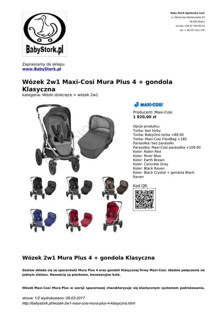 Baby Stork Agnieszka Lach ul. Obrońców Westerplatte 24 78-600 Wałcz tel./fax +48 67 258 90 24 tel. + 48 727 615 176 Zapraszamy do sklepu www.BabyStork.pl Wózek 2w1 Maxi-Cosi Mura Plus 4 + gondola Klasyczna kategoria: Wózki dziecięce > wózek 2w1 Producent: Maxi-Cosi 1 820,00 zł Opcje produktu: Torba: bez torby Torba: BabyOno torba +89.00 Torba: Maxi-Cosi FlexiBag +185 Parasolka: bez parasolki Parasolka: Maxi-Cosi parasolka +109.00 Kolor: Robin Red Kolor: River Blue Kolor: Earth Brown Kolor: Concrete Gray Kolor: Black Raven Kolor: Black Crystal + gondola Black Raven Kod QR: Wózek 2w1 Mura Plus 4 + gondola Klasyczna Zestaw składa się ze spacerówki Mura Plus 4 oraz gondoli Klasycznej firmy Maxi-Cosi. Idealne połączenie na jednym stelażu. Nowością są piankowe, bezawaryjne koła. Wózek Maxi-Cosi Mura Plus w wersji spacerowej charakteryzuje się elastycznym systemem podróżowania, strona: 1/2 wydrukowano: 08-03-2017 http://babystork.pl/wozek-2w1-maxi-cosi-mura-plus-4-klasyczna.html to przytulny wózek dla noworodka, który zamienia się w wygodny wózek dla dziecka do 3,5 lat. Posiada 6 pozycji położenia siedziska. Daszek w Mura Plus zapewnia całkowitą ochronę przed słońcem i deszczem. Odmieniony, bardziej funkcjonalny i jak zawsze solidny wózek głęboko-spacerowy Maxi Cosi Mura 4 Plus . Największa zmiana nastąpiła w spacerówce. W wersji Plus siedzisko jest inaczej wyprofilowane, jest szersze i przede wszystkim bardziej zabudowane, dzięki czemu lepiej chroni dziecko przed wiatrem. Nowa Mura to także nowe koła, odporne na przebicia. Dzięki zmianie adapterów na stelażu wózka montować możemy 2 rodzaje gondoli, a także 2 modele fotelików 0-13 kg firmy Maxi Cosi - Pebble i Cabriofix. Nowością jest również możliwość składania wózka wraz z siedziskiem spacerowym. Cechy produktu: Ochrona w każdych warunkach pogodowych dzięki ochronnemu daszkowi przeciwsłonecznemu i siedzisku Nie możliwe przebicie opony dzięki komfortowym kołom piankowych Elastyczny system jezdny z możliwocią wpinania fotelików samochodowych Maxi-Cosi dla noworodków oraz gondoli Wygodny wózek nadaje się od urodzenia do wieku przedszkolnego Mocna rama, dostępny jako 3 lub 4 kołowy Wykończenie : w tym duży daszek przeciwsłoneczny, pelerynka przeciwdeszczowa, koszyk na zakupy, klip do parasolki oraz adaptery do fotellików Maxi-Cosi - łatwy do przechowywania w domu lub w bagażniku samochodu Prosty i lekki Przodem i tyłem do kierunku jazdy siedzisko, zmieniane w ciągu kilku sekund Po 3 położenia siedziska przodem i tyłem do kierunku jazdy, możliwoć płaskiiegorozkładania do używania od urodzenia Komfortowe, miękkie i przestronne siedzisko Przednie koła skrętne, które można zablokować Regulowana wysokość szelek Kompatybilny ze wszystkimi fotelikami Maxi-Cosi , składana i przestronna gondola Foldable Maxi-Cosi sprawdza się podczas każdej podróży z niemowlęciem, za pomoą przesuwanego jedną ręką przycisku, składa się do małych wymiarów W opcji gama dostępnych akcesoriów: parasol, pokrowiec na nóżki, zabawki, torba i śpiworek: patrz zakładka "Akcesoria do wóżków". Instrukcja obsługi wózka Maxi-Cosi Mura Plus: Dane techniczne: waga spacerówki 16,6 kg wymiary rozłożonego wóżka: 106x 95-103,5x 65 cm wymiary złożonego wóżka: 107x 51x 65 cm wymiary siedziska: wys. 48,5, szer. 28,5 cm wymiary złożonego wózka: stelaż z kołami 78x 65x 31 cm stelaż bez kół 69x 55x 22 cm waga gondoli 4,6 kg wymiary rozłożonej gondoli: dł.90x wys.56 x szer.45 cm wymiary złżonej gondoli:: 90x 15,5x 45 cm strona: 2/2 wydrukowano: 08-03-2017 http://babystork.pl/wozek-2w1-maxi-cosi-mura-plus-4-klasyczna.html