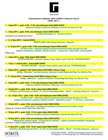 Kalendarium Oddziału BWA SOKÓŁ w Nowym Sączu LIPIEC 2011 r. • 2 lipca 2011 r., godz. 15.30 – 17.30, sala edukacyjna Galerii BWA SOKÓŁ cykliczne warsztaty artystyczne: Malarstwo i rysunek dla dzieci (6-12 lat) • 3 lipca 2011 r., godz. 15.00, sala edukacyjna, Galeria BWA SOKÓŁ warsztaty decoupage cz.3 - tworzenie biŜuterii prowadzenie: Ewa Grzegorczyk (Kraków) • 4 - 31 lipca 2011 r., Galeria SOKÓŁ ŚWIĘTO DZIECI GÓR. Michał Piotrowski - fotografia • 5 – 8 lipca 2011 r., godz. 12.00 - 14.00, sala edukacyjna Galeria BWA SOKÓŁ W rytmie sztuki - wakacyjne spotkania plastyczno-kulturoznawcze dla dzieci (6-12 lat) związane tematycznie z wystawą „Rytmika ćwiczeń”: „Oswój mnie”- Mały KsiąŜę i rytuał przyjaźni Wstęp wolny. • 7 lipca 2011 r., godz. 19.00, Galeria BWA SOKÓŁ RYTMIKA ĆWICZEŃ – wernisaŜ wystawy. Druga odsłona cyklu GALICJA. TOPOGRAFIE MITU • 7 lipca - 7 sierpnia 2011 r., Galeria BWA SOKÓŁ RYTMIKA ĆWICZEŃ – wystawa. Druga odsłona cyklu GALICJA. TOPOGRAFIE MITU • 8 lipca 2011 r., godzina 17.00, Galeria Sztuki JATKI BWA w Nowym Targu „Dialogi - Wakeripen”- wernisaŜ wystawy malarstwa i rzeźby Małgorzaty Mirga Tas i Marcina Tasa • 8 - 30 lipca 2011 r., Galeria Sztuki JATKI BWA w Nowym Targu „Dialogi - Wakeripen” - wystawa malarstwa i rzeźby Małgorzaty Mirga Tas i Marcina Tasa • 9 lipca 2011 r., godz. 15.30 – 17.30, sala edukacyjna Galerii BWA SOKÓŁ cykliczne warsztaty artystyczne: Malarstwo i rysunek dla dzieci (6-12 lat) • 10 lipca 2011 r., godz. 15.00 - 16.30, I piętro Galerii BWA SOKÓŁ niedzielny cykl edukacyjny dla dzieci: „Po nitce do kolorowego kłębka… Sztuki” - warsztaty plastyczno - muzyczne • 12 – 15 lipca 2011 r. godz. 12.00 - 14.00, sala edukacyjna Galerii BWA SOKÓŁ W rytmie sztuki - wakacyjne spotkania plastyczno-kulturoznawcze dla dzieci (6-12 lat) związane tematycznie z wystawą „Rytmika ćwiczeń”: „Mikołajek ma gości”– S. Gościnny i gościnność • 16 lipca 2011 r., godz. 14.00, sala edukacyjna Galerii BWA SOKÓŁ „Nowy rytuał”- warsztaty dla wszystkich zainteresowanych tematem rytuału prowadzenie: dr Mateusz Dąsal (Instytut Historii Nauki PAN) • 16 lipca 2011 r., godz. 15.30 – 17.30, I piętro Galerii BWA SOKÓŁ cykliczne warsztaty artystyczne: Malarstwo i rysunek dla dzieci (6-12 lat) • 16 lipca 2011 r., godz. 17.00, sala edukacyjna Galerii BWA SOKÓŁ „Współczesne świeckie rytuały - od olimpiady do rozmowy” - wykład o potrzebie wraŜliwości obrzędowej prowadzenie: dr Mateusz Dąsal (Instytut Historii Nauki PAN) • 17 lipca 2011 r., godz. 15.00 - 16.30, I piętro Galerii BWA SOKÓŁ niedzielny cykl edukacyjny dla dzieci: „Po nitce do kolorowego kłębka… Sztuki” - warsztaty plastyczno - muzyczne Galeria BWA SOKÓŁ – Oddział Małopolskiego Centrum Kultury SOKÓŁ ul. Długosza 3, 33-300 Nowy Sącz, tel. 18 534 06 60, www.bwasokol.pl • 19 lipca 2011 r., godz. 12.00 - 14.00, sala edukacyjna Galerii BWA SOKÓŁ „Architektura w chmurach” - warsztaty dla dzieci • 20 lipca 2011 r., godz. 12.00 - 14.00, sala edukacyjna Galerii BWA SOKÓŁ „Architektura w chmurach” - warsztaty dla dzieci (6-12 lat) Pan Tom buduje dom - projektowanie i budowanie domków dla ulubionych maskotek prowadzenie: Pracownia.k – Architektura + dzieci • 20 lipca 2011 r., godz. 15.00 – 17.00, sala edukacyjna Galerii BWA SOKÓŁ „Space – place” - wakacyjne warsztaty architektoniczne da młodzieŜy „Subiektywna mapa przestrzeni” prowadzenie: Pracownia.k – Architektura + dzieci • 21 lipca 2011 r., godz. 12.00 - 14.00, sala edukacyjna Galerii BWA SOKÓŁ „Tajemniczy ogród” - warsztaty dla dzieci nawiązujące do sztuki Ziemi prowadzenie: Pracownia.k – Architektura + dzieci • 21 lipca 2011 r., godz. 15.00 – 17.00, sala edukacyjna Galerii BWA SOKÓŁ „Space – place” - wakacyjne warsztaty architektoniczne da młodzieŜy „Oswajacze przestrzeni” prowadzenie: Pracownia.k – Architektura + dzieci • 22 lipca 2011 r., godz. 12.00 - 14.00, sala edukacyjna Galerii BWA SOKÓŁ „Kapuśniaczek”- projektowanie przedmiotu chroniącego przed deszczem - warsztaty dla dzieci prowadzenie: Pracownia.k – Architektura + dzieci • 22 lipca 2011 r., godz. 15.00 – 17.00, sala edukacyjna Galerii BWA SOKÓŁ „Space – place” - wakacyjne warsztaty architektoniczne da młodzieŜy „Łatwiejsze ulice” prowadzenie: Pracownia.k – Architektura + dzieci • 23 lipca 2011 r., godz. 15.30 – 17.30, sala edukacyjna Galerii BWA SOKÓŁ cykliczne warsztaty artystyczne: Malarstwo i rysunek dla dzieci (6-12 lat) • 24 lipca 2011 r., godz. 15.00 - 16.30, I piętro Galerii BWA SOKÓŁ niedzielny cykl edukacyjny dla dzieci: „Po nitce do kolorowego kłębka… Sztuki” - warsztaty plastyczno - muzyczne • 25 - 30 lipca 2011 r., godz. 12.00 - 14.00, sala edukacyjna Galerii BWA SOKÓŁ „Tańczące góry” - zajęcia plastyczne dla dzieci towarzyszące XIX Festiwalowi ŚWIĘTO DZIECI GÓR • 25 – 31 lipca 2011 r., godz. 18.00 - 19.00, Hala Sportowa w Nowym Sączu, ul. NadbrzeŜna „Zostaw swój radosny ślad!” – plastyczna akcja plenerowa dla dzieci i rodziców towarzysząca XIX Festiwalowi ŚWIĘTO DZIECI GÓR • 31 lipca 2011 r., godz. 12.00, Galeria SOKÓŁ Święto Dzieci Gór. Michał Piotrowski - fotografia - finisaŜ wystawy • 31 lipca 2011 r., godz. 15.00 - 16.30, I piętro Galerii BWA SOKÓŁ niedzielny cykl edukacyjny dla dzieci: „Po nitce do kolorowego kłębka… Sztuki” - warsztaty plastyczno - muzyczne Galeria BWA SOKÓŁ – Oddział Małopolskiego Centrum Kultury SOKÓŁ ul. Długosza 3, 33-300 Nowy Sącz, tel. 18 534 06 60, www.bwasokol.pl