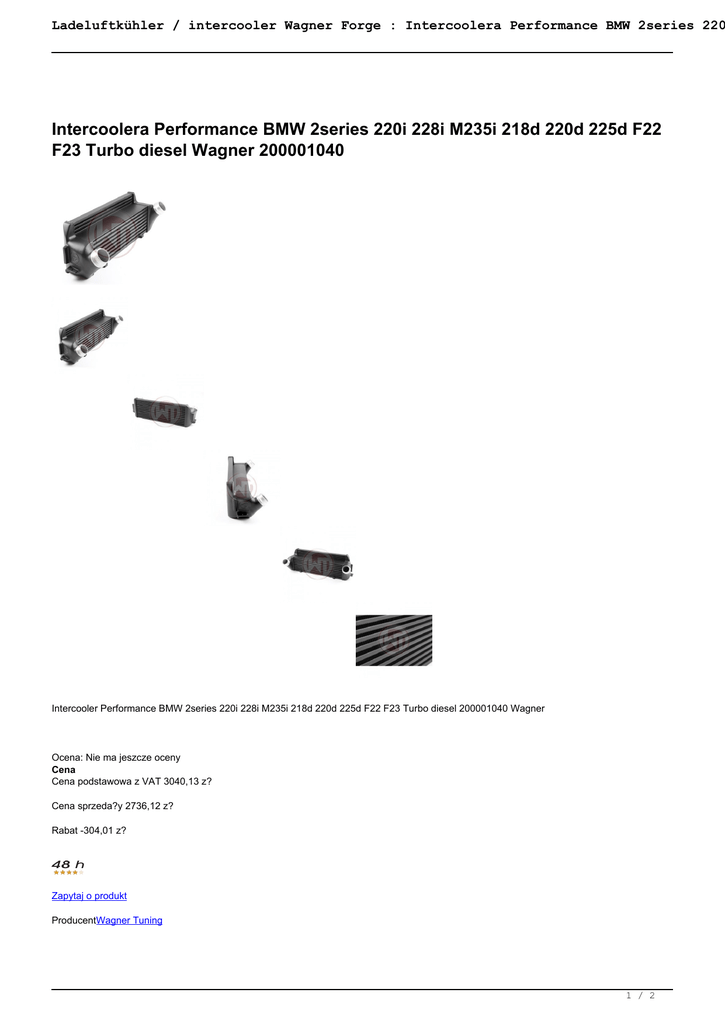 Ladeluftkühler / intercooler Wagner Forge : Intercoolera Performance BMW 2series 220 Intercoolera Performance BMW 2series 220i 228i M235i 218d 220d 225d F22 F23 Turbo diesel Wagner 200001040 Intercooler Performance BMW 2series 220i 228i M235i 218d 220d 225d F22 F23 Turbo diesel 200001040 Wagner Ocena: Nie ma jeszcze oceny Cena Cena podstawowa z VAT 3040,13 z? Cena sprzeda?y 2736,12 z? Rabat -304,01 z? Zapytaj o produkt ProducentWagner Tuning 1 / 2 Ladeluftkühler / intercooler Wagner Forge : Intercoolera Performance BMW 2series 220 Opis Stepped High Performance Intercooler Core. Size 520 x 210 x130, 11.752cm³ Volume (OEM 510x130x110mm, 7293cm³ Volume). Approx. 85% bigger surface over OEM IC. CAD / FEM optimized Aluminum Cast Endtanks. Plug & Play Installation using the stock plumming, no cutting or bumper removal required. Weight 8,8kg Including TÜV certificate! The BMW EVO I Performance Intercooler-Kit from Wagner Tuning fits plug and play to: • BMW 114i F20 / F21 75KW/102PS (2012+) • BMW 116i F20 / F21 100KW/136PS (2011+) • BMW 118i F20 / F21 125KW/170PS (2011+) • BMW 125i F20 / F21 160KW/218PS (2012+) • BMW M135i(x) F20 / F21 235KW/320PS (2011+) • BMW 114d F20 / F21 70KW/95PS (2012+) • BMW 116d F20 / F21 85KW/116PS (2011+) • BMW 118d(x) F20 / F21 105KW/143PS (2011+) • BMW 120d(x) F20 / F21 135KW/184PS (2011+) • BMW 125d F20 / F21 160KW/218PS (2012+) • BMW 220i F22 / F23 135KW/184PS (2014+) • BMW 228i(x) F22 / F23 180KW/245PS (2014+) • BMW M235i(x) F22/F23 240KW/326PS (2014+) • BMW 218d F22 / F23 103KW/143PS (2014+) • BMW 220d(x) F22 / F23 135KW/184PS (2014+) • BMW 225d F22 / F23 160KW/218PS (2014+) • BMW 316i F30 / F31 / F34 100KW/136PS (2011+) • BMW 320i(x) F30 / F31 / F34 135KW/184PS (2011+) • BMW 328i(x) F30 / F31 / F34 180KW/245PS (2011+) • BMW 335i(x) F30 / F31 / F34 235KW/320PS (2011+) • BMW 316d F30 / F31 / F34 85KW/116PS (2012+) • BMW 318d(x) F30 / F31 / F34 105KW/143PS (2012+) • BMW 320d(x) F30 / F31 / F34 135KW/184PS (2011+) • BMW 325d F30 / F31 / F34 160KW/218PS (2013+) • BMW 330d(x) F30 / F31 / F34 190KW/258PS (2012+) • BMW 335d(x) F30 / F31 / F34 230KW/313PS (2013+) • BMW 420i(x) F32 / F33 / F36 135KW/184PS (2013+) • BMW 428i(x) F32 / F33 / F36 180KW/245PS (2013+) • BMW 435i(x) F32 / F33 / F36 225KW/306PS (2013+) • BMW 420d(x) F32 / F33 / F36 135KW/184PS (2013+) • BMW 425d F32 / F33 / F36 160KW/218PS (2014+) • BMW 430d(x) F32 / F33 / F36 190KW/258PS (2013+) • BMW 435d(x) F32 / F33 / F36 230KW/313PS (2013+) Packing List: 1 Intercooler 1 Mounting material 1 Installation instruction 1 TÜV certificate 2 / 2 Powered by TCPDF (www.tcpdf.org)