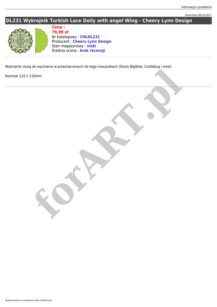 Informacje o produkcie Utworzono 08-03-2017 DL231 Wykrojnik Turkish Lace Doily with angel Wing - Cheery Lynn Design Cena : 79,99 zł Nr katalogowy : CHLDL231 Producent : Cheery Lynn Design Stan magazynowy : niski Średnia ocena : brak recenzji Wykrojniki służą do wycinania w przeznaczonych do tego maszynkach (Sizzix BigShot, Cuttlebug i inne). fo rA R T. pl Rozmiar 110 x 110mm Wygenerowano w programie www.oscGold.com