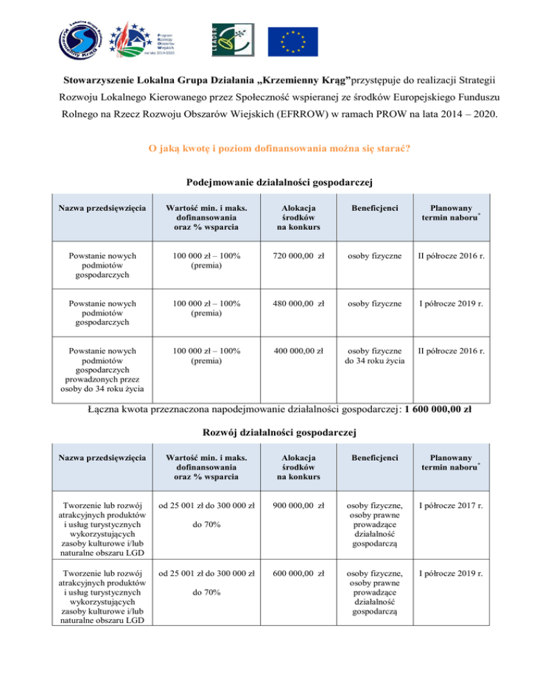 Stowarzyszenie Lokalna Grupa Działania „Krzemienny Krąg”przystępuje do realizacji Strategii Rozwoju Lokalnego Kierowanego przez Społeczność wspieranej ze środków Europejskiego Funduszu Rolnego na Rzecz Rozwoju Obszarów Wiejskich (EFRROW) w ramach PROW na lata 2014 – 2020. O jaką kwotę i poziom dofinansowania można się starać? Podejmowanie działalności gospodarczej Nazwa przedsięwzięcia Wartość min. i maks. dofinansowania oraz % wsparcia Alokacja środków na konkurs Beneficjenci Planowany termin naboru* Powstanie nowych podmiotów gospodarczych 100 000 zł – 100% (premia) 720 000,00 zł osoby fizyczne II półrocze 2016 r. Powstanie nowych podmiotów gospodarczych 100 000 zł – 100% (premia) 480 000,00 zł osoby fizyczne I półrocze 2019 r. Powstanie nowych podmiotów gospodarczych prowadzonych przez osoby do 34 roku życia 100 000 zł – 100% (premia) 400 000,00 zł osoby fizyczne do 34 roku życia II półrocze 2016 r. Łączna kwota przeznaczona napodejmowanie działalności gospodarczej: 1 600 000,00 zł Rozwój działalności gospodarczej Nazwa przedsięwzięcia Wartość min. i maks. dofinansowania oraz % wsparcia Alokacja środków na konkurs Beneficjenci Planowany termin naboru* Tworzenie lub rozwój atrakcyjnych produktów i usług turystycznych wykorzystujących zasoby kulturowe i/lub naturalne obszaru LGD od 25 001 zł do 300 000 zł 900 000,00 zł osoby fizyczne, osoby prawne prowadzące działalność gospodarczą I półrocze 2017 r. Tworzenie lub rozwój atrakcyjnych produktów i usług turystycznych wykorzystujących zasoby kulturowe i/lub naturalne obszaru LGD od 25 001 zł do 300 000 zł 600 000,00 zł osoby fizyczne, osoby prawne prowadzące działalność gospodarczą I półrocze 2019 r. do 70% do 70% Rozwój działalności gospodarczej od 50 000 zł do 200 000 zł 900 000 zł I półrocze 2019 r. do 70% Łączna kwota przeznaczona na rozwój działalności gospodarczej: 2 400 000,00 zł Rozwój infrastruktury Budowa lub przebudowa ogólnodostępnej i niekomercyjnej infrastruktury turystycznej lub rekreacyjnej lub kulturalnej do obsługi co najmniej 2 000 osób rocznie Nazwa przedsięwzięcia Wartość min. i maks. dofinansowania oraz % wsparcia Alokacja środków na konkurs Beneficjenci Planowany termin naboru* Niekomercyjna infrastruktura turystyczna, rekreacyjna i/lub kulturowa wykorzystująca zasoby kulturowe i/lub naturalne i/lub historyczne i/lub obyczajowe obszaru LGD od 50 000 zł do 200 000 zł 1 700 000,00 zł osoby fizyczne, osoby prawne I półrocze 2017 r. 63,63% dla JSFP, do 70% dla prowadzących działalność gospodarczą, do 80% dla innych Łączna kwota przeznaczona na rozwój infrastruktury: 1 700 000,00 zł Projekty grantowe Przykładowe działania:konferencje, szkolenia, warsztaty, festyny, akcje społeczne,promowanie obszaru, produktów, usług lokalnych,wzmocnienie kapitału społecznego,zachowanie dziedzictwa lokalnego Nazwa przedsięwzięcia Wartość min. i maks. dofinansowania oraz % wsparcia Alokacja środków na konkurs Beneficjenci Planowany termin naboru* Wykorzystanie do rozwoju turystyki zasobów dziedzictwa lokalnego, kulturowego i/lub naturalnego obszaru LGD od 5 000 zł do 45 000 zł 300 000,00 zł Osoby fizyczne, osoby prawne z wyłączeniem prowadzących działalność gospodarczą oraz JSFP I półrocze 2017 r. Wydarzenia propagujące zdrowy styl życia od 15 000 zł do 30 000 zł 300 000,00 zł Osoby fizyczne, osoby prawne z wyłączeniem prowadzących działalność II półrocze 2019 r. do 90% do 90% gospodarczą oraz JSFP Inicjatywy grup mieszkańców na rzez rozwoju obszaru LGD od 5 000 zł do 25 000 zł Wzmocnienie potencjału organizacji pozarządowych od 5 000 zł do 25 000 zł Stworzenie i/lub rozwój produktów lokalnych od 10 000 zł do 45 000 zł 300 000,00 zł Osoby fizyczne, osoby prawne z wyłączeniem prowadzących działalność gospodarczą oraz JSFP I półrocze 2019 r. 300 000,00 zł Osoby fizyczne, osoby prawne z wyłączeniem prowadzących działalność gospodarczą oraz JSFP I półrocze 2019 r. 300 000,00 zł Osoby fizyczne, osoby prawne z wyłączeniem prowadzących działalność gospodarczą oraz JSFP II półrocze 2017 r. do 90% do 100% do 90% Łączna kwota przeznaczona na projekty grantowe: 1 500 000,00 zł * Planowany terminy naboru wniosków może ulec zmianie Stowarzyszenie Lokalna Grupa Działania „Krzemienny Krąg” 27-423 Bałtów 55 tel./fax (41) 252-72-33 e-mail: [email protected] www.krzemiennykrag.info “Europejski Fundusz Rolny na rzecz Rozwoju Obszarów Wiejskich: Europa inwestująca w obszary wiejskie”, Instytucja Zarządzająca PROW 2014-2020 – Minister Rolnictwa i Rozwoju Wsi. Ulotka opracowana przez Stowarzyszenie LGD „Krzemienny Krąg”, współfinansowana jest ze środków Unii Europejskiej w ramach działania „Wsparcie dla rozwoju lokalnego w ramach inicjatywy LEADER” Programu Rozwoju Obszarów Wiejskich 2014-2020.