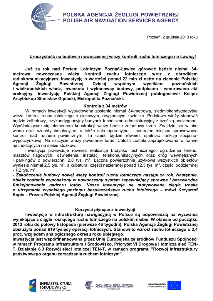 POLSKA AGENCJA ŻEGLUGI POWIETRZNEJ POLISH AIR NAVIGATION SERVICES AGENCY Poznań, 2 grudnia 2013 roku Uroczystość na budowie nowoczesnej wieży kontroli ruchu lotniczego na Ławicy! Już za rok nad Portem Lotniczym Poznań-Ławica górować będzie niemal 34metrowa nowoczesna wieża kontroli ruchu lotniczego wraz z ośrodkiem radiokomunikacyjnym. Inwestycję o wartości ponad 22 mln zł netto na zlecenie Polskiej Agencji Żeglugi Powietrznej. Dzisiaj wspólnym wysiłkiem poznańskich i wielkopolskich władz, inwestora i wykonawcy budowy, podpisano i wmurowano akt erekcyjny. Inwestycję Polskiej Agencji Żeglugi Powietrznej pobłogosławił Ksiądz Arcybiskup Stanisław Gądecki, Metropolita Poznański. Kontrola z 34 metrów W ramach inwestycji wybudowana zostanie niemal 34-metrowa, siedmiokondygnacyjna wieża kontroli ruchu lotniczego o ciekawym, oryginalnym kształcie. Podstawę wieży stanowić będzie żelbetowy, trzykondygnacyjny budynek techniczno-administracyjny z częścią podziemną. Wyróżniającym się elementem konstrukcji wieży będzie żelbetowy trzon. Znajdzie się w nim winda oraz szachty instalacyjne, a także sala operacyjna – centralne miejsce sprawowania kontroli nad ruchem powietrznym. Ta część będzie również spełniać funkcję socjalnowypoczynkową. Na szczycie wieży powstanie taras. Całość została zaprojektowana w formie nachodzących na siebie stożków. Inwestycja przewiduje również realizację budynku technicznego, ogrodzenia terenu, masztów flagowych, oświetlenia, instalacji telekomunikacyjnych oraz dróg wewnętrznych i parkingów o powierzchni 2,8 tys. m². Łączna powierzchnia użytkowa wszystkich obiektów wyniesie niemal 2,5 tys. m², a kubatura: części naziemnej ponad 12,5 tys. m³, części podziemnej - 1,2 tys. m³. - Zakończenie budowy nowej wieży kontroli ruchu lotniczego nastąpi za rok. Następnie, obiekt zostanie wyposażony w nowoczesny system zapewniający sprawne i bezawaryjne funkcjonowanie nadzoru lotów. Nasze inwestycje są motywowane ciągłą troską o utrzymanie wysokiego poziomu bezpieczeństwa ruchu lotniczego – mówi Krzysztof Kapis – Prezes Polskiej Agencji Żeglugi Powietrznej. Korzyści płynące z inwestycji Inwestycje w infrastrukturę nawigacyjną w Polsce są odpowiedzią na wyzwania wynikające z ciągle rosnącego ruchu lotniczego na polskim niebie. W okresie od początku 2013 roku do połowy listopada (pierwsze 46 tygodni), Polska Agencja Żeglugi Powietrznej obsłużyła ponad 619 tysięcy operacji lotniczych. Stanowi to wzrost ruchu lotniczego o 2,4 proc. względem analogicznego okresu roku ubiegłego. Inwestycja jest współfinansowana przez Unię Europejską ze środków Funduszu Spójności w ramach Programu Infrastruktura i Środowisko, Priorytet VI Drogowa i lotnicza sieć TENT, Działanie 6.3 Rozwój sieci lotniczej TEN-T, w ramach programu "Rozwój infrastruktury państwowego organu zarządzania ruchem lotniczym". POLSKA AGENCJA ŻEGLUGI POWIETRZNEJ POLISH AIR NAVIGATION SERVICES AGENCY Wdrożenie programu „Rozwój infrastruktury państwowego organu zarządzania ruchem lotniczym” będzie miało znaczący wpływ na modernizację infrastruktury nawigacyjnej w Polsce. Inwestycje wchodzące w skład programu "Rozwój infrastruktury państwowego organu zarządzania ruchem lotniczym" , zostały przeanalizowane przez EUROCONTROL pod kątem ich zgodności z Single European Sky („SES”). Po przeglądzie inwestycji, EUROCONTROL uznała, że są to inwestycje właściwe i zgodne z celami Single European Sky („SES”) oraz „Planem implementacji SES dla Polski”. Korzyści płynące z budowy nowej poznańskiej wieży kontroli ruchu lotniczego wraz z ośrodkiem radiokomunikacyjnym będą miały charakter długofalowy, obejmując wszystkich interesariuszy polskiego sektora lotniczego (w szczególności linie lotnicze oraz pasażerów). Poznańska inwestycja podniesienie bezpieczeństwo ruchu lotniczego, ruchu okołolotniskowego oraz ruchu naziemnego na Ławicy. Istotnym elementem tej inwestycji jest nowy ośrodek radiokomunikacyjny, który będzie zapewniać utrzymanie kontaktu między samolotami a kontrolą naziemną. - Decyzja Polskiej Agencji Żeglugi Powietrznej wpisuje się w infrastrukturalny rozwój poznańskiego lotniska. Budowa nowoczesnego ośrodka kontroli ruchu to najlepsze uzupełnienie zrealizowanych tu ostatnio inwestycji. Rozbudowane powierzchnie lotniskowe oraz terminal, a wkrótce nowa wieża, ugruntowują pozycję Ławicy jako w pełni zmodernizowanego, europejskiego portu lotniczego. Wyrażamy ogromne zadowolenie ze współpracy z Polską Agencją Żeglugi Powietrznej, nieustannie podejmującej działania zapewniające jak najwyższy poziom bezpieczeństwa ruchu lotniczego – mówi Mariusz Wiatrowski, Prezes Zarządu Portu Lotniczego Poznań-Ławica. Postęp prac W ramach inwestycji realizowane są dwa obiekty: budynek główny, którego najwyższą częścią będzie wieża oraz budynek techniczny. Do tej pory wykonane zostały roboty ziemne – wykopy, fundamenty, a także żelbetowomurowana konstrukcja ścian budynku technicznego, żelbetowe ściany piwnic i stropy nad piwnicami oraz znaczna część żelbetowych ścian parteru w budynku głównym. - Do końca roku planujemy wykonać konstrukcję żelbetową do poziomu pierwszego piętra w budynku głównym, a w budynku technicznym zakończyć konstrukcję obiektu – mówi Jerzy Tykociński, Menadżer Projektu, Skanska – Prace przebiegają zgodnie z harmonogramem. Przed nami okres zimowy, który może przysporzyć trudności, jednakże jesteśmy przygotowani na różne okoliczności i dołożymy wszelkich starań, by planowany tok prac nie został naruszony. Realizację inwestycji zakończymy za rok – w grudniu 2014 roku. Wyzwania Obiekt został zaprojektowany w konstrukcji żelbetowej, monolitycznej. – Dużym wyzwaniem, które jeszcze przed nami, będzie wykonanie 34-metrowej wieży – mówi Zbyszko Kapło