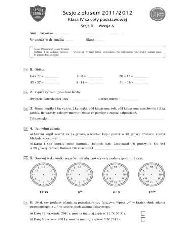 Sesje z plusem 2011/2012 Klasa IV szkoły podstawowej Sesja 1 Imię i nazwisko Wersja A .................................................................................. Nr ucznia w dzienniku Klasa .......... .......... Droga Uczennico! Drogi Uczniu! Zadanie 8 to zadanie testowe — wystarczy wybrać jedną odpowiedź. Na wykonanie wszystkich zadań masz 40 minut. Powodzenia! 1. Oblicz. 14 + 22 = .................. 7·8= 35 + 57 = .................. 3 · 14 = .................. 28 − 12 = .................. 51 − 18 = .................. .................. 2. Zapisz cyframi poniższe liczby. dwieście czterdzieści trzy – .................... pięćset osiem – .................... 3. Mama kupiła 1 kg cukru, 2 kg mąki, pół kilograma soli, pół kilograma marchewki i 2 kg jabłek. Ile ważyły zakupy mamy? Oblicz w pamięci i zapisz odpowiedź. Odpowiedź: ......................................................................................................................................... 4. Uzupełnij zdania. a) Marcin kupił zeszyt za 55 groszy, a Michał kupił zeszyt o 10 groszy droższy. Zeszyt Michała kosztował .............................................. . b) Kasia i Ola kupiły sobie batoniki. Batonik Kasi kosztował 78 groszy, a Oli był o 20 groszy tańszy. Batonik Oli kosztował .............................................. . 5. Dorysuj wskazówki zegarów, tak aby pokazywały podany pod nimi czas. 17:55 830 6:10 1500 6. Ustal, czy podane zdania są prawdziwe czy fałszywe. Wpisz „+” w kratce obok zdania prawdziwego, a „–” w kratce obok zdania fałszywego. a) Datę 12 września 2010 r. można inaczej zapisać 12 IX 2010 r. b) Datę 5 czerwca 2011 r. można inaczej zapisać 5 IV 2011 r. 7. 9 maja tego roku wypadł w poniedziałek. Obok podanych niżej dat dopisz, jaki był to w tym roku dzień tygodnia. 5 maja – 23 maja – ......................................... ......................................... 8. Przyjęcie urodzinowe Kasi rozpoczęło się o godzinie 1200 w południe, a skończyło o godzinie piątej po południu. Ile godzin trwało przyjęcie? A. 7 godzin B. 5 godzin C. 4 godziny D. 3 godziny 9. Na przyjęcie urodzinowe Kasi mama kupiła 32 cukierki. Kasia każdemu ze swoich sześciu gości dała po cztery cukierki, a resztę zostawiła sobie. Ile cukierków zostało Kasi? ................................................................................................................................................................ ................................................................................................................................................................ Odpowiedź: ......................................................................................................................................... 10. Zmierz długości boków narysowanych figur, a następnie oblicz ich obwody. Zapisz obliczenia. a) b) ............................................................................. ............................................................................. ............................................................................. ............................................................................. Obwód = Obwód = ............................................................ ............................................................ Zadanie dodatkowe Po placu spacerowało stado gołębi. Nagle 7 z nich odfrunęło, ale po chwili 3 wróciły. Teraz jest ich 21. Ile gołębi było początkowo na placu? ................................................................................................................................................................ ................................................................................................................................................................ Odpowiedź: ......................................................................................................................................... Klasa IV, sesja 1, wersja A Sesje z plusem 2011/2012 Klasa IV szkoły podstawowej Sesja 1 Imię i nazwisko Wersja B .................................................................................. Nr ucznia w dzienniku Klasa .......... .......... Droga Uczennico! Drogi Uczniu! Zadanie 8 to zadanie testowe — wystarczy wybrać jedną odpowiedź. Na wykonanie wszystkich zadań masz 40 minut. Powodzenia! 1. Oblicz. 24 + 12 = .................. 7·9= 48 + 37 = .................. 4 · 13 = .................. 39 − 14 = .................. 63 − 17 = .................. .................. 2. Zapisz cyframi poniższe liczby. trzysta dwadzieścia cztery – .................... siedemset osiem – .................... 3. Mama kupiła 1 kg gruszek, 3 kg jabłek, pół kilograma mandarynek, pół kilograma marchewki i 2 kg ziemniaków. Ile ważyły zakupy mamy? Oblicz w pamięci i zapisz odpowiedź. Odpowiedź: ......................................................................................................................................... 4. Uzupełnij zdania. a) Kasia kupiła zeszyt za 55 groszy, a Ola kupiła zeszyt o 10 groszy tańszy. Zeszyt Oli kosztował .............................................. . b) Marcin i Michał kupili sobie batoniki. Batonik Marcina kosztował 78 groszy, a Michała był o 20 groszy droższy. Batonik Michała kosztował .............................................. . 5. Dorysuj wskazówki zegarów, tak aby pokazywały podany pod nimi czas. 7:45 1730 6:20 2130 6. Ustal, czy podane zdania są prawdziwe czy fałszywe. Wpisz „+” w kratce obok zdania prawdziwego, a „–” w kratce obok zdania fałszywego. a) Datę 12 kwietnia 2010 r. można inaczej zapisać 12 VI 2010 r. b) Datę 5 października 2011 r. można inaczej zapisać 5 X 2011 r. 7. 7 sierpnia tego roku wypadł w niedzielę. Obok podanych niżej dat dopisz, jaki był to w tym roku dzień tygodnia. 4 sierpnia – ...................