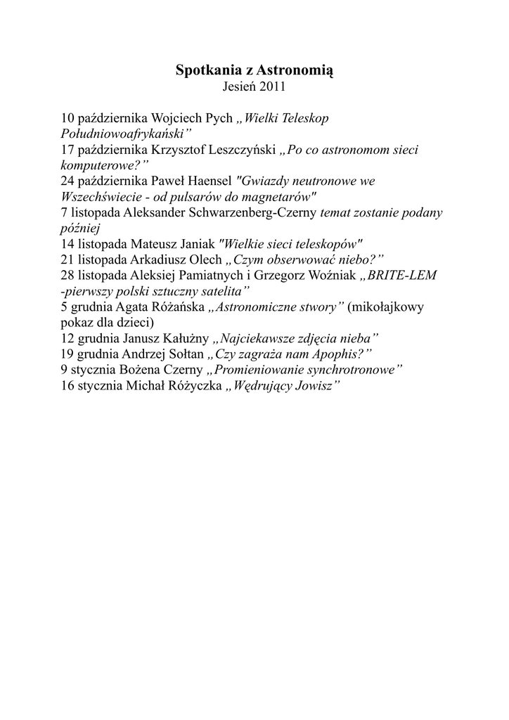 Spotkania z Astronomią Jesień 2011 10 października Wojciech Pych „Wielki Teleskop Południowoafrykański” 17 października Krzysztof Leszczyński „Po co astronomom sieci komputerowe?” 24 października Paweł Haensel "Gwiazdy neutronowe we Wszechświecie - od pulsarów do magnetarów" 7 listopada Aleksander Schwarzenberg-Czerny temat zostanie podany później 14 listopada Mateusz Janiak "Wielkie sieci teleskopów" 21 listopada Arkadiusz Olech „Czym obserwować niebo?” 28 listopada Aleksiej Pamiatnych i Grzegorz Woźniak „BRITE-LEM -pierwszy polski sztuczny satelita” 5 grudnia Agata Różańska „Astronomiczne stwory” (mikołajkowy pokaz dla dzieci) 12 grudnia Janusz Kałużny „Najciekawsze zdjęcia nieba” 19 grudnia Andrzej Sołtan „Czy zagraża nam Apophis?” 9 stycznia Bożena Czerny „Promieniowanie synchrotronowe” 16 stycznia Michał Różyczka „Wędrujący Jowisz”