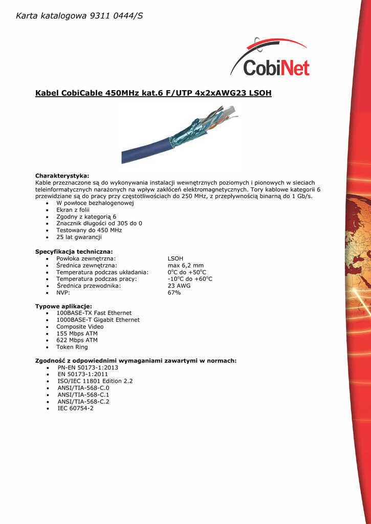 Karta katalogowa 9311 0444/S Kabel CobiCable 450MHz kat.6 F/UTP 4x2xAWG23 LSOH Charakterystyka: Kable przeznaczone są do wykonywania instalacji wewnętrznych poziomych i pionowych w sieciach teleinformatycznych narażonych na wpływ zakłóceń elektromagnetycznych. Tory kablowe kategorii 6 przewidziane są do pracy przy częstotliwościach do 250 MHz, z przepływnością binarną do 1 Gb/s. W powłoce bezhalogenowej Ekran z folii Zgodny z kategorią 6 Znacznik długości od 305 do 0 Testowany do 450 MHz 25 lat gwarancji Specyfikacja techniczna: Powłoka zewnętrzna: Średnica zewnętrzna: Temperatura podczas układania: Temperatura podczas pracy: Średnica przewodnika: NVP: LSOH max 6,2 mm 0oC do +50oC -10oC do +60oC 23 AWG 67% Typowe aplikacje: 100BASE-TX Fast Ethernet 1000BASE-T Gigabit Ethernet Composite Video 155 Mbps ATM 622 Mbps ATM Token Ring Zgodność z odpowiednimi wymaganiami zawartymi w normach: PN-EN 50173-1:2013 EN 50173-1:2011 ISO/IEC 11801 Edition 2.2 ANSI/TIA-568-C.0 ANSI/TIA-568-C.1 ANSI/TIA-568-C.2 IEC 60754-2