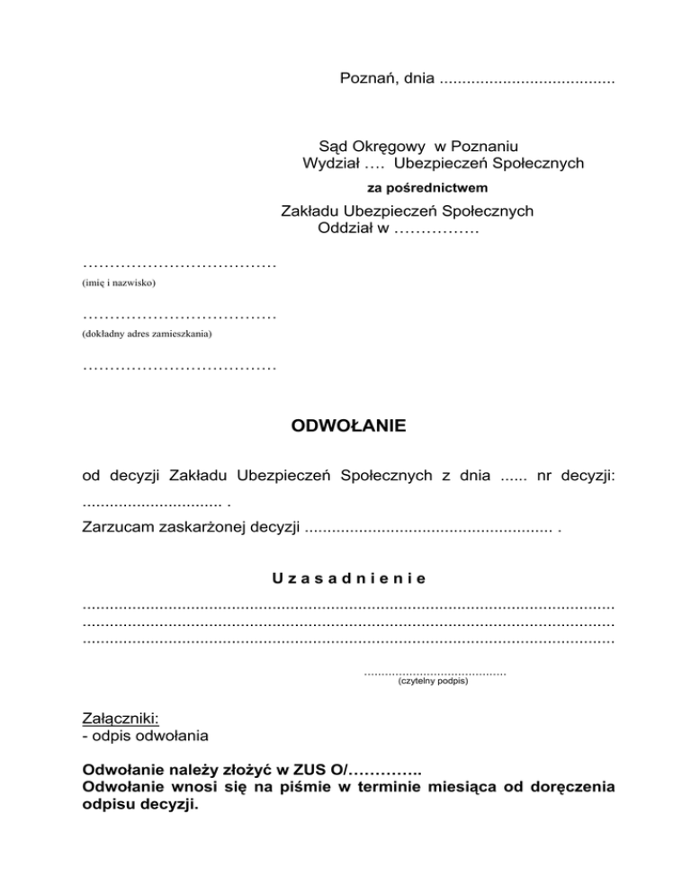 Poznań, dnia ....................................... Sąd Okręgowy w Poznaniu Wydział …. Ubezpieczeń Społecznych za pośrednictwem Zakładu Ubezpieczeń Społecznych Oddział w ……………. ……………………………… (imię i nazwisko) ……………………………… (dokładny adres zamieszkania) ……………………………… ODWOŁANIE od decyzji Zakładu Ubezpieczeń Społecznych z dnia ...... nr decyzji: ............................... . Zarzucam zaskarżonej decyzji ....................................................... . Uzasadnienie ...................................................................................................................... ...................................................................................................................... ...................................................................................................................... ......................................... (czytelny podpis) Załączniki: - odpis odwołania Odwołanie należy złożyć w ZUS O/………….. Odwołanie wnosi się na piśmie w terminie miesiąca od doręczenia odpisu decyzji.