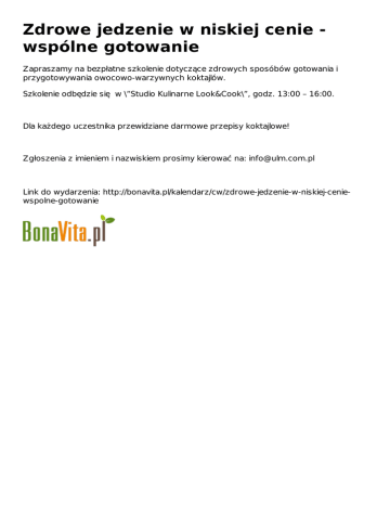 Zdrowe jedzenie w niskiej cenie wspólne gotowanie Zapraszamy na bezpłatne szkolenie dotyczące zdrowych sposóbów gotowania i przygotowywania owocowo-warzywnych koktajlów. Szkolenie odbędzie się w \”Studio Kulinarne Look&Cook\”, godz. 13:00 – 16:00. Dla każdego uczestnika przewidziane darmowe przepisy koktajlowe! Zgłoszenia z imieniem i nazwiskiem prosimy kierować na: [email protected] Link do wydarzenia: http://bonavita.pl/kalendarz/cw/zdrowe-jedzenie-w-niskiej-ceniewspolne-gotowanie