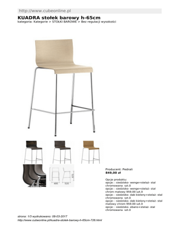 http://www.cubeonline.pl KUADRA stołek barowy h-65cm kategoria: Kategorie > STOŁKI BAROWE > Bez regulacji wysokości Producent: Pedrali 849,00 zł strona: 1/3 wydrukowano: 08-03-2017 http://www.cubeonline.pl/kuadra-stolek-barowy-h-65cm-726.html Opcje produktu: opcje: : siedzisko- wenge+stelaż- stal chromowana szt.0 opcje: : siedzisko- wenge+stelaż- stal chrom matowy 959.00 szt.0 opcje: : siedzisko- dab bielony+stelaż- stal chromowana szt.0 opcje: : siedzisko- dab bielony+stelaż- stal matowy chrom 959.00 szt.0 opcje: : siedzisko- ebano+stelaż- stal chromowana szt.0 opcje: : siedzisko- ebano+stelaż- stal chrom matowy 959.00 szt.0 opcje: : siedzisko- zebrano+stelaż- stal chromowana szt.0 opcje: : siedzisko- zebrano+stelaż- stal matowy chrom 959.00 szt.0 opcje: : siedzisko- dab czarny+stelaż- stal chromowana szt.0 opcje: : siedzisko- dab czarny+stelaż- stal matowy chrom 959.00 szt.0 Kod QR: KUADRA, wyprodukowany przez Pedrali to elegancki, wygodny sto?ek barowy. Jego siedzisko jest zrobione z drewna (do wyboru kolory: d?b wenge, d?b bielony, ebano, zebrano). Stela? jest ze stali chromowanej lub satynowanej. strona: 2/3 wydrukowano: 08-03-2017 http://www.cubeonline.pl/kuadra-stolek-barowy-h-65cm-726.html WYMIARY (CM): wysoko?? siedziska- 65 wysoko?? ca?kowita- 92 szeroko??- 49,50 g??boko??- 52 MATERIA?: stela?- stal chromowana lub matowy chrom siedzisko- fornirowane- d?b wenge, d?b bielony, ebano, zebrano Inne produkty firmy Pedrali: http://cubeonline.pl/manufacturer/pedrali strona: 3/3 wydrukowano: 08-03-2017 http://www.cubeonline.pl/kuadra-stolek-barowy-h-65cm-726.html