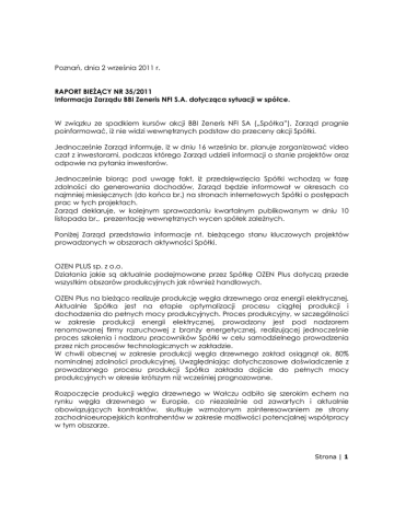 Poznań, dnia 2 września 2011 r. RAPORT BIEśĄCY NR 35/2011 Informacja Zarządu BBI Zeneris NFI S.A. dotycząca sytuacji w spółce. W związku ze spadkiem kursów akcji BBI Zeneris NFI SA („Spółka”), Zarząd pragnie poinformować, iŜ nie widzi wewnętrznych podstaw do przeceny akcji Spółki. Jednocześnie Zarząd informuje, iŜ w dniu 16 września br. planuje zorganizować video czat z inwestorami, podczas którego Zarząd udzieli informacji o stanie projektów oraz odpowie na pytania inwestorów. Jednocześnie biorąc pod uwagę fakt, iŜ przedsięwzięcia Spółki wchodzą w fazę zdolności do generowania dochodów, Zarząd będzie informował w okresach co najmniej miesięcznych (do końca br.) na stronach internetowych Spółki o postępach prac w tych projektach. Zarząd deklaruje, w kolejnym sprawozdaniu kwartalnym publikowanym w dniu 10 listopada br., prezentację wewnętrznych wycen spółek zaleŜnych. PoniŜej Zarząd przedstawia informacje nt. bieŜącego stanu kluczowych projektów prowadzonych w obszarach aktywności Spółki. OZEN PLUS sp. z o.o. Działania jakie są aktualnie podejmowane przez Spółkę OZEN Plus dotyczą przede wszystkim obszarów produkcyjnych jak równieŜ handlowych. OZEN Plus na bieŜąco realizuje produkcję węgla drzewnego oraz energii elektrycznej. Aktualnie Spółka jest na etapie optymalizacji procesu ciągłej produkcji i dochodzenia do pełnych mocy produkcyjnych. Proces produkcyjny, w szczególności w zakresie produkcji energii elektrycznej, prowadzony jest pod nadzorem renomowanej firmy rozruchowej z branŜy energetycznej, realizującej jednocześnie proces szkolenia i nadzoru pracowników Spółki w celu samodzielnego prowadzenia przez nich procesów technologicznych w zakładzie. W chwili obecnej w zakresie produkcji węgla drzewnego zakład osiągnął ok. 80% nominalnej zdolności produkcyjnej. Uwzględniając dotychczasowe doświadczenie z prowadzonego procesu produkcji Spółka zakłada dojście do pełnych mocy produkcyjnych w okresie krótszym niŜ wcześniej prognozowane. Rozpoczęcie produkcji węgla drzewnego w Wałczu odbiło się szerokim echem na rynku węgla drzewnego w Europie, co niezaleŜnie od zawartych i aktualnie obowiązujących kontraktów, skutkuje wzmoŜonym zainteresowaniem ze strony zachodnioeuropejskich kontrahentów w zakresie moŜliwości potencjalnej współpracy w tym obszarze. Strona | 1 Spółka po raz pierwszy w swojej historii, z uwagi na rozpoczęcie produkcji, będzie bezpośrednim uczestnikiem i wystawcą na corocznych Międzynarodowych Targach SPOGA + GAFA w Kolonii, obecność na których jest standardem panującym na rynku węgla drzewnego wśród istotnych uczestników tego rynku. BIOGAZ ZENERIS sp. z o.o. Biogaz Zeneris obecnie skupia się na dwóch podstawowych kierunkach działań: - uczestnictwo w przetargach na budowę i uruchomienie biogazowni oraz przetargach ogłaszanych w formule „zaprojektuj i wybuduj”, - optymalizacji pracy instalacji w Skrzatuszu, zarówno w zakresie pracy samodzielnej, jak i przy współdziałaniu z gorzelnią (produkcja pary i ciepła na rzecz gorzelni w kontekście emisji „Ŝółtych” certyfikatów stanowiących dodatkowy przychód dla biogazowni). W zakresie działalności handlowej, której końcowym oczekiwanym etapem jest zajęcie pierwszego miejsca w przetargu i podpisanie umowy na realizację (średnia wartość 14-18 mln PLN kaŜda) spółka z sukcesem zakończyła drugi kwartał wygrywając przetarg w Boleszynie (wartość 16,295 mln PLN netto). Realizacja tego kontraktu odbywa się zgodnie z harmonogramem, niektóre z prac i dostaw są wykonywane z kilkutygodniowym wyprzedzeniem, płatności są wykonywane przez Inwestora regularnie, na chwilę obecną nie ma zagroŜenia terminowej realizacji tej umowy mimo przyjęcia ambitnego harmonogramu. Spółka obecnie uczestniczy w kilku kolejnych postępowaniach przetargowych, których rozstrzygnięcia będą następowały w ciągu najbliŜszych dni lub tygodni. Pozycja konkurencyjna spółki pozwala przypuszczać, Ŝe przynajmniej 1-2 z tych postępowań zakończą się sukcesem, co pozwoli utrzymać spółce pozycję lidera na rynku. W Skrzatuszu instalacja dochodzi stopniowo do pełnej mocy, osiągając średniomiesięczną wydajność na poziomie 70%. Obecnie operatorzy skupiają się na precyzyjnym zgraniu czasu dostaw róŜnych substratów do biogazowni oraz maksymalizacji czasu pracy kotła parowego (sterowanego częściowo zapotrzebowaniem gorzelni). ENERGO-EKO I S.A. Energo-Eko I S.A. z siedzibą w Jastrzębiu-Zdrój, jest spółką celową Funduszu dedykowaną do realizacji projektu "Zakład Produkcji Nośników Energetycznych". Celem inwestycji jest budowa instalacji do odzysku energii z odpadów komunalnych i przemysłowych przy pomocy procesu niskotemperaturowej suchej destylacji. Aktualnie trwa postępowanie wyboru Generalnego Realizatora Inwestycji w trybie przetargu ograniczonego. Po rozpoznaniu moŜliwości i warunków złoŜenia ofert przez poszczególne podmioty, w dniu 1 września br. spółka rozesłała zaproszenia do złoŜenia ofert do 10-u podmiotów. Termin złoŜenia ofert ustalono na koniec października. Strona | 2 Z uwagi na trwałe, rynkowe zapotrzebowanie na istnienie planowanego zakładu, jego realizacja wpisuje się w trend zmian w zakresie gospodarki odpadami oraz energetyki odnawialnej. Zainteresowanie technologią zgazowania ma swoje odbicie równieŜ w polityce gospodarczej UE, a dowodem tego jest choćby uwzględnienie tej technologii w zakresie programu Komisji Europejskiej NER300. Program ten jest przeznaczonym na dofinansowanie projektów w dziedzinie technologii wychwytywania i składowania dwutlenku węgla (CCS) oraz innowacyjnych technologii energii odnawialnej. Projekt został złoŜony jako projekt demonstracyjny w zakresie innowacyjnych odnawialnych źródeł energii. Wnioskodawcą jest spółka BBI Zeneris NFI S.A. jako sponsor projektu oraz spółk