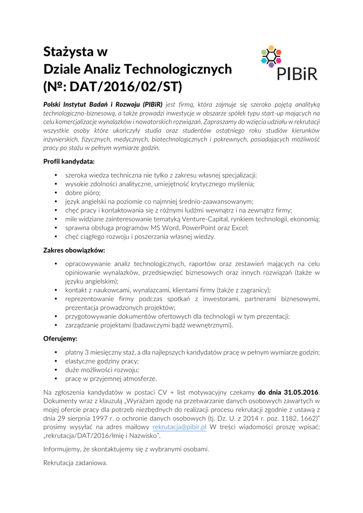 Stażysta w Dziale Analiz Technologicznych (№: DAT/2016/02/ST) Polski Instytut Badań i Rozwoju (PIBiR) jest firmą, która zajmuje się szeroko pojętą analityką technologiczno-biznesową, a także prowadzi inwestycje w obszarze spółek typu start-up mających na celu komercjalizacje wynalazków i nowatorskich rozwiązań. Zapraszamy do wzięcia udziału w rekrutacji wszystkie osoby które ukończyły studia oraz studentów ostatniego roku studiów kierunków inżynierskich, fizycznych, medycznych, biotechnologicznych i pokrewnych, posiadających możliwość pracy po stażu w pełnym wymiarze godzin. Profil kandydata: • • • • • • • • szeroka wiedza techniczna nie tylko z zakresu własnej specjalizacji; wysokie zdolności analityczne, umiejętność krytycznego myślenia; dobre pióro; język angielski na poziomie co najmniej średnio-zaawansowanym; chęć pracy i kontaktowania się z różnymi ludźmi wewnątrz i na zewnątrz firmy; mile widziane zainteresowanie tematyką Venture-Capital, rynkiem technologii, ekonomią; sprawna obsługa programów MS Word, PowerPoint oraz Excel; chęć ciągłego rozwoju i poszerzania własnej wiedzy. Zakres obowiązków: • • • • • opracowywanie analiz technologicznych, raportów oraz zestawień mających na celu opiniowanie wynalazków, przedsięwzięć biznesowych oraz innych rozwiązań (także w języku angielskim); kontakt z naukowcami, wynalazcami, klientami firmy (także z zagranicy); reprezentowanie firmy podczas spotkań z inwestorami, partnerami biznesowymi, prezentacja prowadzonych projektów; przygotowywanie dokumentów ofertowych dla technologii w tym prezentacji; zarządzanie projektami (badawczymi bądź wewnętrznymi). Oferujemy: • • • • płatny 3 miesięczny staż, a dla najlepszych kandydatów pracę w pełnym wymiarze godzin; elastyczne godziny pracy; duże możliwości rozwoju; pracę w przyjemnej atmosferze. Na zgłoszenia kandydatów w postaci CV + list motywacyjny czekamy do dnia 31.05.2016. Dokumenty wraz z klauzulą „Wyrażam zgodę na przetwarzanie danych osobowych zawartych w mojej ofercie pracy dla potrzeb niezbędnych do realizacji procesu rekrutacji zgodnie z ustawą z dnia 29 sierpnia 1997 r. o ochronie danych osobowych (tj. Dz. U. z 2014 r. poz. 1182, 1662)” prosimy wysyłać na adres mailowy [email protected] W treści wiadomości proszę wpisać: „rekrutacja/DAT/2016/Imię i Nazwisko”. Informujemy, że skontaktujemy się z wybranymi osobami. Rekrutacja zadaniowa.