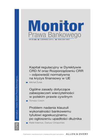 ISPB www.ispb.pl – Instytut Szkoleń Prawa Bankowego s.c. NR 06 (43) CZERWIEC 2014 r. ISSN 2081-9021 Kapitał regulacyjny w Dyrektywie CRD IV oraz Rozporządzeniu CRR – odpowiedź normatywna na kryzys finansowy w UE Michał Żurek Ogólne zasady dotyczące zabezpieczeń wierzytelności w polskim prawie cywilnym Tomasz Czech Problem nadania klauzuli wykonalności bankowemu tytułowi egzekucyjnemu po ogłoszeniu upadłości dłużnika Rafał Adamus, Dariusz Chrapoński Partnerem merytorycznym miesięcznika jest kancelaria — SPIS TREŚCI — Stanowiska organów regulacyjnych Badanie zdolności kredytowej przez SKOK – pismo Urzędu KNF z 14 marca 2013 r. (DLB/DLB_WL1/708/7/1/2013/AK)............ 2 Zakres podmiotowy art. 105a prawa bankowego – pismo Ministerstwa Finansów z 10 września 2013 r. (FN/FN1/033/A/1//OLT/RD-93398/2013). .................................................................... 4 Orzecznictwo sądów Ujawnienie komornikowi tajemnicy bankowej – postanowienie SO Warszawa-Praga w Warszawie z 23 lutego 2010 r. (IV Cz 202/10) ................................................................................................................ 7 Odpowiedzialność banku za wykonanie zajęcia rachunku bankowego – wyrok SA w Białymstoku z 5 kwietnia 2013 r. (I ACa 142/13) ................................ 11 Zakres poręczenia – wyrok SN z 16 maja 2012 r. (III CSK 249/11) .......................................................... 17 Zapis na Sąd Polubowny przy Związku Banków Polskich – wyrok SN z 27 marca 2013 r. (V CSK 222/12)......................................................... 20 Glosy Odpowiedzialność banku za wykonanie zajęcia rachunku bankowego – glosa do wyroku SA w Białymstoku z 5 kwietnia 2013 r. (I ACa 142/13) ............... 24 Wojciech Zręda Poglądy Kapitał regulacyjny w Dyrektywie CRD IV oraz Rozporządzeniu CRR – odpowiedź normatywna na kryzys finansowy w UE .............................................. 32 Michał Żurek Ogólne zasady dotyczące zabezpieczeń wierzytelności w polskim prawie cywilnym ........................................................................................ 52 Tomasz Czech Problem nadania klauzuli wykonalności bankowemu tytułowi egzekucyjnemu po ogłoszeniu upadłości dłużnika ................................................... 73 Rafał Adamus, Dariusz Chrapoński Kaucja gwarancyjna w kontraktach budowlanych – stosowanie i pozycja w przypadku upadłości układowej........................................ 81 Mateusz Medyński, Paweł Lewandowski Karnoprawna ochrona sektora bankowego na Słowacji ..........................................93 Zygmunt Kukuła 1 Monitor Prawa Bankowego | CZERWIEC 2014 r. | www.ispb.pl