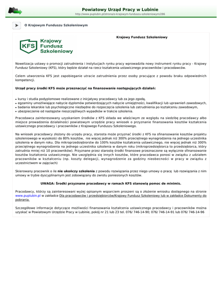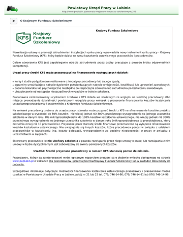 Powiatowy Urząd Pracy w Lubinie http://www.puplubin.pl/strona/o-krajowym-funduszu-szkoleniowym/286 O Krajowym Funduszu Szkoleniowym Krajowy Fundusz Szkoleniowy Nowelizacja ustawy o promocji zatrudnienia i instytucjach rynku pracy wprowadziła nowy instrument rynku pracy - Krajowy Fundusz Szkoleniowy (KFS), który będzie działał na rzecz kształcenia ustawicznego pracowników i pracodawców. Celem utworzenia KFS jest zapobieganie utracie zatrudnienia przez osoby pracujące z powodu braku odpowiednich kompetencji. Urząd pracy środki KFS może przeznaczyć na finansowanie następujących działań: ● ● ● ● kursy i studia podyplomowe realizowane z inicjatywy pracodawcy lub za jego zgodą, egzaminy umożliwiające nabycie dyplomów potwierdzających nabycie umiejętności, kwalifikacji lub uprawnień zawodowych, badania lekarskie lub psychologiczne niezbędne do rozpoczęcia szkolenia lub zatrudnienia po kształceniu zawodowym, ubezpieczenie od następstw nieszczęśliwych wypadków w trakcie szkolenia. Pracodawca zainteresowany uzyskaniem środków z KFS składa we właściwym ze względu na siedzibę pracodawcy albo miejsce prowadzenia działalności powiatowym urzędzie pracy wniosek o przyznanie finansowania kosztów kształcenia ustawicznego pracodawcy i pracowników z Krajowego Funduszu Szkoleniowego. Na wniosek pracodawcy złożony do urzędu pracy, starosta może przyznać środki z KFS na sfinansowanie kosztów projektu szkoleniowego w wysokości do 80% kosztów, nie więcej jednak niż 300% przeciętnego wynagrodzenia na jednego uczestnika szkolenia w danym roku. Dla mikroprzedsiębiorstw do 100% kosztów kształcenia ustawicznego, nie więcej jednak niż 300% przeciętnego wynagrodzenia na jednego uczestnika szkolenia w danym roku (mikroprzedsiębiorca to przedsiębiorca, który zatrudnia mniej niż 10 pracowników). Przyznane przez starostę środki finansowe przeznaczone są wyłącznie sfinansowanie kosztów kształcenia ustawicznego. Nie uwzględnia się innych kosztów, które pracodawca ponosi w związku z udziałem pracowników w kształceniu (np. koszty delegacji, wynagrodzenie za godziny nieobecności w pracy w związku z uczestnictwem w zajęciach) Skierowany pracownik o ile nie ukończy szkolenia z powodu rozwiązania przez niego umowy o pracę lub rozwiązania z nim umowy w trybie dyscyplinarnym jest zobowiązany do zwrotu poniesionych kosztów. UWAGA: Środki przyznane pracodawcy w ramach KFS stanowią pomoc de minimis. Pracodawcy, którzy są zainteresowani wyżej opisanym wsparciem proszeni są o złożenie wniosku dostępnego na stronie www.puplubin.pl w zakładce Dla pracodawców i przedsiębiorców/Krajowy Fundusz Szkoleniowy lub w zakładce Dokumenty do pobrania. Szczegółowe informacje dotyczące możliwości finansowania kształcenia ustawicznego pracodawcy i pracowników można uzyskać w Powiatowym Urzędzie Pracy w Lubinie, pokój nr 21 lub 23 tel. 076/ 746-14-90; 076/ 746-14-91 lub 076/ 746-14-96