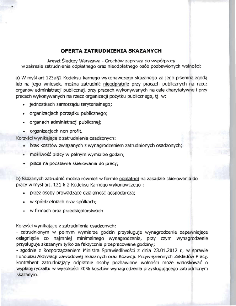• OFERTA ZATRUDNIENIA SKAZANYCH Areszt Sledczy Warszawa - Groch6w zaprasza do wsp6tpracy w zakresie zatrudnienia odptatnego oraz nieodptatnego os6b pozbawionych wolnosci: a) W mysl art 123a§2 Kodeksu karnego wykonawczego skazanego za jego pisemnq zgodq lub na jego wniosek, moina zatrudnic nieodptatnie przy pracach publicznych na rzecz organ6w administracji publicznej, przy pracach wykonywanych na cele charytatywne i przy pracach wykonywanych na rzecz organizacji poiytku publicznego, tj. w: • jednostkach samorzqdu terytorialnego; • organizacjach porzqdku publicznego; • organach administracji publicznej; • organizacjach non profit. Korzysci wynikajqce z zatrudnienia osadzonych: • brak koszt6w zWiqzanych z wynagrodzeniem zatrudnionych osadzonych; • moiliwosc pracy w petnym wymiarze godzin; • praca na podstawie skierowania do pracy; b) Skazanych zatrudnic moina r6wniei w formie odptatnej na zasadzie skierowania do pracy w mysl art. 121 § 2 Kodeksu Karnego wykonawczego : • przez osoby prowadzqce dziatalnosc gospodarczq; • w sp6tdzielniach oraz sp6tkach; • w firmach oraz przedsi~biorstwach Korzysci wynikajqce z zatrudnienia osadzonych: - zatrudnionym w petnym wymiarze godzin przystuguje wynagrodzenie zapewniajqce osiqgni~cie co najmniej minimalnego wynagrodzenia, przy czym wynagrodzenie przystuguje skazanym tylko za faktycznie przepracowane godziny; - zgodnie z Rozporzqdzeniem Ministra Sprawiedliwosci z dnia 23.01.2012 r., w sprawie Funduszu Aktywacji Zawodowej Skazanych oraz Rozwoju Przywi~ziennych Zaktad6w Pracy, kontrahent zatrudniajqcy odptatnie osoby pozbawione wolnosci moie wnioskowac 0 wyptat~ ryczattu w wysokosci 20% koszt6w wynagrodzenia przystugujqcego zatrudnionym skazanym. Dotychczasowe doswiadczenia jednoznacznie wskazujq, iz zatrudnianie skazanych przynosi wiele korzysci dla zatrudniajqcego, a dla skazanych jest bardzo istotnq formq resocjalizacji. Kontrahenci zatrudniajqcy osoby osadzone w tutejszej jednostce wskazujq na duze zaangazowanie skazanych w wykonywanq prac~. Umiej~tnosci osadzonych zWiqzane Sq przede wszystkim z pracami remontowymi, ogolnobudowlanymi, gospodarczymi, konserwatorskimi, magazynierskimi, pomocniczymi oraz pracami przy iywnosci. Zapraszamy do wspOtpracy z Aresztem Sledczym Warszawa - Grochow, ktora przynosi wiele korzysci. W przypadku zainteresowania w/w ofertq mozna nawiqzac kontakt z osobq odpowiedzialnq za zatrudnienie skazanych, w celu omowienia zasad wspofpracy, nr tel: 226105541 wew.209, fax: 22 673-45-01 e-mail: [email protected] www.sw.gov.pl https:llwww.facebook.com/OI5WWARSZAWA Areszt Sledczy Warszawa-Grochow ul. Chfopickiego 71 A 04-275 Warszawa pplk mgr inz. J6zef Soja