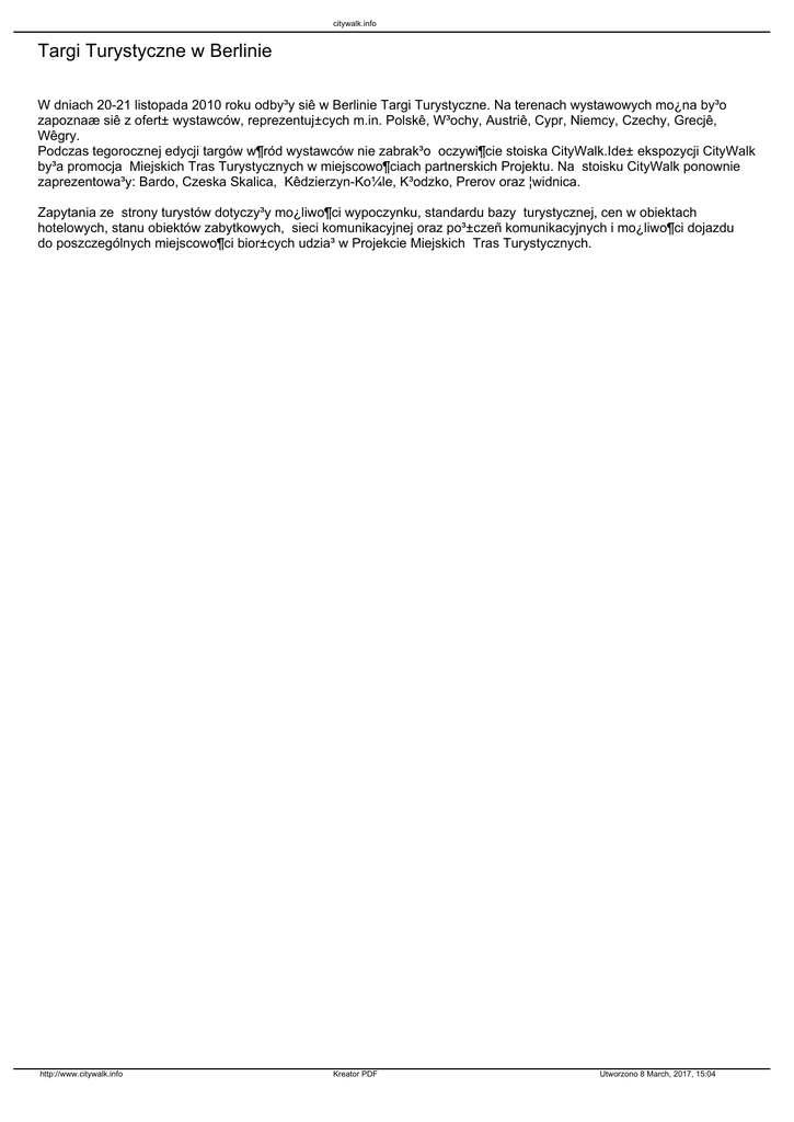 citywalk.info Targi Turystyczne w Berlinie W dniach 20-21 listopada 2010 roku odby³y siê w Berlinie Targi Turystyczne. Na terenach wystawowych mo¿na by³o zapoznaæ siê z ofert± wystawców, reprezentuj±cych m.in. Polskê, W³ochy, Austriê, Cypr, Niemcy, Czechy, Grecjê, Wêgry. Podczas tegorocznej edycji targów w¶ród wystawców nie zabrak³o oczywi¶cie stoiska CityWalk.Ide± ekspozycji CityWalk by³a promocja Miejskich Tras Turystycznych w miejscowo¶ciach partnerskich Projektu. Na stoisku CityWalk ponownie zaprezentowa³y: Bardo, Czeska Skalica, Kêdzierzyn-Ko¼le, K³odzko, Prerov oraz ¦widnica. Zapytania ze strony turystów dotyczy³y mo¿liwo¶ci wypoczynku, standardu bazy turystycznej, cen w obiektach hotelowych, stanu obiektów zabytkowych, sieci komunikacyjnej oraz po³±czeñ komunikacyjnych i mo¿liwo¶ci dojazdu do poszczególnych miejscowo¶ci bior±cych udzia³ w Projekcie Miejskich Tras Turystycznych. http://www.citywalk.info Kreator PDF Utworzono 8 March, 2017, 15:04