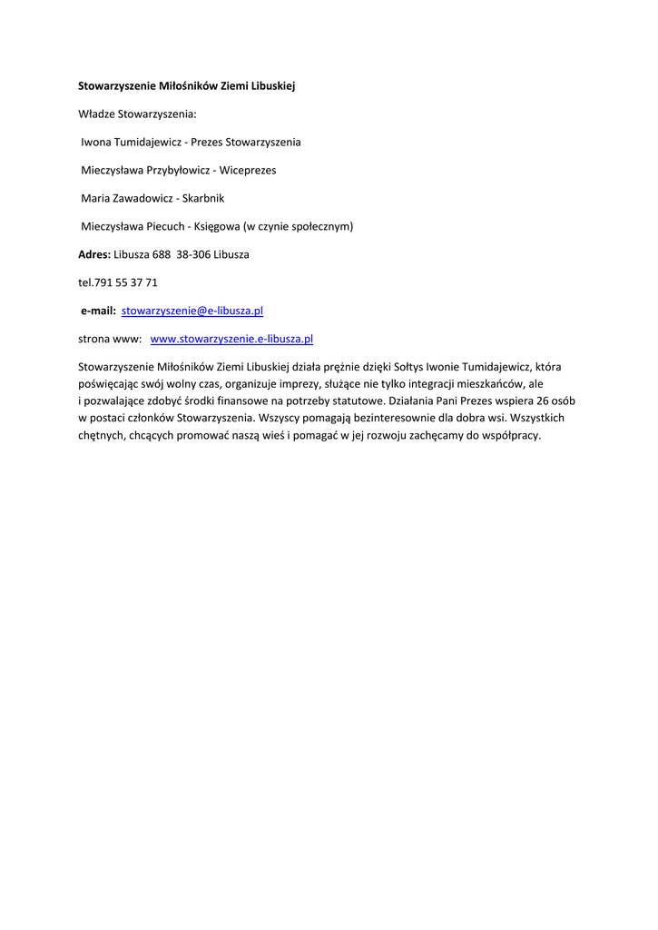 Stowarzyszenie Miłośników Ziemi Libuskiej Władze Stowarzyszenia: Iwona Tumidajewicz - Prezes Stowarzyszenia Mieczysława Przybyłowicz - Wiceprezes Maria Zawadowicz - Skarbnik Mieczysława Piecuch - Księgowa (w czynie społecznym) Adres: Libusza 688 38-306 Libusza tel.791 55 37 71 e-mail: [email protected] strona www: www.stowarzyszenie.e-libusza.pl Stowarzyszenie Miłośników Ziemi Libuskiej działa prężnie dzięki Sołtys Iwonie Tumidajewicz, która poświęcając swój wolny czas, organizuje imprezy, służące nie tylko integracji mieszkańców, ale i pozwalające zdobyć środki finansowe na potrzeby statutowe. Działania Pani Prezes wspiera 26 osób w postaci członków Stowarzyszenia. Wszyscy pomagają bezinteresownie dla dobra wsi. Wszystkich chętnych, chcących promować naszą wieś i pomagać w jej rozwoju zachęcamy do współpracy.
