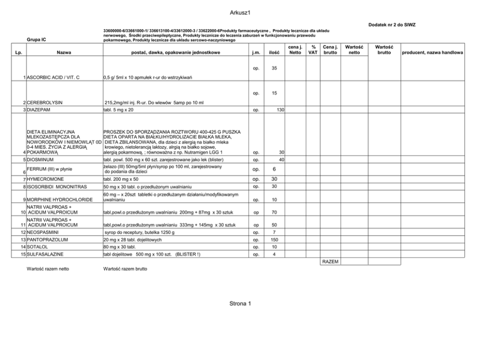 Arkusz1 Dodatek nr 2 do SIWZ 33600000-6/33661000-1/ 336613100-4/33612000-3 / 33622000-6Produkty farmaceutyczne , Produkty lecznicze dla układu nerwowego, Środki przeciwepileptyczne, Produkty lecznicze do leczenia zaburzeń w funkcjonowaniu przewodu pokarmowego, Produkty lecznicze dla układu sercowo-naczyniowego Grupa IC Lp. Nazwa 1 ASCORBIC ACID / VIT. C postać, dawka, opakowanie jednostkowe j.m. ilość op. 35 op. 15 215,2mg/ml inj. R-ur. Do wlewów 5amp po 10 ml 3 DIAZEPAM tabl. 5 mg x 20 op. 130 DIETA ELIMINACYJNA MLEKOZASTĘPCZA DLA NOWORODKÓW I NIEMOWLĄT 0D 0-4 MIES. ŻYCIA Z ALERGIĄ 4 POKARMOWĄ PROSZEK DO SPORZĄDZANIA ROZTWORU 400-425 G PUSZKA DIETA OPARTA NA BIAŁKU/HYDROLIZACIE BIAŁKA MLEKA, DIETA ZBILANSOWANA, dla dzieci z alergią na białko mleka krowiego, nietolerancją laktozy, alrgią na białko sojowe, alergią pokarmową, ; równoważna z np. Nutramigen LGG 1 op. 30 5 DIOSMINUM tabl. powl. 500 mg x 60 szt. zarejestrowane jako lek (blister) op. 40 żelazo (III) 50mg/5ml płyn/syrop po 100 ml, zarejestrowany do podania dla dzieci op. 6 7 HYMECROMONE tabl. 200 mg x 50 op. 30 8 ISOSORBIDI MONONITRAS 50 mg x 30 tabl. o przedłużonym uwalnianiu op. 30 9 MORPHINE HYDROCHLORIDE 60 mg – x 20szt tabletki o przedłużanym działaniu/modyfikowanym uwalnianiu op. 10 NATRII VALPROAS + 10 ACIDUM VALPROICUM tabl,powl.o przedłużonym uwalnianiu 200mg + 87mg x 30 sztuk op 70 NATRII VALPROAS + 11 ACIDUM VALPROICUM tabl,powl.o przedłużonym uwalnianiu 333mg + 145mg x 30 sztuk op 50 12 NEOSPASMINI syrop do receptury, butelka 1250 g op. 7 13 PANTOPRAZOLUM 20 mg x 28 tabl. dojelitowych op. 150 14 SOTALOL 80 mg x 30 tabl. op. 10 15 SULFASALAZINE tabl dojelitowe 500 mg x 100 szt. (BLISTER !) op. 4 FERRUM (III) w płynie % VAT Cena j. brutto 0,5 g/ 5ml x 10 apmułek r-ur do wstrzykiwań 2 CEREBROLYSIN 6 cena j. Netto RAZEM Wartość razem netto Wartość razem brutto Strona 1 Wartość netto Wartość brutto producent, nazwa handlowa Arkusz1 33600000-6/ 33622100-7/33691100-1 Produkty farmaceutyczne; Produkty lecznicze do terapii serca/ środki przeciw pierwotniakom Grupa IIC Lp. Nazwa postać, dawka, opakowanie jednostkowe 1 ACIDUL ACETYLSALICYLICUM 2 METFORMINI HYDROCHLORIDE 75 MG X 60 tabl .dojelitowe (blister) tabl. 500 mg x 60 3 METRONIDAZOL j.m. ilość op 100 tabl. 250 mg x 20 tabl.powl. op. op. 30 100 4 RAMIPRILUM 5 mg x 28-30 tabl. (blister) op. 60 5 VERAPAMIL HYDROCHLORIDE tabl. powl. 80 mg x 20 op. 60 Cena j. netto % VAT Cena j. brutto Wartość netto Wartość brutto producent, nazwa handlowa Wartość netto Wartość brutto producent, nazwa handlowa Wartość netto Wartość brutto producent, nazwa handlowa RAZEM Wartość razem netto Wartość razem brutto Grupa IIIC 33600000-6/33692510-5 Produkty farmaceutyczne, preparaty odżywiania wewnątrzjelitowego Lp. Nazwa postać, dawka, opakowanie jednostkowe Dieta płynna kompletna pod Względem odżywczym Dieta kompletna, peptydowa, bezresztkowa, klinicznie wolna od laktozy, bezglutenowa, normokaloryczna 91 kcal/ml) źródłem białka jest mieszanina krótkołańcuchowych peptydów i wolnych Aminokwasów, niska zawartość tłuszczu, zawiera 47% tłuszczy MCT, źródłem węglowodanów są maltodekstryny, osmolarność ok 455 mOsm/l, płyn o poj. 500Ml równoważny z np.Peptisorb Dieta płynna zalecana wleczeniu żywieniowym pacjentów w ciężkim stanie dieta płynna , kompletna, hiperkaloryczna (nie mniej niż 1,28kcal/ml), bogatoresztkowa (6 rodzajów włókien pokarmowych), oparta na białku kazeinowym i sojowym, o osmolarności 270 mosmol/l. Opakowanie miękkie typu Pack 500ml, równoważny z np. Protison Zestaw do worków/opakowań typu Pack zestaw do żywienia dojelitowego służący do połączenia worka z dietą (opakowanie typu Pack) ze zgłębnikiem, umożliwia żywienie pacjent metodą ciągłego wlewu kroplowego (wersja grawitacyjna) j.m. ilość op 20 op 120 op 100 cena j. Netto % VAT Cena j. brutto RAZEM Lp. Wartość razem netto Wartość razem brutto Grupa IVC 33141110-4/33680000-0 Opatrunki; Wyroby farmaceutyczne Nazwa postać, dawka, opakowanie jednostkowe Bakteriobójcza folia chirurgiczna jodowana Wymiary całkowite 30cm-45cm x 35cm-40cm oraz części przylepnej 30cm-35cm x 35cm-40cm, z papierem zabezpieczającym, pakowana pojedynczo Wartość razem netto Wartość razem brutto j.m. ilość op 20 cena j. Netto % VAT Cena j. brutto RAZEM Strona 2 Arkusz1 ...................................dnia............. ..................................... podpis i pieczęć wykonawcy Strona 3 Arkusz1 Strona 4 Arkusz1 Strona 5 Arkusz1 Strona 6 Arkusz1 Strona 7 Arkusz1 Strona 8