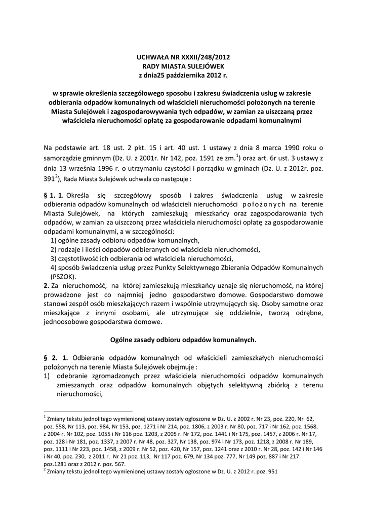 UCHWAŁA NR XXXII/248/2012 RADY MIASTA SULEJÓWEK z dnia25 października 2012 r. w sprawie określenia szczegółowego sposobu i zakresu świadczenia usług w zakresie odbierania odpadów komunalnych od właścicieli nieruchomości położonych na terenie Miasta Sulejówek i zagospodarowywania tych odpadów, w zamian za uiszczaną przez właściciela nieruchomości opłatę za gospodarowanie odpadami komunalnymi Na podstawie art. 18 ust. 2 pkt. 15 i art. 40 ust. 1 ustawy z dnia 8 marca 1990 roku o samorządzie gminnym (Dz. U. z 2001r. Nr 142, poz. 1591 ze zm. 1) oraz art. 6r ust. 3 ustawy z dnia 13 września 1996 r. o utrzymaniu czystości i porządku w gminach (Dz. U. z 2012r. poz. 391 2), Rada Miasta Sulejówek uchwala co następuje : § 1. 1. Określa się szczegółowy sposób i zakres świadczenia usług w zakresie odbierania odpadów komunalnych od właścicieli nieruchomości p o ł o ż o n y c h na terenie Miasta Sulejówek, na których zamieszkują mieszkańcy oraz zagospodarowania tych odpadów, w zamian za uiszczoną przez właściciela nieruchomości opłatę za gospodarowanie odpadami komunalnymi, a w szczególności: 1) ogólne zasady odbioru odpadów komunalnych, 2) rodzaje i ilości odpadów odbieranych od właściciela nieruchomości, 3) częstotliwość ich odbierania od właściciela nieruchomości, 4) sposób świadczenia usług przez Punkty Selektywnego Zbierania Odpadów Komunalnych (PSZOK). 2. Za nieruchomość, na której zamieszkują mieszkańcy uznaje się nieruchomość, na której prowadzone jest co najmniej jedno gospodarstwo domowe. Gospodarstwo domowe stanowi zespół osób mieszkających razem i wspólnie utrzymujących się. Osoby samotne oraz mieszkające z innymi osobami, ale utrzymujące się oddzielnie, tworzą odrębne, jednoosobowe gospodarstwa domowe. Ogólne zasady odbioru odpadów komunalnych. § 2. 1. Odbieranie odpadów komunalnych od właścicieli zamieszkałych nieruchomości położonych na terenie Miasta Sulejówek obejmuje : 1) odebranie zgromadzonych przez właściciela nieruchomości odpadów komunalnych zmieszanych oraz odpadów komunalnych objętych selektywną zbiórką z terenu nieruchomości, 1 Zmiany tekstu jednolitego wymienionej ustawy zostały ogłoszone w Dz. U. z 2002 r. Nr 23, poz. 220, Nr 62, poz. 558, Nr 113, poz. 984, Nr 153, poz. 1271 i Nr 214, poz. 1806, z 2003 r. Nr 80, poz. 717 i Nr 162, poz. 1568, z 2004 r. Nr 102, poz. 1055 i Nr 116 poz. 1203, z 2005 r. Nr 172, poz. 1441 i Nr 175, poz. 1457, z 2006 r. Nr 17, poz. 128 i Nr 181, poz. 1337, z 2007 r. Nr 48, poz. 327, Nr 138, poz. 974 i Nr 173, poz. 1218, z 2008 r. Nr 189, poz. 1111 i Nr 223, poz. 1458, z 2009 r. Nr 52, poz. 420, Nr 157, poz. 1241 oraz z 2010 r. Nr 28, poz. 142 i Nr 146 i Nr 40, poz. 230, z 2011 r. Nr 21 poz. 113, Nr 117 poz. 679, Nr 134 poz. 777, Nr 149 poz. 887 i Nr 217 poz.1281 oraz z 2012 r. poz. 567. 2 Zmiany tekstu jednolitego wymienionej ustawy zostały ogłoszone w Dz. U. z 2012 r. poz. 951 2) dostarczenie właścicielom nieruchomości pojemników lub worków do selektywnej zbiórki odpadów, 3) stworzenie na terenie Sulejówka Punktu Selektywnego Zbierania Odpadów Komunalnych (PSZOK), 4) odbiór wyznaczonych frakcji odpadów w ramach „Akcji wystawka”. 2. Przedsiębiorca odbierający odpady komunalne zobowiązany jest do : 1) odbioru odpadów w sposób uniemożliwiający ich rozsypanie podczas załadunku lub transportu a w przypadku rozsypania się odpadów zobowiązany jest do ich uprzątnięcia, 2) mycia i dezynfekcji pojemników do gromadzenia odpadów minimum raz w roku zgodnie z harmonogramem, o którym mowa w § 5 ust. 7. 3) informowania Urzędu Miasta Sulejówek o nieprawidłowościach w odbiorze odpadów komunalnych. Zasady reklamacji w zakresie nieprawidłowości funkcjonowania systemu gospodarki odpadami komunalnymi. § 3. W przypadku stwierdzenia nieprawidłowości funkcjonowania systemu odbioru odpadów komunalnych każdy jego uczestnik może zgłosić reklamację na następujących zasadach: 1) reklamacja powinna być zgłoszona przez właściciela nieruchomości niezwłocznie po zaistnieniu kwestii spornej, 2) reklamacja może być zgłoszona telefonicznie, pisemnie lub pocztą elektroniczną do Urzędu Miasta Sulejówek, 3) zgłoszenie reklamacji nie uchyla od obowiązku uiszczenia opłaty za odbiór odpadów, 4) termin załatwienia reklamacji ustala się na 14 dni od dnia otrzymania zgłoszenia. Rodzaje i ilości odpadów odbieranych od właściciela nieruchomości. § 4. 1. Odpady komunalne z terenu zamieszkałych nieruchomości będą odbierane przez przedsiębiorcę według podziału na następujące grupy i frakcje: 1) Grupa podstawowa obejmująca : a. zmieszane odpady komunalne, b. szkło, c. papier, d. tworzywa sztuczne, e. metale, f. ubrania i tekstylia, g. opakowania wielomateriałowe. 2) Grupa dodatkowa obejmująca : a. odpady ulegające biodegradacji (trawa, liście, odpady kuchenne), b. przeterminowane lekarstwa, c. zużyte baterie i akumulatory, d. inne odpady niebezpieczne (chemikalia, świetlówki, opakowania po farbach i lakierach, itp.), e. zużyte opony, f. odpady wielkogabarytowe, g. zużyty sprzęt elektryczny i elektroniczny. 2. Sposób i miejsce gromadzenia poszczególnych grup i frakcji odpadów komunalnych oraz częstotliwość ich odbioru określa załącznik do uchwały. 3. Ilość odpadów komunalnych odbieranych z zamieszkałych nieruchomości nie jest limitowana. Sposób gromadzenia odpadów oraz częstotliwość ich odbierania od właściciela zamieszkałych nieruchomości. § 5. 1. Zmieszane odpady komunalne na terenie zamieszkałych nieruchomości gromadzi się w pojemnikach, wyposażenie nieruchomości w pojemniki do zmieszanych odpadów komunalnych zapewnia właściciel nieruchomości. 2. Nieruchomości, których właściciele lub użytkownicy zadeklarują selektywną zbiórkę odpadów komunalnych zostaną dodatkowo wyposażone w pojemniki lub worki do selektywnej zbiórki odpadów. Pojemnik