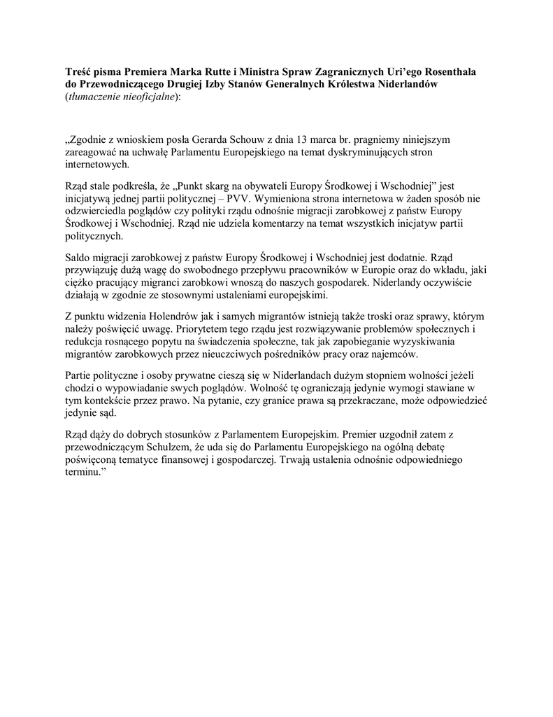 Treść pisma Premiera Marka Rutte i Ministra Spraw Zagranicznych Uri’ego Rosenthala do Przewodniczącego Drugiej Izby Stanów Generalnych Królestwa Niderlandów (tłumaczenie nieoficjalne): „Zgodnie z wnioskiem posła Gerarda Schouw z dnia 13 marca br. pragniemy niniejszym zareagować na uchwałę Parlamentu Europejskiego na temat dyskryminujących stron internetowych. Rząd stale podkreśla, że „Punkt skarg na obywateli Europy Środkowej i Wschodniej” jest inicjatywą jednej partii politycznej – PVV. Wymieniona strona internetowa w żaden sposób nie odzwierciedla poglądów czy polityki rządu odnośnie migracji zarobkowej z państw Europy Środkowej i Wschodniej. Rząd nie udziela komentarzy na temat wszystkich inicjatyw partii politycznych. Saldo migracji zarobkowej z państw Europy Środkowej i Wschodniej jest dodatnie. Rząd przywiązuję dużą wagę do swobodnego przepływu pracowników w Europie oraz do wkładu, jaki ciężko pracujący migranci zarobkowi wnoszą do naszych gospodarek. Niderlandy oczywiście działają w zgodnie ze stosownymi ustaleniami europejskimi. Z punktu widzenia Holendrów jak i samych migrantów istnieją także troski oraz sprawy, którym należy poświęcić uwagę. Priorytetem tego rządu jest rozwiązywanie problemów społecznych i redukcja rosnącego popytu na świadczenia społeczne, tak jak zapobieganie wyzyskiwania migrantów zarobkowych przez nieuczciwych pośredników pracy oraz najemców. Partie polityczne i osoby prywatne cieszą się w Niderlandach dużym stopniem wolności jeżeli chodzi o wypowiadanie swych poglądów. Wolność tę ograniczają jedynie wymogi stawiane w tym kontekście przez prawo. Na pytanie, czy granice prawa są przekraczane, może odpowiedzieć jedynie sąd. Rząd dąży do dobrych stosunków z Parlamentem Europejskim. Premier uzgodnił zatem z przewodniczącym Schulzem, że uda się do Parlamentu Europejskiego na ogólną debatę poświęconą tematyce finansowej i gospodarczej. Trwają ustalenia odnośnie odpowiedniego terminu.”