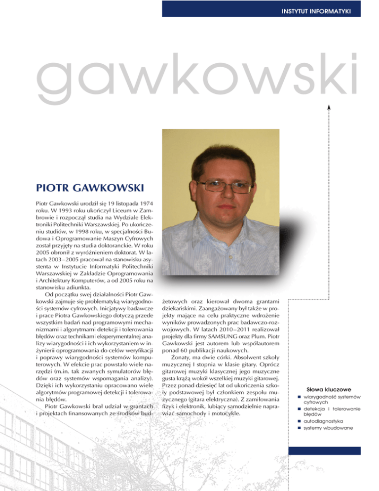 INSTYTUT INFORMATYKI gawkowski PIOTR GAWKOWSKI Piotr Gawkowski urodzi³ siê 19 listopada 1974 roku. W 1993 roku ukoñczy³ Liceum w Zambrowie i rozpocz¹³ studia na Wydziale Elektroniki Politechniki Warszawskiej. Po ukoñczeniu studiów, w 1998 roku, w specjalnoœci Budowa i Oprogramowanie Maszyn Cyfrowych zosta³ przyjêty na studia doktoranckie. W roku 2005 obroni³ z wyró¿nieniem doktorat. W latach 2003 –2005 pracowa³ na stanowisku asystenta w Instytucie Informatyki Politechniki Warszawskiej w Zak³adzie Oprogramowania i Architektury Komputerów, a od 2005 roku na stanowisku adiunkta. Od pocz¹tku swej dzia³alnoœci Piotr Gawkowski zajmuje siê problematyk¹ wiarygodnoœci systemów cyfrowych. Inicjatywy badawcze i prace Piotra Gawkowskiego dotycz¹ przede wszystkim badañ nad programowymi mechanizmami i algorytmami detekcji i tolerowania b³êdów oraz technikami eksperymentalnej analizy wiarygodnoœci i ich wykorzystaniem w in¿ynierii oprogramowania do celów weryfikacji i poprawy wiarygodnoœci systemów komputerowych. W efekcie prac powsta³o wiele narzêdzi (m.in. tak zwanych symulatorów b³êdów oraz systemów wspomagania analizy). Dziêki ich wykorzystaniu opracowano wiele algorytmów programowej detekcji i tolerowania b³êdów. Piotr Gawkowski bra³ udzia³ w grantach i projektach finansowanych ze œrodków bud- ¿etowych oraz kierowa³ dwoma grantami dziekañskimi. Zaanga¿owany by³ tak¿e w projekty maj¹ce na celu praktyczne wdro¿enie wyników prowadzonych prac badawczo-rozwojowych. W latach 2010 –2011 realizowa³ projekty dla firmy SAMSUNG oraz Plum. Piotr Gawkowski jest autorem lub wspó³autorem ponad 60 publikacji naukowych. ¯onaty, ma dwie córki. Absolwent szko³y muzycznej I stopnia w klasie gitary. Oprócz gitarowej muzyki klasycznej jego muzyczne gusta kr¹¿¹ wokó³ wszelkiej muzyki gitarowej. Przez ponad dziesiêæ lat od ukoñczenia szko³y podstawowej by³ cz³onkiem zespo³u muzycznego (gitara elektryczna). Z zami³owania fizyk i elektronik, lubi¹cy samodzielnie naprawiaæ samochody i motocykle. Słowa kluczowe n wiarygodność systemów cyfrowych n detekcja i tolerowanie błędów n autodiagnostyka n systemy wbudowane