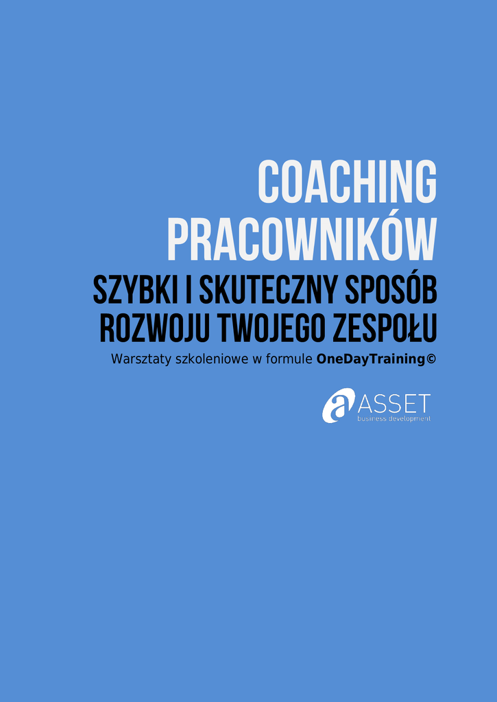 Warsztaty szkoleniowe w formule OneDayTraining© ----------------------------------------------------------------------------------------------------------------------------------------Specjalistyczne szkolenia i konsultacje biznesowe ASSET Business Development Sp. z o.o. Warsaw Financial Center, ul. Emilii Plater 53, 00-113 Warszawa tel: (+48 22) 101 39 74 , [email protected], www.asset.pl Warsztaty szkoleniowe w formule OneDayTraining© Coaching stał się najpopularniejszą i najskuteczniejszą techniką w dziedzinie uczenia się i rozwoju personelu, często postrzeganą niemal jako cudowna broń pomocna w rozwoju przedsiębiorstw. Jednak co rzeczywiście kryje się pod tym pojęciem? Co menadżer/właściciel może uzyskać dzięki tej prostej, skutecznej i taniej metodzie, a w jakich sytuacjach coaching nie będzie działał? Poznacie użyteczne i skuteczne metody rozwoju swojego zespołu, nauczycie się pomocnych interwencji oraz dowiecie sie, jak uniknąć pułapek i zapewnić sukces działania Waszego zespołu. Szkolenie "Coaching for Small Businesses" to rzetelne wprowadzenie w tajniki skutecznego coachingu biznesowego ze szczególnym uwzględnieniem małych firm. Szkolenie powstało na podstawie praktycznych doświadczeń z prawie 15 lat coachingów, prowadzonych z managerami małych i średnich firm. OneDayTraining© - dynamiczna formuła szkolenia dla ludzi ceniących czas, skoncentrowana na szybkim przekazaniu kluczowej wiedzy i najważniejszych umiejętności. Materiały dydaktyczne/podręcznik dokumentujące przekazaną wiedzę Testy i analizy własnych możliwości Imienny certyfikat ukończenia szkolenia Ćwiczenia indywidualne i zespołowe Elementy coachingu, Mindmapping Dyskusje i burze mózgów, studia przypadków Kwestionariusze i testy zachowań Czas trwania: 1 dzień Godzina: 09.30-16.00 Inwestycja zawiera: materiały szkoleniowe, przerwy kawowe, certyfikat Menadżer projektu: Anna Andruczyk, [email protected] ----------------------------------------------------------------------------------------------------------------------------------------Specjalistyczne szkolenia i konsultacje biznesowe ASSET Business Development Sp. z o.o. Warsaw Financial Center, ul. Emilii Plater 53, 00-113 Warszawa tel: (+48 22) 101 39 74 , [email protected], www.asset.pl WPROWADZENIE COACHING JAKO ŹRÓDŁO TRWAŁEJ PRZEWAGI KONKURENCYJNEJ FIRMY Podstawy teorii konkurencji Budowanie trwałej przewagi konkurencyjnej w oparciu o pracowników firmy Wartość rynkowa wykształconych pracowników CO TO JEST COACHING Pozytywny wpływ i korzyści z coachingu Kluczowe momenty coachingu - kiedy należy robić coaching PROCES COACHINGU Najprostszy i najlepszy model coachingu - GROW Goal - określ cele (przykłady pytań i rozmowy) Reality – zbadaj aktualną rzeczywistość (przykłady pytań i rozmowy) Options – poznaj opcje i przeszkody (przykłady pytań i rozmowy) What next? – What’s next – Droga na przód / Co następne (przykłady pytań i rozmowy) Jak to działa w codziennej praktyce? KLUCZOWE UMIEJĘTNOŚCI COACHA Aktywne słuchanie Umiejętność zadawania właściwych pytań Umiejętność dawania informacji zwrotnej Umiejętność motywowania Korygowanie postaw i zachowań COACHING W PRAKTYCE Jak i od czego zacząć Przekonanie o skuteczności coachingu Budowanie pozytywnych relacji z osobą coachowaną Przygotowanie do spotkania coachingowego Osoba coachowana i Coach Plan działania / kontrakt Jak przekazywać ocenę, aby motywowała do coraz lepszej pracy? Jak wskazywać obszary do poprawy, aby pracownik sam chciał je udoskonalać? TRUDNE SYTUACJE PODCZAS COACHINGU Stres, nieufność, opór Sytuacje nieprzewidziane PODSUMOWANIE / ZAKOŃCZENIE ----------------------------------------------------------------------------------------------------------------------------------------Specjalistyczne szkolenia i konsultacje biznesowe ASSET Business Development Sp. z o.o. Warsaw Financial Center, ul. Emilii Plater 53, 00-113 Warszawa tel: (+48 22) 101 39 74 , [email protected], www.asset.pl Dominik Frajberg. Charyzmatyczny trener, niezwykle skuteczny menadżer, inspirujący coach biznesowy. Uczestnicy szkoleń i spotkań opisują go jako: "...wyjątkowo kontaktowy, z ogromną wiedzą i doświadczeniem, ale też pełen humoru i dystansu do samego siebie..." Absolwent psychologii Uniwersytetu Jagiellońskiego. Psycholog biznesu, specjalista w dziedzinie motywacji, sprzedaży i marketingu. Od 10 lat zajmuje stanowiska kierownicze w zagranicznych i polskich firmach doradczych. Posiada ponad dziesięcioletnie doświadczenie w dziedzinie zarządzania personelem oraz zarządzania organizacją. Obecnie przygotowuje i realizuje międzynarodowe projekty z zakresu rozwoju zasobów ludzkich, organizacji i zarządzania. Jest członkiem rady programowej Europejskiego Stowarzyszenia Rozwoju Biznesu EBDA (European Business Development Association) oraz Instytutu Partnerstwa Publiczno Prywatnego IPPP. Autor ponad 200 programów szkoleń i publikacji, konsultant i Coach biznesowy. Obecnie zajmuje stanowisko: Prezes Zarządu Asset Business Development Sp. z o.o. (od 11 lat) Prezes Zarządu Instytutu Badań i Analiz Menadżerskich IBAM. (od 10 lat) Prezes Zarządu sieci kancelarii prawnych Avoué Polska Sp. z o.o. (od 3 lat) Posiada ponad 15 lat praktycznego doświadczenia zawodowego i prawie 400 osobiście realizowanych i nadzorowanych projektów doradczych, szkoleniowych i badawczych. AGORA AKZO – NOBEL NOBILES ALIOR BANK ALLIANZ AMBRA AMERSPORT ARAL POLSKA ASTER ATC CARGO AUCHAN POLSKA AXN BAKOMA BIOAGRA BNP PARIBAS BRITISH – AMERICAN TOBACCO POLSKA CABLE BULGARIA AD (BULGARIA) CADBURY POLAND CANAL+ POLSKA CARRIER CARLSBERG POLSKA CDM PEKAO SA CHANEL CITIBANK HANDLOWY CLOETTA (SWEDEN) COCA-COLA AMATIL (POLAND) CYFROWY POLSAT DEICHMANN DUKA POLSKA DIOR ENERGIS POLSKA FABRYKA NARZĘDZI FANAR FEDEX POLSKA GAWEX MEDIA GAZETAPRACA.PL GRUPA ATLAS HBO POLSKA HERBALIFE HERZ ARMATUREN INCO VERITAS ING COMM