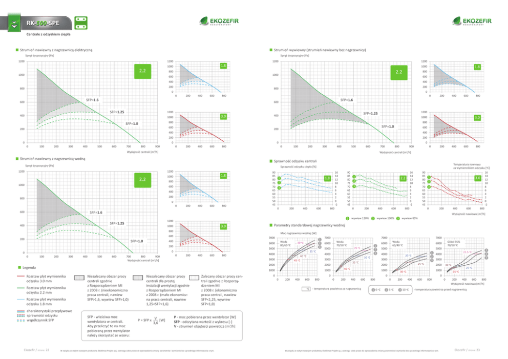 RK-500-SPE Centrale z odzyskiem ciepła Strumień nawiewny z nagrzewnicą elektryczną Strumień wywiewny (strumień nawiewny bez nagrzewnicy) Spręż dyspozycyjny [Pa] Spręż dyspozycyjny [Pa] 1200 1200 2.2 1000 1.8 1000 800 1200 1200 2.2 1000 600 800 600 400 400 200 800 600 0 200 400 600 0 800 1200 3.0 1000 0 SFP=1.6 600 SFP=1.25 400 200 800 0 SFP=1.6 SFP=1.0 600 100 200 300 400 500 600 700 800 SFP=1.0 400 200 400 600 800 0 0 100 200 300 400 500 600 700 Wydajność centrali [m3/h] 200 400 1200 1.8 1000 2.2 800 1000 600 400 200 800 0 0 200 400 600 800 90 85 80 75 70 65 60 55 50 45 3 1200 3.0 1000 SFP=1.0 400 600 700 800 900 Wydajność centrali [m3/h] Woda 80/60 oC 5000 0 200 400 600 800 1 2 3 30 oC 35 oC 4000 40 oC 45 oC 3000 Legenda Rozstaw płyt wymiennika odzysku 1.8 mm charakterystyki przepływowe sprawności odzysku współczynnik SFP 3 200 400 Niezalecany obszar pracy centrali zgodnie z Rozporządzeniem MI z 2008 r. (nieekonomiczna praca centrali, nawiew SFP>1,6, wywiew SFP>1,0) SFP - właściwa moc wentylatora w centrali. Aby przeliczyć to na moc pobieraną przez wentylator należy skorzystać ze wzoru: Niezalecany obszar pracy centrali dla prostej instalacji wentylacji zgodnie z Rozporządzeniem MI z 2008 r. (mało ekonomiczna praca centrali, nawiew 1,25<SFP<1,6) V [W] P = SFP x ___ 3,6 wywiew 120% 600 wywiew 100% 2 Zalecany obszar pracy centrali zgodnie z Rozporządzeniem MI z 2008 r. (ekonomiczna praca centrali, nawiew SFP<1,25, wywiew SFP<1,0) 7000 90 85 80 75 70 65 60 55 50 45 800 1 2 3 0 200 3 wywiew 80% 7000 Woda 70/50 oC 6000 5000 25 C 30 oC 200 400 600 o C 800 5000 4000 40 oC 5000 20 C o 25 oC 1000 1 2 3 200 400 600 - temperatura powietrza za nagrzewnicą 800 1 0 oC 21.5 oC 4000 3000 2000 30 oC 1000 30 oC 0 0 Glikol 35% 70/50 oC 6000 2000 0 0 7000 Woda 60/40 oC 6000 3000 35 oC 1000 0 1 2 3 o 4000 2000 1000 Rozstaw płyt wymiennika odzysku 2.2 mm 2.2 0 3000 2000 Rozstaw płyt wymiennika odzysku 3.0 mm 800 16 14 12 10 8 6 4 2 0 -2 Parametry standardowej nagrzewnicy wodnej 6000 0 0 500 600 7000 200 400 400 1 2 Moc nagrzewnicy wodnej [W] 600 200 300 200 90 85 80 75 70 65 60 55 50 45 1 800 200 800 Wydajność nawiewu [m3/h] SFP=1.25 400 16 14 12 10 8 6 4 2 0 -2 1.8 1 2 0 SFP=1.6 600 600 Temperatura nawiewu za wymiennikiem odzysku [oC] 16 14 3.0 12 10 8 6 4 2 0 -2 400 600 800 Sprawność odzysku ciepła [%] 1200 Ekozefir / strona: 22 0 900 Sprawność odzysku centrali Spręż dyspozycyjny [Pa] 100 800 Wydajność centrali [m3/h] Strumień nawiewny z nagrzewnicą wodną 0 3.0 600 0 0 900 800 200 0 0 600 800 200 0 400 1000 200 400 200 1200 SFP=1.25 400 800 200 1.8 1000 35 oC 25 oC 0 0 2 5 oC 200 400 3 10 oC 600 800 0 200 400 600 800 Wydajność nawiewu [m3/h] - temperatura powietrza przed nagrzewnicą P - moc pobierana przez wentylator [W] SFP - odczytana wartość z wykresu [-] V - strumień objętości powietrza [m3/h] W związku ze stałym rozwojem produktów, Ekoklimax-Projekt sp.j. zastrzega sobie prawo do wprowadzenia zmiany parametrów i wymiarów bez uprzedniego informowania o tym. 1 2 3 W związku ze stałym rozwojem produktów, Ekoklimax-Projekt sp.j. zastrzega sobie prawo do wprowadzenia zmiany parametrów i wymiarów bez uprzedniego informowania o tym. Ekozefir / strona: 23