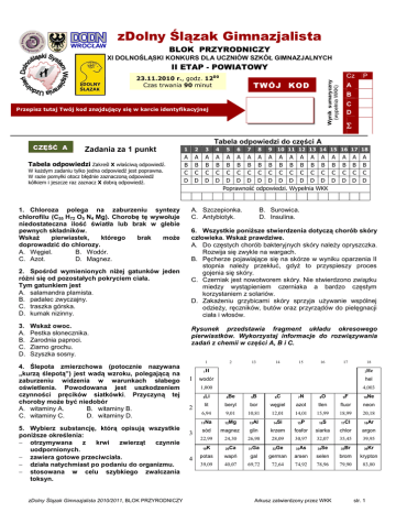 zDolny Ślązak Gimnazjalista BLOK PRZYRODNICZY XI DOLNOŚLĄSKI KONKURS DLA UCZNIÓW SZKÓŁ GIMNAZJALNYCH II ETAP - POWIATOWY Wynik sumaryczny (wypełnia WKK) Cz 23.11.2010 r., godz. 1200 Czas trwania 90 minut TWÓJ KOD Przepisz tutaj Twój kod znajdujący się w karcie identyfikacyjnej P A B C D ∑ Tabela odpowiedzi do części A CZĘŚĆ A Zadania za 1 punkt Tabela odpowiedzi Zakreśl X właściwą odpowiedź. W kaŜdym zadaniu tylko jedna odpowiedź jest poprawna. W razie pomyłki otocz błędnie zaznaczoną odpowiedź kółkiem i jeszcze raz zaznacz X dobrą odpowiedź. 1. Chloroza polega na zaburzeniu syntezy chlorofilu (C55 H72 O5 N4 Mg). Chorobę tę wywołuje niedostateczna ilość światła lub brak w glebie pewnych składników. WskaŜ pierwiastek, którego brak moŜe doprowadzić do chlorozy. A. Węgiel. B. Wodór. C. Azot. D. Magnez. 2. Spośród wymienionych niŜej gatunków jeden róŜni się od pozostałych pokryciem ciała. Tym gatunkiem jest A. salamandra plamista. B. padalec zwyczajny. C. traszka górska. D. kumak nizinny. 3. A. B. C. D. WskaŜ owoc. Pestka słonecznika. Zarodnia paproci. Ziarno grochu. Szyszka sosny. 4. Ślepota zmierzchowa (potocznie nazywana „kurzą ślepotą”) jest wadą wzroku, polegającą na zaburzeniu widzenia w warunkach słabego oświetlenia. Powodowana jest uszkodzeniem czynności pręcików siatkówki. Przyczyną tej choroby moŜe być niedobór A. witaminy A. B. witaminy B. C. witaminy C. D. witaminy D. 5. Wybierz substancję, którą opisują wszystkie poniŜsze określenia: − otrzymywana z krwi zwierząt czynnie uodpornionych. − zawiera gotowe przeciwciała. − działa natychmiast po podaniu do organizmu. − stosowana w celu szybkiego zwalczania toksyn. zDolny Ślązak Gimnazjalista 2010/2011, BLOK PRZYRODNICZY 1 2 3 4 A B C D A B C D A B C D A B C D 5 6 7 8 A A A B B B C C C D D D Poprawność 9 10 11 12 13 14 15 16 17 18 A A A B B B C C C D D D odpowiedzi. A. Szczepionka. C. Antybiotyk. A A A A B B B B C C C C D D D D Wypełnia WKK A B C D A B C D A B C D A B C D B. Surowica. D. Insulina. 6. Wszystkie poniŜsze stwierdzenia dotyczą chorób skóry człowieka. WskaŜ prawdziwe. A. Do częstych chorób bakteryjnych skóry naleŜy opryszczka. Rozwija się zwykle na wargach. B. Pęcherze pojawiające się na skórze w wyniku oparzenia II stopnia naleŜy przekłuć, gdyŜ to przyspieszy proces gojenia się skóry. C. Czerniak jest nowotworem skóry. Nie stwierdzono związku miedzy wystąpieniem czerniaka a bardzo częstym korzystaniem z solariów. D. ZakaŜeniu grzybicami skóry sprzyja uŜywanie wspólnej odzieŜy, ręczników, butów oraz przyrządów do pielęgnacji ciała i włosów. Rysunek przedstawia fragment układu okresowego pierwiastków. Wykorzystaj informacje do rozwiązywania zadań z chemii w części A, B i C. 1 2 13 14 15 16 17 1H 1 2 3 4 18 2He wodór hel 1,000 4,003 3Li 4Be 5B 6C 7N 8O 9F 10Ne lit beryl bor węgiel azot tlen fluor neon 6,94 9,01 10,81 12,01 14,01 15,99 18,99 20,18 11Na 12Mg 13Al 14Si 15P 16S 17Cl 18Ar sód magnez glin krzem fosfor siarka chlor argon 22,99 24,30 26,98 28,09 30,97 32,07 35,45 39,95 19K 20Ca 31Ga 32Ge 33As 34Se 35Br 36Kr potas wapń gal german arsen selen brom krypton 39,09 40,07 69,72 72,64 74,92 78,96 79,90 83,80 Arkusz zatwierdzony przez WKK str. 1 Przepisz tutaj Twój kod znajdujący się w karcie identyfikacyjnej 7. Spośród podanych tlenków: SO2 , SO3 , CO, CO2 , FeO, Fe2 O3 , ZnO, Al 2 O3 wybierz te, o których mowa kolejno w punktach 1, 2 i 3. 1. Pierwiastek tworzący ten tlenek ma trzy elektrony walencyjne i trzy powłoki elektronowe. 2. Pierwiastek tworzący ten tlenek ma masę atomową 12 u, a tlenek jest składnikiem powietrza. 3. Pierwiastek tworzący ten tlenek ma maksymalną wartościowość VI, a masa cząsteczkowa tlenku jest równa 80 u. Tlenek Odp. 1. 2. 3. A. Al 2 O3 SO3 B. C. Al 2 O3 ZnO CO CO2 SO3 D. FeO CO2 CO SO3 SO3 8. Stosunek masy miedzi do masy tlenu w tlenku miedzi (II) wynosi. A. 4 : 1 B. 4 : 5 C. 2 : 1 D. 2 : 5 Wykorzystaj dane z tabeli do rozwiązania zadań 9. i 10. Wybierz właściwe dokończenia zdań w tych zadaniach. Temperatura [0C] 0 10 20 30 40 50 60 Rozpuszczalność [g KNO3/100 g H2O] 20 25 35 48 64 85 110 9. Nasycony roztwór azotanu (V) potasu 0 w temperaturze 50 C, Jacek ochłodził do 0 temperatury 20 C i zaobserwował, Ŝe wykrystalizowało A. 35 g soli. B. 50 g soli. C. 85 g soli D. 30 g soli 10. Nasycony roztwór azotanu 0 temperaturze 20 C ma stęŜenie A. 25,9% B. 35% C. 45,9% D. 85% (V) 11. Wodór tworzy trzy izotopy: prot 2 1 potasu 1 1 w H , deuter 3 1 H i tryt H . W jądrze deuteru występują: A. B. C. D. 2 protony i 1 neutron, 1 neutron i 2 protony 1 proton i 1 neutron, 1 proton i 1 elektron. 12. Tabela zawiera zapis obserwacji dokonanych przez Jacka w doświadczeniu: Badanie właściwości poznanych gazów. Które z badanych gazów – amoniak, tlenek węgla (IV), siarkowodór – znajdują się w probówkach oznaczonych numerami 1, 2, 3? zDolny Ślązak Gimnazjalista 2010/2011, BLOK PRZYRODNICZY Nr prob. Zabarwienie wyciągu z czerwonej kapusty 1. czerwona 2. zielona 3. czerwona CO2 , H 2 S , NH 3 C. H 2 S , NH 3 , CO2 A. Woda wapienna Zapach zmętnienie bez zapachu brak objawów reakcji brak objawów reakcji ostry, charakterystyczny ostry, charakterystyczny CO2 , NH 3 , H 2 S D. H 2 S , CO2 , NH 3 B. 13. Zaćmienie KsięŜyca ma miejsce wtedy, gdy A. KsięŜyc jest w nowiu. B. KsięŜyc ustawiony jest w jednej linii pomiędzy Ziemią a Słońcem. C. Słońce ustawione jest w jednej linii pomiędzy Ziemią a KsięŜycem. D. Ziemia ustawiona jest w jednej linii pomiędzy Słońcem a KsięŜycem. 14. Spośród zaznaczonych punktów (X, Y, W, Z) wskaŜ wszystkie, które leŜą w tej samej strefie czasowej. A. B. C. D. X, Y, Z X, W, Z X, Y X, Z 15. Wybierz prawidłowe zakończenie zdania: Skala 1:20 000 oznacza, Ŝe A. 1 cm na mapie to 2 km w terenie. B. odległość w terenie jest 20 000 razy mniejsza od odległości na ma