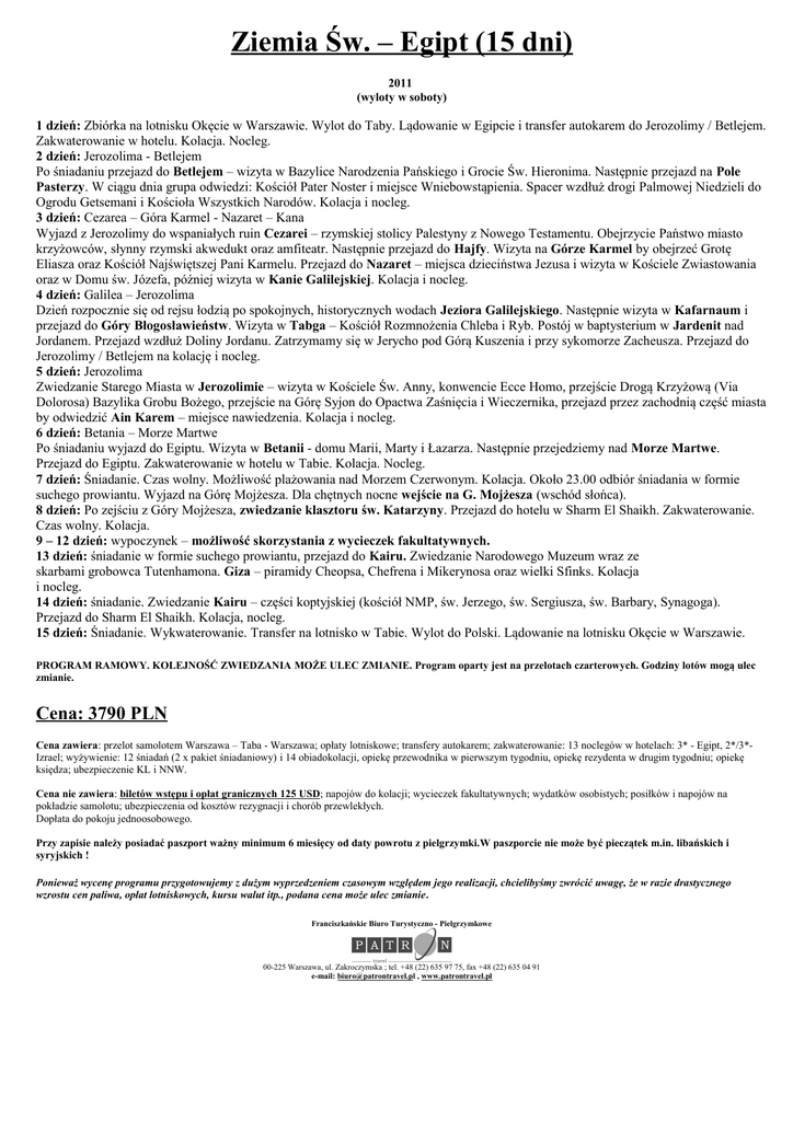 Ziemia Św. – Egipt (15 dni) 2011 (wyloty w soboty) 1 dzień: Zbiórka na lotnisku Okęcie w Warszawie. Wylot do Taby. Lądowanie w Egipcie i transfer autokarem do Jerozolimy / Betlejem. Zakwaterowanie w hotelu. Kolacja. Nocleg. 2 dzień: Jerozolima - Betlejem Po śniadaniu przejazd do Betlejem – wizyta w Bazylice Narodzenia Pańskiego i Grocie Św. Hieronima. Następnie przejazd na Pole Pasterzy. W ciągu dnia grupa odwiedzi: Kościół Pater Noster i miejsce Wniebowstąpienia. Spacer wzdłuż drogi Palmowej Niedzieli do Ogrodu Getsemani i Kościoła Wszystkich Narodów. Kolacja i nocleg. 3 dzień: Cezarea – Góra Karmel - Nazaret – Kana Wyjazd z Jerozolimy do wspaniałych ruin Cezarei – rzymskiej stolicy Palestyny z Nowego Testamentu. Obejrzycie Państwo miasto krzyżowców, słynny rzymski akwedukt oraz amfiteatr. Następnie przejazd do Hajfy. Wizyta na Górze Karmel by obejrzeć Grotę Eliasza oraz Kościół Najświętszej Pani Karmelu. Przejazd do Nazaret – miejsca dzieciństwa Jezusa i wizyta w Kościele Zwiastowania oraz w Domu św. Józefa, później wizyta w Kanie Galilejskiej. Kolacja i nocleg. 4 dzień: Galilea – Jerozolima Dzień rozpocznie się od rejsu łodzią po spokojnych, historycznych wodach Jeziora Galilejskiego. Następnie wizyta w Kafarnaum i przejazd do Góry Błogosławieństw. Wizyta w Tabga – Kościół Rozmnożenia Chleba i Ryb. Postój w baptysterium w Jardenit nad Jordanem. Przejazd wzdłuż Doliny Jordanu. Zatrzymamy się w Jerycho pod Górą Kuszenia i przy sykomorze Zacheusza. Przejazd do Jerozolimy / Betlejem na kolację i nocleg. 5 dzień: Jerozolima Zwiedzanie Starego Miasta w Jerozolimie – wizyta w Kościele Św. Anny, konwencie Ecce Homo, przejście Drogą Krzyżową (Via Dolorosa) Bazylika Grobu Bożego, przejście na Górę Syjon do Opactwa Zaśnięcia i Wieczernika, przejazd przez zachodnią część miasta by odwiedzić Ain Karem – miejsce nawiedzenia. Kolacja i nocleg. 6 dzień: Betania – Morze Martwe Po śniadaniu wyjazd do Egiptu. Wizyta w Betanii - domu Marii, Marty i Łazarza. Następnie przejedziemy nad Morze Martwe. Przejazd do Egiptu. Zakwaterowanie w hotelu w Tabie. Kolacja. Nocleg. 7 dzień: Śniadanie. Czas wolny. Możliwość plażowania nad Morzem Czerwonym. Kolacja. Około 23.00 odbiór śniadania w formie suchego prowiantu. Wyjazd na Górę Mojżesza. Dla chętnych nocne wejście na G. Mojżesza (wschód słońca). 8 dzień: Po zejściu z Góry Mojżesza, zwiedzanie klasztoru św. Katarzyny. Przejazd do hotelu w Sharm El Shaikh. Zakwaterowanie. Czas wolny. Kolacja. 9 – 12 dzień: wypoczynek – możliwość skorzystania z wycieczek fakultatywnych. 13 dzień: śniadanie w formie suchego prowiantu, przejazd do Kairu. Zwiedzanie Narodowego Muzeum wraz ze skarbami grobowca Tutenhamona. Giza – piramidy Cheopsa, Chefrena i Mikerynosa oraz wielki Sfinks. Kolacja i nocleg. 14 dzień: śniadanie. Zwiedzanie Kairu – części koptyjskiej (kościół NMP, św. Jerzego, św. Sergiusza, św. Barbary, Synagoga). Przejazd do Sharm El Shaikh. Kolacja, nocleg. 15 dzień: Śniadanie. Wykwaterowanie. Transfer na lotnisko w Tabie. Wylot do Polski. Lądowanie na lotnisku Okęcie w Warszawie. PROGRAM RAMOWY. KOLEJNOŚĆ ZWIEDZANIA MOŻE ULEC ZMIANIE. Program oparty jest na przelotach czarterowych. Godziny lotów mogą ulec zmianie. Cena: 3790 PLN Cena zawiera: przelot samolotem Warszawa – Taba - Warszawa; opłaty lotniskowe; transfery autokarem; zakwaterowanie: 13 noclegów w hotelach: 3* - Egipt, 2*/3*Izrael; wyżywienie: 12 śniadań (2 x pakiet śniadaniowy) i 14 obiadokolacji, opiekę przewodnika w pierwszym tygodniu, opiekę rezydenta w drugim tygodniu; opiekę księdza; ubezpieczenie KL i NNW. Cena nie zawiera: biletów wstępu i opłat granicznych 125 USD; napojów do kolacji; wycieczek fakultatywnych; wydatków osobistych; posiłków i napojów na pokładzie samolotu; ubezpieczenia od kosztów rezygnacji i chorób przewlekłych. Dopłata do pokoju jednoosobowego. Przy zapisie należy posiadać paszport ważny minimum 6 miesięcy od daty powrotu z pielgrzymki.W paszporcie nie może być pieczątek m.in. libańskich i syryjskich ! Ponieważ wycenę programu przygotowujemy z dużym wyprzedzeniem czasowym względem jego realizacji, chcielibyśmy zwrócić uwagę, że w razie drastycznego wzrostu cen paliwa, opłat lotniskowych, kursu walut itp., podana cena może ulec zmianie. Franciszkańskie Biuro Turystyczno - Pielgrzymkowe 00-225 Warszawa, ul. Zakroczymska ; tel. +48 (22) 635 97 75, fax +48 (22) 635 04 91 e-mail: [email protected] , www.patrontravel.pl