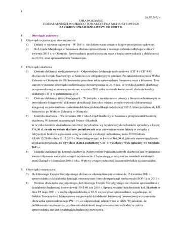 1 20.III.2012 r. SPRAWOZDANIE Z DZIAŁALNOŚCI POLSKIEGO TOWARZYSTWA METEORYTOWEGO ZA OKRES SPRAWOZDAWCZY 2011/2012 R. I. 1. Obowiązki ustawowe Obowiązki rejestracyjne stowarzyszenia 1) Zmiany w rejestrze sądowym – W 2011 r. nie dokonywano zmian w krajowym rejestrze sądowym. 2) Do Urzędu Miejskiego w Sosnowcu złożono sprawozdanie z walnego zebrania odbytego w dniu 9 kwietnia 2011 r. w Olsztynie. Sprawozdanie przesłano pocztą wraz z kopią sprawozdania z działalności za 2010 r. oraz sprawozdaniem finansowym. 2. Obowiązki skarbowe 3) Złożenie deklaracji rozliczeniowych – Odpowiednie deklaracje rozliczeniowe (CIT-8 i CIT-8/O) złożono do Urzędu Skarbowego w Sosnowcu w obligatoryjnym terminie. Po zatwierdzeniu przez Walne Zebranie w Olsztynie do US Sosnowiec przesłano także sprawozdanie finansowe wraz z bilansem. Tym samym wykonano obowiązki rozliczeniowe stowarzyszenia za 2010 rok. W wyniku kontroli skarbowej przeprowadzonej w stowarzyszeniu we wrześniu 2011 roku zaistniała konieczność złożenia korekty deklaracji CIT-8 w październiku 2011. 4) Złożenie deklaracji identyfikacyjnych – W związku z rozwiązaniem umowy z biurem rachunkowym na prowadzenie księgowości dokonano aktualizacji danych o miejscu przechowywania dokumentacji księgowej co potwierdzono złożeniem deklaracji identyfikacji podatkowej NIP-2, które przesłano do US Sosnowiec po Walnym Zebraniu w Olsztynie. 5) Kontrola skarbowa – We wrześniu 2011 roku Urząd Skarbowy w Sosnowcu przeprowadził kontrolę skarbową. W kontroli uczestniczyli Prezes i Skarbnik. W wyniku kontroli stwierdzono zaniżenie przychodów wg wystawionych rachunków sprzedaży o kwotę 376,00 zł, co nie wywołało skutków podatkowych oraz zakwestionowano fakturę w związku z faktycznym brakiem wykonania usług w zakresie ewidencji rachunkowej roku 2010 (faktura BR/68/12/2010 z dnia 13.12.2010 r. biura księgowego) w kwocie 366,00 zł, jako nie stanowiącą kosztu uzyskania przychodu, co wywołało skutek podatkowy CIT w wysokości 70 zł, opłacony we wrześniu 2011 r. 6) Złożenie deklaracji po kontroli skarbowej. Pozytywnym wynikiem kontroli skarbowej jest wyjaśnienie kwestii zbywania nadwyżki naszych wydawnictw. Chętni mogą je nabywać na zasadach ustalonych przez Zarząd w listopadzie 20011 roku. Wpływy z tego tytułu choć jeszcze niewielkie są zauważalne. 3. Obowiązki statystyczne 7) Do Głównego Urzędu Statystycznego złożono w obowiązkowym terminie do 15 kwietnia 2011 r. sprawozdanie z działalności fundacji, stowarzyszeń i innych organizacji społecznych (SOF-1) za 2010 r. 8) Pomimo obowiązku statystycznego, do Głównego Urzędu Statystycznego nie złożono sprawozdania z działalności badawczej i rozwojowej (PNT-01) za 2010 r. Sprawę wyjaśnił telefonicznie kol. Skarbnik w dniu 19 maja 2011 r. z osobą odpowiedzialną w GUS za powyższe sprawozdanie, uzgadniając, że Polskie Towarzystwo Meteorytowe nie prowadzi działalności badawczej i rozwojowej w rozumieniu obowiązku sprawozdawczego PNT-01, co odpowiednio odnotowano w GUS. Wyjaśniono, że publikowanie wydawnictw, a tylko taka działalność mogła ewentualnie wchodzić w zakres sprawozdania, nie jest działalnością badawczo-rozwojową. 2 9) Do Urzędu Miejskiego w Sosnowcu złożono w marcu 2011 r. sprawozdanie z działalności organizacji pozarządowych w związku z tworzeniem Sosnowieckiej Bazy Organizacji Pozarządowych. 4. Pozostałe obowiązki ustawowe 10) Wykorzystanie numerów ISBN – W roku 2011 nie wykorzystywano międzynarodowego znormalizowanego numeru książki (ISBN). Do roku 2011 r. wykorzystano następujące numery ISBN: 978-83-921834-0-1 Materiały III Seminarium Meteorytowego, Olsztyn 2005 978-83-921834-1-9 Bibliografia meteorytyki polskiej co ustalono w Bibliotece Narodowej. W przypadku edycji dalszych wydawnictw należy wykorzystywać kolejne numery ISBN. 11) Wyjaśniono zasady użycia przez PTMet numeru ISSN 2080-5497 dla Rocznika Polskiego Towarzystwa Meteorytowego, którego woluminy 1 i 2 zostały wydrukowane z błędnym oznaczeniem numerem ISBN. Przed rozesłaniem egzemplarza obowiązkowego woluminu 2 dokonano zaklejenia błędnego numeru poprawnym numerem ISSN. 12) Rozesłanie książek i czasopism egzemplarza obowiązkowego – w 2011 r. rozesłano do bibliotek objętych egzemplarzem obowiązkowym: ISSN 2080-5497 Acta Societatis Metheoriticae Polonorum, ROCZNIK PTMet vol. 2, 2011 978-83-921834-1-9 Bibliografia meteorytyki polskiej II. 5. Obowiązki statutowe Sprawozdanie z wykonywania uchwał Walnego Zebrania Stowarzyszenia, 13) Po Walnym Zebraniu w Olsztynie opublikowano w formie elektronicznej komunikat o wynikach obrad. Ponadto ogłoszono na stronach internetowych treść przyjętych sprawozdań i uchwał. 14) Rozesłano Komunikaty – nr 78, 79, 80 i 81 dotyczące bieżącej działalności Towarzystwa (kopie komunikatów umieszczono na stronach internetowych PTMet i dołączono do Sprawozdania). 6. Sprawozdanie z czynności kierowania całokształtem działalności statutowej Stowarzyszenia. 15) W dniu 16 lipca 2011 r. z inicjatywy kol. Marcina Cimały odbył się piknik meteorytowy w Dzięgielowie. Spotkanie wykorzystano również do spotkania członków Zarządu i Komisji Rewizyjnej, na którym omówiono bieżące sprawy stowarzyszenia. 16) W sierpniu kolega Sekretarz, wykonując pracę Redaktora naszego Rocznika, przekazał do druku „Bibliografię meteorytyki polskiej” autorstwa naszych członków: Jadwigi Białej i Andrzeja Maneckiego Bibliografia ukazała się nakładem Polskiego Towarzystwa Meteorytowego. 17) W uznaniu zasług oraz wykonując cele statutowe stowarzyszenia poprzez organizowanie wyjazdów na krajowe i zagraniczne giełdy minerałów i meteorytów oraz organizowanie sympozjów i konferencji naukowych delegowano Redaktora METEORYT-u Andrzeja Pilskiego na 74th Annual Meeting of the Meteoritical Society w Londynie w dniach 8-12 sierpnia 2011 finansując opłatę konferencyjną 