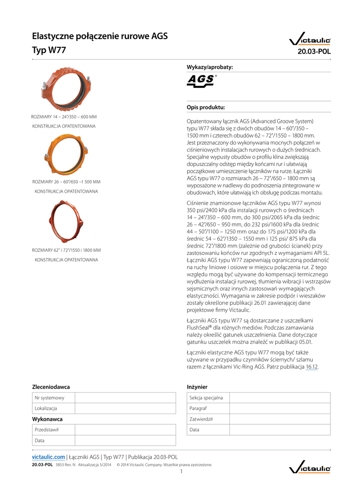 Elastyczne połączenie rurowe AGS Typ W77 20.03-POL Wykazy/aprobaty: Opis produktu: ROZMIARY 14 – 24”/350 – 600 MM Opatentowany łącznik AGS (Advanced Groove System) typu W77 składa się z dwóch obudów 14 – 60”/350 – 1500 mm i czterech obudów 62 – 72”/1550 – 1800 mm. Jest przeznaczony do wykonywania mocnych połączeń w ciśnieniowych instalacjach rurowych o dużych średnicach. Specjalne wypusty obudów o profilu klina zwiększają dopuszczalny odstęp między końcami rur i ułatwiają początkowe umieszczenie łączników na rurze. Łączniki AGS typu W77 o rozmiarach 26 – 72”/650 – 1800 mm są wyposażone w nadlewy do podnoszenia zintegrowane w obudowach, które ułatwiają ich obsługę podczas montażu. KONSTRUKCJA OPATENTOWANA ROZMIARY 26 – 60”/650 –1 500 MM KONSTRUKCJA OPATENTOWANA Ciśnienie znamionowe łączników AGS typu W77 wynosi 350 psi/2400 kPa dla instalacji rurowych o średnicach 14 – 24”/350 – 600 mm, do 300 psi/2065 kPa dla średnic 26 – 42”/650 – 950 mm, do 232 psi/1600 kPa dla średnic 44 – 50”/1100 – 1250 mm oraz do 175 psi/1200 kPa dla średnic 54 – 62”/1350 – 1550 mm i 125 psi/ 875 kPa dla średnic 72”/1800 mm (zależnie od grubości ścianek) przy zastosowaniu końców rur zgodnych z wymaganiami API 5L. Łączniki AGS typu W77 zapewniają ograniczoną podatność na ruchy liniowe i osiowe w miejscu połączenia rur. Z tego względu mogą być używane do kompensacji termicznego wydłużenia instalacji rurowej, tłumienia wibracji i wstrząsów sejsmicznych oraz innych zastosowań wymagających elastyczności. Wymagania w zakresie podpór i wieszaków zostały określone publikacji 26.01 zawierającej dane projektowe firmy Victaulic. ROZMIARY 62” i 72”/1550 i 1800 MM KONSTRUKCJA OPATENTOWANA Łączniki AGS typu W77 są dostarczane z uszczelkami FlushSeal® dla różnych mediów. Podczas zamawiania należy określić gatunek uszczelnienia. Dane dotyczące gatunku uszczelek można znaleźć w publikacji 05.01. Łączniki elastyczne AGS typu W77 mogą być także używane w przypadku czynników ściernych/ szlamu razem z łącznikami Vic-Ring AGS. Patrz publikacja 16.12. Zleceniodawca Inżynier Nr systemowy Sekcja specjalna Lokalizacja Paragraf Wykonawca Zatwierdził Przedstawił Data Data victaulic.com | Łączniki AGS | Typ W77 | Publikacja 20.03-POL 20.03-POL 3853 Rev. N Aktualizacja 5/2014 © 2014 Victaulic Company. Wszelkie prawa zastrzeżone. 1 victaulic.com | Łączniki AGS | Typ W77 | Publikacja 20.03-POL Specyfikacje materiałowe: Śruby: Obudowa: Obrobiona cieplnie platerowana stal węglowa, głowica prowadząca spełnia wymagania fizyczne i chemiczne normy ASTM A-449 oraz wymagania fizyczne normy ASTM A-183. Żeliwo sferoidalne zgodne z ASTM A-536, gatunek 65-45-12. Żeliwo sferoidalne zgodne z ASTM A-395, gatunek 65-45-15, dostępne jest na specjalne życzenie. Nakrętki: Powłoka obudowy: (określić rodzaj) Stal węglowa w powłoce, wzmocniony łeb, zgodne z normą ASTM A-563, gatunek B. Standardowa: emalia pomarańczowa Opcjonalnie: cynkowana ogniowo i inne Dla rozmiarów 26 – 72”/650 – 1800 mm Uszczelka łącznika: (określić rodzaj 1) Podkładki: FlushSeal, EPDM, gatunek „E” Stal węglowa w powłoce, płaskie, wysoka wytrzymałość SAE, zgodnie z normą ASTM F-436. EPDM (kod koloru — zielony). Zakres temperatur od –30°F do +230°F/od –34°C do +110°C. Zalecany do zimnej i gorącej wody w określonym zakresie temperatur oraz różnych rozcieńczonych kwasów, powietrza pozbawionego oleju i wielu czynników chemicznych. Spełnia wymagania dla klasy UL zgodnie z normą ANSI/NSF 61 dla zimnej wody pitnej o temperaturze +86°F/+30°C oraz gorącej wody pitnej o temperaturze +180°F/+82°C. NIEZALECANY DO CZYNNIKÓW NAFTOWYCH. Kauczuk nitrylowy, gatunek „T” Kauczuk nitrylowy (kod koloru — pomarańczowy). Zakres temperatur od –20°F do +180°F/od –29°C do +82°C. Zalecany do produktów naftowych, powietrza z oparami oleju, olejów roślinnych i mineralnych w określonym zakresie temperatur. Niezalecany do gorącej wody o temperaturze ponad +150°F/ +66°C oraz gorącego suchego powietrza o temperaturze ponad +140°F/+60°C. Silikon, gatunek „L” Silikon (kod koloru — czerwony). Zakres temperatur od –30°F do +350°F/od –34°C do +177°C. Zalecany do suchego, gorącego powietrza bez węglowodorów do temperatury +350°F/+177°C i niektórych chemikaliów. Wymienione czynniki stanowią tylko ogólne zalecenia. Należy pamiętać, że istnieją czynniki, dla których te uszczelnienia nie są zalecane. W przypadku konkretnych czynników i uszczelnień zawsze należy odwołać się do najnowszych zaleceń w Przewodniku doboru uszczelek, aby uzyskać wykaz niezalecanych czynników. 1 OSTRZEŻENIE • Do rowkowania rur w celu zamontowania produktów AGS należy używać narzędzi firmy Victaulic do walcowania rowków, które są wyposażone w specjalne zestawy walców Victaulic AGS (RW do rur stalowych lub RWX do rur ze stali nierdzewnej). • Walce do rowkowania RWX są oznaczone kolorem srebrnym i napisem „RWX” z przodu. • Produktów Victaulic z rowkami AGS NIE MOŻNA montować na rurach przygotowanych za pomocą zestawu walców do oryginalnych rowków. • Aby zapewnić właściwe przygotowanie końcowego odcinka rury, patrz publikacja 25.09 – specyfikacje dla rowków walcowanych AGS (Advanced Groove System). • Niezastosowanie się do tych instrukcji spowoduje wykonanie rowków niespełniających wymagań firmy Victaulic dla rowków w standardzie AGS i w rezultacie uszkodzenie połączenia, poważne obrażenia ciała i zniszczenie mienia. Podczas przygotowywania rur dla produktów AGS należy skontaktować się z firmą Victaulic w celu uzyskania specyfikacji dla wymiarów rowków AGS. 20.03-POL 3853 Rev. N Aktualizacja 5/2014 victaulic.com © 2014 Victaulic Company. Wszelkie prawa zastrzeżone. 2 victaulic.com | Łączniki AGS | Typ W77 | Publi