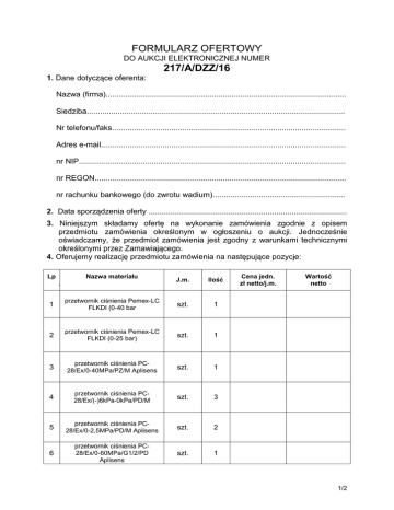 FORMULARZ OFERTOWY DO AUKCJI ELEKTRONICZNEJ NUMER 217/A/DZZ/16 1. Dane dotyczące oferenta: Nazwa (firma)............................................................................................................. Siedziba..................................................................................................................... Nr telefonu/faks.......................................................................................................... Adres e-mail............................................................................................................... nr NIP......................................................................................................................... nr REGON.................................................................................................................. nr rachunku bankowego (do zwrotu wadium)............................................................ 2. Data sporządzenia oferty .......................................................................................... 3. Niniejszym składamy ofertę na wykonanie zamówienia zgodnie z opisem przedmiotu zamówienia określonym w ogłoszeniu o aukcji. Jednocześnie oświadczamy, że przedmiot zamówienia jest zgodny z warunkami technicznymi określonymi przez Zamawiającego. 4. Oferujemy realizację przedmiotu zamówienia na następujące pozycje: Lp Nazwa materiału . J.m. Ilość 1 przetwornik ciśnienia Pemex-LC FLKDI (0-40 bar szt. 1 2 przetwornik ciśnienia Pemex-LC FLKDI (0-25 bar) szt. 1 3 przetwornik ciśnienia PC28/Ex/0-40MPa/PZ/M Aplisens szt. 1 4 przetwornik ciśnienia PC28/Ex/(-)6kPa-0kPa/PD/M szt. 3 5 przetwornik ciśnienia PC28/Ex/0-2,5MPa/PD/M Aplisens szt. 2 6 przetwornik ciśnienia PC28/Ex/0-60MPa/G1/2/PD Aplisens szt. 1 Cena jedn. zł netto/j.m. Wartość netto 1/2 Lp Nazwa materiału . J.m. Ilość 7 przetwornik ciśnienia PC28/Ex/0-25MPa/PD/M Aplisens szt. 1 8 sprzęgło stojaka przetwornika 8 0010 4D00 0000 szt. 1 9 przetwornik rezystancji RD trójprzewódowy 0-150°C, 420mA, PT100, na szynę TS 35obudowa listwowa szt. 6 10 przetwornik prędkości obrotowej MS24-112-R szt. 1 11 przetwornik różnicy ciśnienia APR-2000G PD/Ex/700...700Pa/C szt. 1 12 przetwornik ciśnienia PC-28/0,1÷1,6MPa/PD/M 10,5-36V 420mA szt. 1 Cena jedn. zł netto/j.m. Wartość netto Razem wartość netto: 5. Niniejszym udzielamy …………. miesięcy gwarancji jakości oferowanych materiałów. ………………………………… Miejscowość, data …………………………… Podpis upoważnionej osoby 2/2
