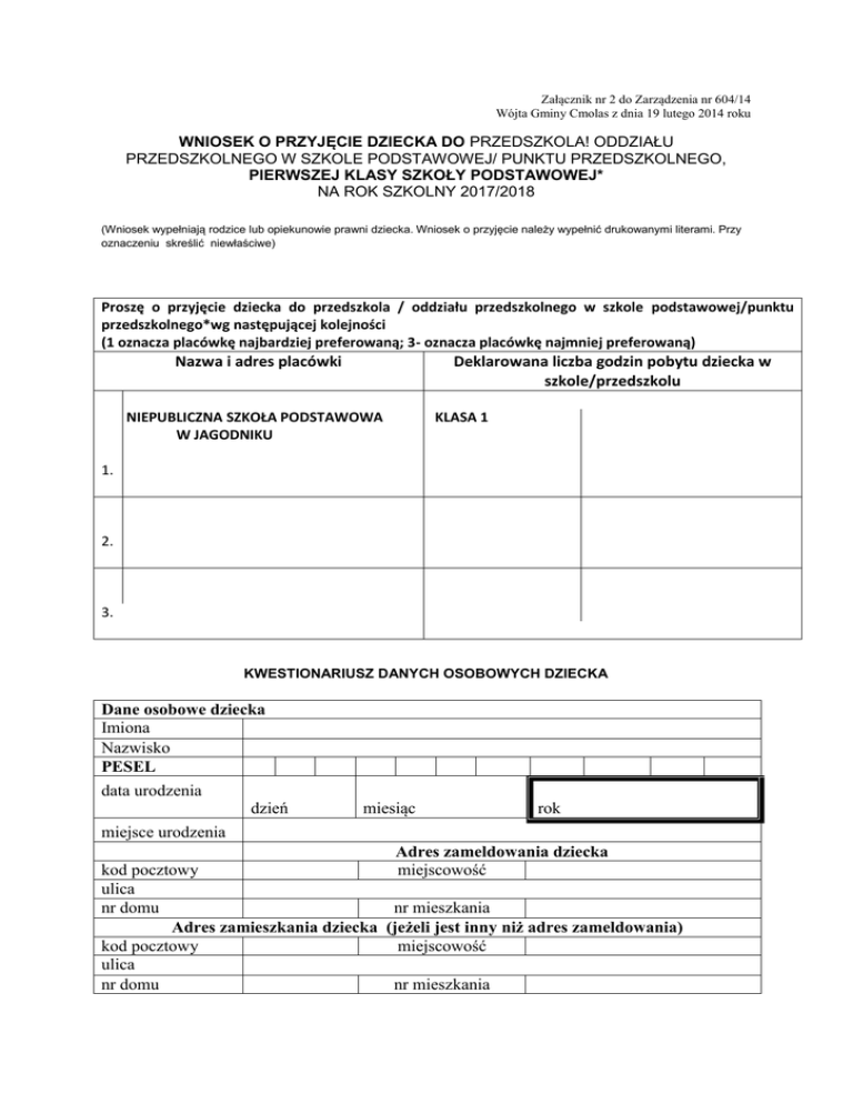 Załącznik nr 2 do Zarządzenia nr 604/14 Wójta Gminy Cmolas z dnia 19 lutego 2014 roku WNIOSEK O PRZYJĘCIE DZIECKA DO PRZEDSZKOLA! ODDZIAŁU PRZEDSZKOLNEGO W SZKOLE PODSTAWOWEJ/ PUNKTU PRZEDSZKOLNEGO, PIERWSZEJ KLASY SZKOŁY PODSTAWOWEJ* NA ROK SZKOLNY 2017/2018 (Wniosek wypełniają rodzice lub opiekunowie prawni dziecka. Wniosek o przyjęcie należy wypełnić drukowanymi literami. Przy oznaczeniu skreślić niewłaściwe) Proszę o przyjęcie dziecka do przedszkola / oddziału przedszkolnego w szkole podstawowej/punktu przedszkolnego*wg następującej kolejności (1 oznacza placówkę najbardziej preferowaną; 3- oznacza placówkę najmniej preferowaną) Nazwa i adres placówki Deklarowana liczba godzin pobytu dziecka w szkole/przedszkolu NIEPUBLICZNA SZKOŁA PODSTAWOWA W JAGODNIKU KLASA 1 1. 2. 3. KWESTIONARIUSZ DANYCH OSOBOWYCH DZIECKA Dane osobowe dziecka Imiona Nazwisko PESEL data urodzenia dzień miesiąc rok miejsce urodzenia Adres zameldowania dziecka kod pocztowy miejscowość ulica nr domu nr mieszkania Adres zamieszkania dziecka (jeżeli jest inny niż adres zameldowania) kod pocztowy miejscowość ulica nr domu nr mieszkania KWESTIONARIUSZ DANYCH OSOBOWYCH RODZICOW DZIECKA/ OPIEKUNÓW PRAWNYCH Dane osobowe matki/opiekunki prawnej Imię Nazwisko Adres zamieszkania kod pocztowy miejscowość ulica nr domu nr mieszkania gmina powiat numer komórkowy adres e-mail Miejsce zatrudnienia Nazwa firmy Adres firmy Telefon kontaktowy Dane osobowe ojca /opiekuna prawnego Imię Nazwisko Adres zamieszkania kod pocztowy miejscowość ulica nr domu nr mieszkania gmina powiat numer komórkowy adres e-mail Miejsce zatrudnienia Nazwa firmy Adres firmy Telefon kontaktowy KRYTERIA PRZYJĘĆ ( w przypadku spełnienia danego kryterium proszę wstawić X) Kryteria obowiązkowe (art. 20c ust. 2 ustawy z dnia 7 września 1991 r. o systemie oświaty (Oz.U. z 2004 r. nr 256, poz. 2572 ze zm.) 1. Wielodzietność rodziny kandydata Załącznik: oświadczenie o wielodzietności rodziny kandydata 2. Niepełnosprawność kandydata Załącznik: orzeczenie o potrzebie kształcenia specjalnego wydane ze względu na niepełnosprawność, orzeczenie o niepełnosprawności lub o stopniu niepełnosprawności lub orzeczenie równoważne w rozumieniu przepisów ustawy z dnia 27 sierpnia 1997 r. rehabilitacji zawodowej i społecznej oraz zatrudnianiu osób niepełnosprawnych. 3. Niepełnosprawność jednego z rodziców kandydata Załącznik: orzeczenie o niepełnosprawności lub o stopniu niepełnosprawności lub orzeczenie równoważne w rozumieniu przepisów ustawy z dnia 27 sierpnia 1997 r. rehabilitacji zawodowej i społecznej oraz zatrudnianiu osób niepełnosprawnych (Dz. U. z 2011 r. nr 127, poz. 721 ze zm.). 4. Niepełnosprawność obojga rodziców kandydata 5. Załącznik: orzeczenie o niepełnosprawności lub o stopniu niepełnosprawności lub orzeczenie równoważne w rozumieniu przepisów ustawy z dnia 27 sierpnia 1997 r. rehabilitacji zawodowej i społecznej oraz zatrudnianiu osób niepełnosprawnych (Dz. U. z 2011 r. nr 127, poz. 721 ze zm.). Niepełnosprawność rodzeństwa kandydata 6. Załącznik: orzeczenie o potrzebie kształcenia specjalnego wydane ze względu na niepełnosprawność, orzeczenie o niepełnosprawności lub o stopniu niepełnosprawności lub orzeczenie równoważne w rozumieniu przepisów ustawy z dnia 27 sierpnia 1997 r. rehabilitacji zawodowej i społecznej oraz zatrudnianiu Samotne wychowywanie kandydata w rodzinie 7. Załącznik: prawomocny wyrok sądu rodzinnego orzekający rozwód lub separację lub akt zgonu oraz oświadczenie o samotnym wychowywaniu dziecka oraz niewychowywaniu żadnego dziecka wspólnie z jego rodzicem). Objęcie kandydata pieczą zastępczą Załącznik: dokument potwierdzający objęcie dziecka pieczą zastępczą zgodnie z ustawą z dnia 9 czerwca 2011 r. o wspieraniu rodziny i systemie pieczy zastępczej Kryteria dodatkowe 1. Dziecko, którego oboje rodzice (prawni opiekunowie) pracują, uczą się w trybie dziennym, prowadzą gospodarstwo rolne lub pozarolniczą działalność 2. Załącznik: zaświadczenie o zatrudnieniu, o nauce w trybie dziennym, o prowadzeniu gospodarstwa rolnego lub działalności pozarolniczej Dziecko, którego rodzeństwo będzie kontynuowało w danym roku szklonym edukację przedszkolną w przedszkolu, oddziale przedszkolnym Dziecko z placówki opiekuńczo - wychowawczej lub dziecko z rodziny objętej nadzorem kuratorskim lub wsparciem asystenta rodziny 3. Załącznik: oświadczenie rodziców ; INFORMACJE O DZIECKU Informacje o stanie zdrowia dziecka mogące mieć znaczenie podczas pobytu dziecka w przedszkolu, oddziale przedszkolnym w szkole podstawowej/ punkcie przedszkolnym* Odległość z domu do przedszkola ( w przypadku dzieci pięcioletnich) km…………………………….. Nazwa szkoły podstawowej w obwodzie, której dziecko mieszka………………………………………………………. Pouczenia: Jestem świadomy/a odpowiedzialności karnej za złożenie fałszywego oświadczenia. data podpis matki/opiekunki prawnej …………………………………….............................. podpis ojca! opiekuna prawnego …………………………………………………………. Wyrażam zgodę na gromadzenie, przetwarzanie i wykorzystywanie danych osobowych zawartych we wniosku o przyjęcie do celów związanych z przeprowadzeniem naboru do przedszkola oraz organizacją pracy i funkcjonowaniem przedszkola, zgodnie z ustawą z dnia 29 sierpnia 1997 roku o ochronie danych osobowych (Dz.U. z 2002 r. nr 101, poz. 926 ze zm.). data podpis matki/opiekunki prawnej …………………………………….............................. podpis ojca! opiekuna prawnego …………………………………………………………. UWAGA! Wypełniony i podpisany wniosek o przyjęcie do przedszkola oddziału przedszkolnego w szkole podstawowej punktu przedszkolnego należy oddać w placówce najbardz