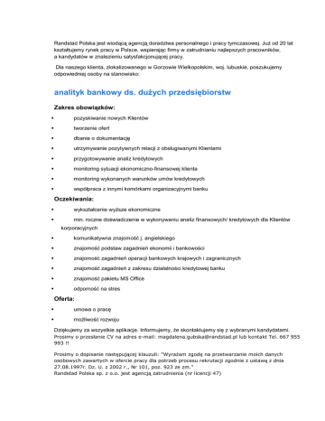 Randstad Polska jest wiodącą agencją doradztwa personalnego i pracy tymczasowej. Już od 20 lat kształtujemy rynek pracy w Polsce, wspierając firmy w zatrudnianiu najlepszych pracowników, a kandydatów w znalezieniu satysfakcjonującej pracy. Dla naszego klienta, zlokalizowanego w Gorzowie Wielkopolskim, woj. lubuskie, poszukujemy odpowiedniej osoby na stanowisko: analityk bankowy ds. dużych przedsiębiorstw Zakres obowiązków: pozyskiwanie nowych Klientów tworzenie ofert dbanie o dokumentację utrzymywanie pozytywnych relacji z obsługiwanymi Klientami przygotowywanie analiz kredytowych monitoring sytuacji ekonomiczno-finansowej klienta monitoring wykonanych warunków umów kredytowych współpraca z innymi komórkami organizacyjnymi banku Oczekiwania: wykształcenie wyższe ekonomiczne min. roczne doświadczenie w wykonywaniu analiz finansowych/ kredytowych dla Klientów korporacyjnych komunikatywna znajomość j. angielskiego znajomość podstaw zagadnień ekonomii i bankowości znajomość zagadnień operacji bankowych krajowych i zagranicznych znajomość zagadnień z zakresu działalności kredytowej banku znajomość pakietu MS Office odporność na stres Oferta: umowa o pracę możliwość rozwoju Dziękujemy za wszystkie aplikacje. Informujemy, że skontaktujemy się z wybranymi kandydatami. Prosimy o przesłanie CV na adres e-mail: [email protected] lub kontakt Tel. 667 955 993 !! Prosimy o dopisanie następującej klauzuli: "Wyrażam zgodę na przetwarzanie moich danych osobowych zawartych w ofercie pracy dla potrzeb procesu rekrutacji zgodnie z ustawą z dnia 27.08.1997r. Dz. U. z 2002 r., Nr 101, poz. 923 ze zm." Randstad Polska sp. z o.o. jest agencją zatrudnienia (nr licencji 47)