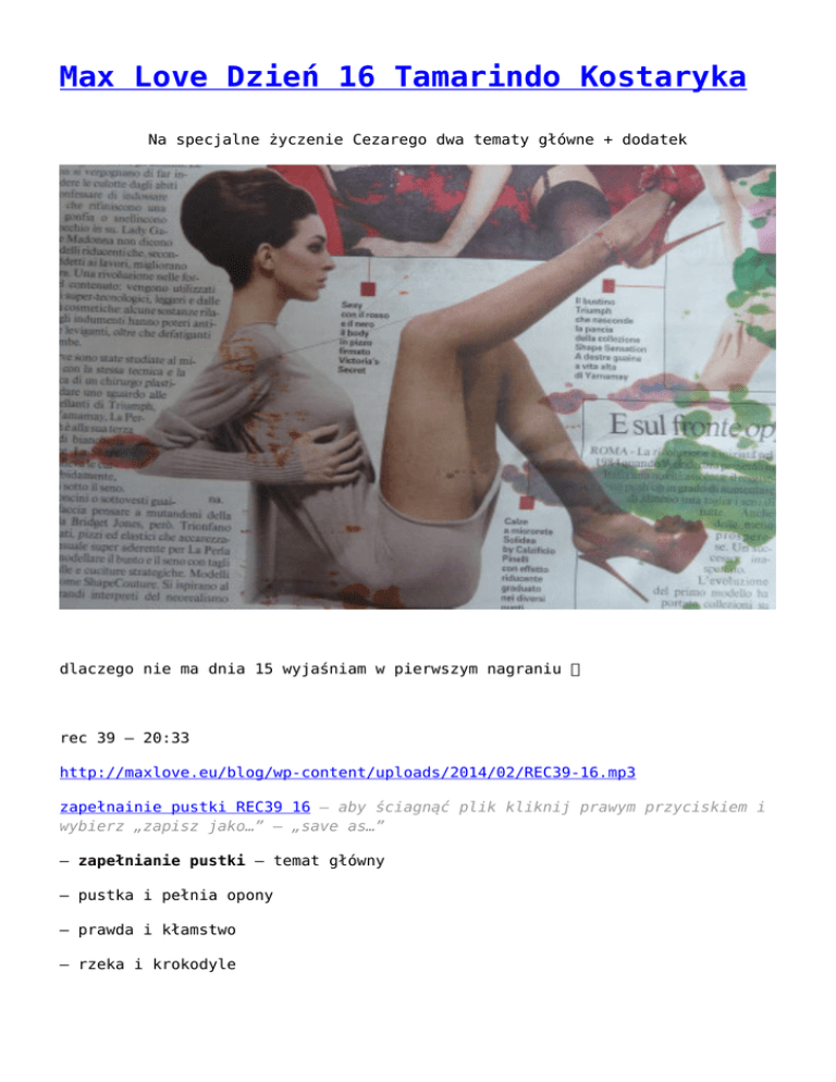 Max Love Dzień 16 Tamarindo Kostaryka Na specjalne życzenie Cezarego dwa tematy główne + dodatek dlaczego nie ma dnia 15 wyjaśniam w pierwszym nagraniu rec 39 – 20:33 http://maxlove.eu/blog/wp-content/uploads/2014/02/REC39-16.mp3 zapełnainie pustki REC39 16 – aby ściagnąć plik kliknij prawym przyciskiem i wybierz „zapisz jako…” – „save as…” – zapełnianie pustki – temat główny – pustka i pełnia opony – prawda i kłamstwo – rzeka i krokodyle rec 40 – 21:15 http://maxlove.eu/blog/wp-content/uploads/2014/02/REC40-16.mp3 budowanie relacji REC40 16 – aby ściagnąć plik kliknij prawym przyciskiem i wybierz „zapisz jako…” – „save as…” – budowanie relacji – temat główny – relacja ja – ja – relacja ja – rodzice – relacja ja – świat – relacja ja – bóg – dzień miniaturą życia – oddech miniaturą dnia/życia – przerwy w oddychaniu – młodość – starość – jak żyć dłużej – nieśmiertelność rec 41 – 29:26 http://maxlove.eu/blog/wp-content/uploads/2014/02/REC41-16.mp3 max love REC41 16 – aby ściagnąć plik kliknij prawym przyciskiem i wybierz „zapisz jako…” – „save as…” – moje główne zajęcie od 5 lat – materialność – duchowość – energia – czas – efektywność – matrix chłopa i pana w Polsce – życie bezdomnego i milionera – okradanie we własnym domu – zmiana wymaga wiedzy czego się chce by Max Love 333