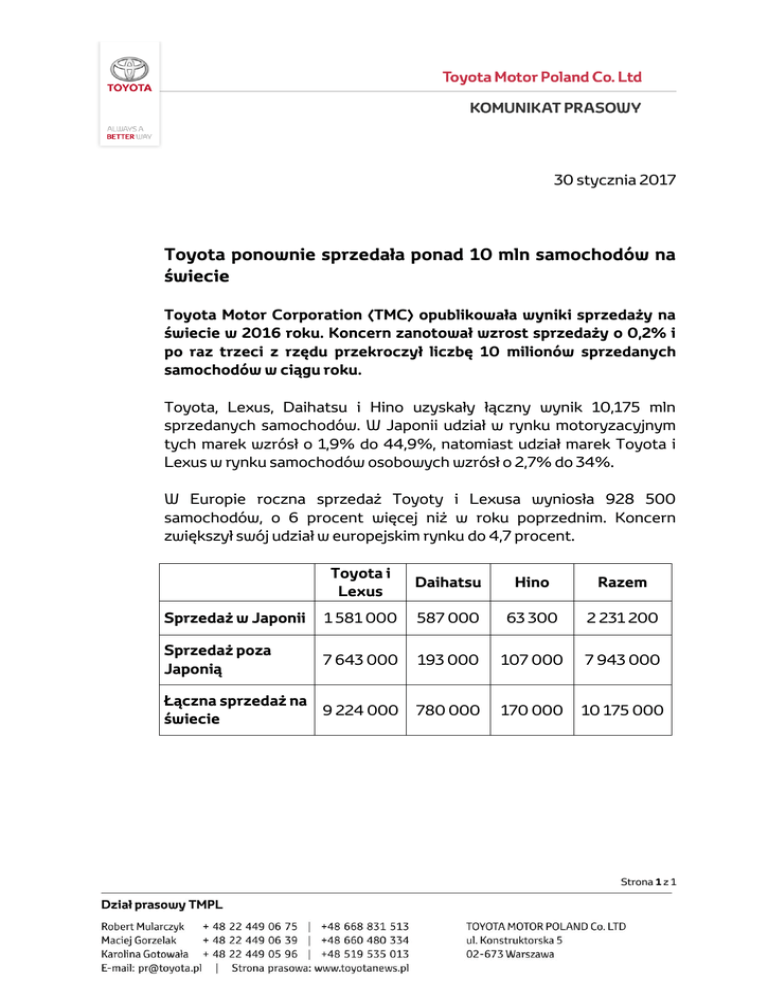 30 stycznia 2017 Toyota ponownie sprzedała ponad 10 mln samochodów na świecie Toyota Motor Corporation (TMC) opublikowała wyniki sprzedaży na świecie w 2016 roku. Koncern zanotował wzrost sprzedaży o 0,2% i po raz trzeci z rzędu przekroczył liczbę 10 milionów sprzedanych samochodów w ciągu roku. Toyota, Lexus, Daihatsu i Hino uzyskały łączny wynik 10,175 mln sprzedanych samochodów. W Japonii udział w rynku motoryzacyjnym tych marek wzrósł o 1,9% do 44,9%, natomiast udział marek Toyota i Lexus w rynku samochodów osobowych wzrósł o 2,7% do 34%. W Europie roczna sprzedaż Toyoty i Lexusa wyniosła 928 500 samochodów, o 6 procent więcej niż w roku poprzednim. Koncern zwiększył swój udział w europejskim rynku do 4,7 procent. Toyota i Lexus Daihatsu Hino Razem Sprzedaż w Japonii 1 581 000 587 000 63 300 2 231 200 Sprzedaż poza Japonią 7 643 000 193 000 107 000 7 943 000 Łączna sprzedaż na 9 224 000 świecie 780 000 170 000 10 175 000 Strona 1 z 1