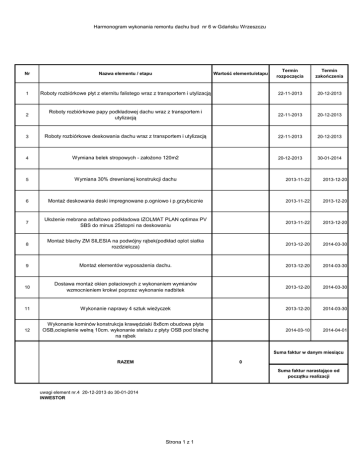 Harmonogram wykonania remontu dachu bud nr 6 w Gdańsku Wrzeszczu Termin rozpoczęcia Termin zakończenia Roboty rozbiórkowe płyt z eternitu falistego wraz z transportem i utylizacją 22-11-2013 20-12-2013 2 Roboty rozbiórkowe papy podkładowej dachu wraz z transportem i utylizacją 22-11-2013 20-12-2013 3 Roboty rozbiórkowe deskowania dachu wraz z transportem i utylizacją 22-11-2013 20-12-2013 4 Wymiana belek stropowych - założono 120m2 20-12-2013 30-01-2014 5 Wymiana 30% drewnianej konstrukcji dachu 2013-11-22 2013-12-20 6 Montaż deskowania deski impregnowane p.ogniowo i p.grzybicznie 2013-11-22 2013-12-20 7 Ułożenie mebrana asfaltowo podkładowa IZOLMAT PLAN optimax PV SBS do minus 25stopni na deskowaniu 2013-11-22 2013-12-20 8 Montaż blachy ZM SILESIA na podwójny rąbek(podkład oplot siatka rozdzielcza) 2013-12-20 2014-03-30 9 Montaż elementów wyposażenia dachu. 2013-12-20 2014-03-30 10 Dostawa montaż okien połaciowych z wykonaniem wymianów wzmocnieniem krokwi poprzez wykonanie nadbitek 2013-12-20 2014-03-30 11 Wykonanie naprawy 4 sztuk wieżyczek 2013-12-20 2014-03-30 12 Wykonanie kominów konstrukcja krawędziaki 8x8cm obudowa płyta OSB,ocieplenie wełną 10cm. wykonanie stelażu z płyty OSB pod blachę na rąbek 2014-03-10 2014-04-01 Nr Nazwa elementu / etapu 1 Wartość elementu/etapu Suma faktur w danym miesiącu RAZEM 0 Suma faktur narastająco od początku realizacji uwagi element nr.4 20-12-2013 do 30-01-2014 INWESTOR Strona 1 z 1