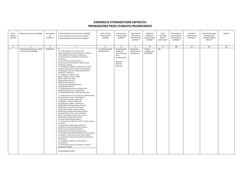 EWIDENCJA STOWARZYSZEŃ ZWYKŁYCH PROWADZONA PRZEZ STAROSTĘ PRUDNICKIEGO Numer kolejny w ewidencji 1 1. Daty wpisów do ewidencji1) 1. Cel/cele działania stowarzyszenia zwykłego2) 2. Teren działania stowarzyszenia zwykłego3) 3.Środki działania stowarzyszenia zwykłego 4) 2 3 Towarzystwo Artystyczne „UKA” imienia Czesława Wołłejki 12.08.2016 r. 4 1. 1) Celem ogólnym Towarzystwa jest aktywizacja pozytywnej świadomości osobowej i obywatelskiej wśród dzieci, młodzieży i dorosłych poprzez działalność artystyczną i oświatową 2) Uwrażliwianie społeczeństwa na zachowywanie uniwersalnych wartości zasad demokracji i dialogu; 3) rozbudzanie zainteresowania kulturą, sztuką i folklorem jako przestrzeniami wielostronnego, harmonijnego rozwoju i samorealizacji dzieci, młodzieży i dorosłych; 4) edukacja i wychowywanie poprzez kulturę i sztukę, a także poprzez budowanie więzi międzypokoleniowych i międzyśrodowiskowych; 5) integracja międzypokoleniowa i międzyśrodowiskowa; 6) propagowanie uczenia się dialogu jako podstawy pokojowego współistnienia wewnątrzpaństwowego i międzynarodowego; Nazwa stowarzyszenia zwykłego 7) inspirowanie osób i instytucji do współtworzenia forum wymiany wiedzy i doświadczeń w dziedzinach ekologii, opieki nad zwierzętami, ochrony dziedzictwa przyrodniczego, kultury, szkolnictwa, problematyki zrównoważonego rozwoju, ochrony praw człowieka i obywatela, zachowania porządku i bezpieczeństwa publicznego, poszanowania miejsc pamięci, pamiątek historycznych, praw autorskich, praw do godziwego wypoczynku, praw do publicznego występowania przeciw wszelkim formom dyskryminacji; 8) charytatywne wspieranie osób w trudnej sytuacji życiowej; 9) promowanie zwiększania możliwości zatrudnienia osób pozostających bez pracy, zagrożonych pozostaniem bez pracy, zagrożonych wykluczeniem społecznym; 10) poszukiwanie metod przełamywania stereotypów w myśleniu i zachowaniu wobec osób „innych”; 11) popieranie ochrony praw polskich mniejszości narodowych; 12) działalność związana z osobą patrona Towarzystwa; 13) krzewienie wartości związanych z dobrymi tradycjami Prudnika. 2. Rzeczpospolita Polska Adres siedziby stowarzyszenia zwykłego Reprezentacja stowarzyszenia zwykłego5) Organ kontroli wewnętrznej stowarzyszenia zwykłego6) Regulamin działalności stowarzyszenia zwykłego7) 5 6 7 8 ul. Piastowska 32/6 48-200 Prudnik Stowarzyszenie zwykłe jest reprezentowane przez przedstawiciela Agnieszka KosińskaSzewczyk Nie posiada organu kontroli wewnętrznej Przyjęty uchwałą z dnia 02.08.2016 r. Status organizacji pożytku publicznego8) Przekształcenie lub rozwiązanie stowarzyszenia zwykłego9) Likwidator stowarzyszenia zwykłego10) Zastosowanie wobec stowarzyszenia zwykłego środków nadzoru11) Uwagi12) 9 10 11 12 13 - - - - NIE 3. 1) organizowanie, inicjowanie, wspieranie przedsięwzięć edukacyjno-kulturalnych, czyli: przedstawień, koncertów, spotkań autorskich, pokazów, wycieczek, zebrań, zjazdów, prelekcji, wykładów, konferencji, dyskusji publicznych, wywiadów, ankiet, wystaw, konkursów, związanych z celami Towarzystwa; 2) propagowanie i organizowanie warsztatów twórczych, zajęć teatralnych, filmowych, muzycznych, tanecznych, plastycznych i literackich, warsztatów umiejętności prowadzenia dialogu; 3) działalność wydawniczą związaną z celami Towarzystwa; 4) propagowanie i organizowanie wymiany między placówkami kulturalno-oświatowymi; 5) pozafinansowe lub finansowe wspieranie osób prawnych i fizycznych poprzez inicjowanie, propagowanie i organizowanie akcji kulturalnooświatowych, mediacji, wolontariatu, zbiórek publicznych, aukcji; 6) udział w projektach, konkursach i grantach przedmiotowo związanych z celami statutowymi Towarzystwa; 7) inicjowanie i realizację projektów oraz realizację zadań publicznych zgodnych z założeniami merytorycznymi Towarzystwa 1) 2) 3) 4) W kolumnie nr 3 wpisuje się datę wpisu do ewidencji i daty wpisów późniejszych. W kolumnie nr 4, w polu pierwszym, wpisuje się cele działania stowarzyszenia zwykłego zgodnie z regulaminem działalności. W kolumnie nr 4, w polu drugim, wpisuje się teren działania stowarzyszenia zwykłego zgodnie z regulaminem działalności. W kolumnie nr 4, w polu trzecim, wpisuje się środki działania stowarzyszenia zwykłego zgodnie z regulaminem działalności (pojęcie „środki działania” odnosi się do sposobu realizacji celów przez stowarzyszenie zwykle). 5) W kolumnie nr 6 - w przypadku reprezentacji stowarzyszenia zwykłego przez przedstawiciela należy wpisać: „Stowarzyszenie zwykle jest reprezentowane przez przedstawiciela” oraz wpisać jego imię i nazwisko; w przypadku gdy organem reprezentującym stowarzyszenie zwykle jest zarząd, należy wpisać imiona i nazwiska członków zarządu, ich funkcje oraz sposób reprezentacji. 6) W kolumnie nr 7 - jeżeli w regulaminie działalności przewidziano organ kontroli wewnętrznej, należy wpisać nazwę tego organu, imiona i nazwiska jego członków oraz ich funkcje; w przypadku nieposiadania przez stowarzyszenie zwykłe organu kontroli wewnętrznej należy wpisać: „Stowarzyszenie zwykle nie posiada organu kontroli wewnętrznej.”. 7) W kolumnie nr 8 wpisuje się informacje o regulaminie działalności i jego zmianach, w szczególności numer i datę uchwały dotyczącej regulaminu działalności oraz jego zmian. 8) W kolumnie nr 9 wpisuje się informację o posiadaniu statusu organizacji pożytku publicznego; w przypadku posiadania przez stowarzyszenie zwykle statusu organizacji pożytku publicznego należy wpisać: „TAK”; w przypadku nieposiadania przez stowarzyszenie zwykle statusu organizacji pożytku publicznego należy wpisać: „NIE”. 9) W kolumnie nr 10 wpisuje się informacje o przekształceniu lub rozwiązaniu stowarzyszenia zwykłego; w przypadku przekształcenia stowarzyszenia zwykłego należy wpisać datę i numer uchwa