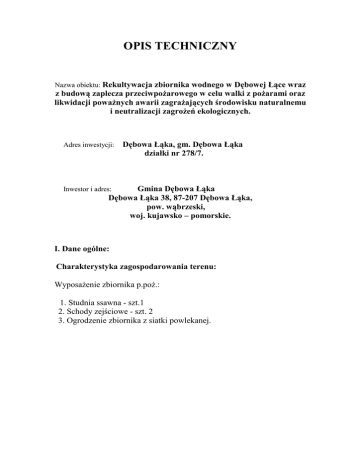 OPIS TECHNICZNY Nazwa obiektu: Rekultywacja zbiornika wodnego w Dębowej Łące wraz z budową zaplecza przeciwpożarowego w celu walki z pożarami oraz likwidacji poważnych awarii zagrażających środowisku naturalnemu i neutralizacji zagrożeń ekologicznych. Adres inwestycji: Dębowa Łąka, gm. Dębowa Łąka działki nr 278/7. Gmina Dębowa Łąka Dębowa Łąka 38, 87-207 Dębowa Łąka, pow. wąbrzeski, woj. kujawsko – pomorskie. Inwestor i adres: I. Dane ogólne: Charakterystyka zagospodarowania terenu: Wyposażenie zbiornika p.poż.: 1. Studnia ssawna - szt.1 2. Schody zejściowe - szt. 2 3. Ogrodzenie zbiornika z siatki powlekanej. II. Dane techniczne: 1. Dane szczegółowe o parametrach studni ssawnej wg projektu: Właz żeliwny wentylowany typ lekki 5 t Pokrywa żelbetowa 2000/600x150 szt.1 Krąg żelbetowy szt.1 1800x600x140 + 2 x wlew + stopnie złazowe Krąg żelbetowy szt.1 1800x600x140 ustawiony na chudym betonie B10 gr. 10 cm Pokrywa z włazem 1640/600x140 szt.1 - płyta OSB gr. 22 mm wodoodporna górą - wełna mineralna twarda gr.100 mm - płyta OSB gr. 22 mm wodoodporna dołem Krąg żelbetowy szt.2 1200x600x120 + stopnie złazowe Krąg żelbetowy szt.1 1200x1000x120 + stopnie złazowe Krąg żelbetowy szt.1 1200x1000x120 + wlew + stopnie złazowe Krąg żelbetowy szt.1 1200x600x120 z dnem + stopnie złazowe Chudy beton gr. 10 cm beton B10 BETON B25 (C20/25) KLASA EKSPOZYCJI XC2 OTULINA 40 mm STAL A-II (18G2-b) RB400W strzemiona A-I (St3S-b) PB240 2. Dane szczegółowe o parametrach wyposażenia studni ssawnej wg projektu: 1234567- Stopnie złazowe wg PN-64/H74066 osadzone co 30 cm Zawór oddechowy Ø110 mm Styropian ekstrudowany gr. 10 cm Przewód ssący Ø100 mm wg PN-83/H-02651 Nasada Ø110 mm wg PN-91/M-51038 Pokrywa nasady Ø110 mm wg PN-91/M-51024 Smok ssawny 8- Pierścienie usztywniająco - uszczelniające 9- Przewód czerpalny NØ315x7,7 o L = 1200 cm 10- Część perforowana górnego odcinka wlotowego rury czerpalnej w postaci otworów Ø6 mm co 14 mm w przedziale 120° 11- Pokrywa zamykająca rurę perforowana 12- Pierścienie stalowe usztywniająco - podtrzymujące siatkę 13- Stelaże podtrzymujące rurę 14- Siatka stalowa 15- Obrukowanie skosów na chudym betonie ze spoinowaniem 16- Płyty betonowe JOMB 100x75x12 wypełnione chudym betonem 17- Kotwy siatki i stelarzy 18- Umocnienie zbiornika geokratą PRS 330-075 19- Bloczki betonowe 12x25x39 III. Warunki lokalizacyjne: 1. Poziom posadowienia zbiornika – 93,79 m n.p.m. IV. Konstrukcja: 1. Schody zejściowe żelbetowe wykonane z betonu B20, ułożone na gruncie i wyposażone w poręcz wykonaną zgodnie z &296-&298. Stal zbrojeniowa konstrukcyjna B400. 2. Ogrodzenie prefabrykowane z siatki ocynkowanej, powlekanej w kolorze zielonym. Ogrodzenie z siatki wys. 1,25 m na słupkach istniejących z kształtowników o rozstawie 2.6 m obsadzonych w cokole - siatka o wys. h = 1,20 m, ocynk, powlekana, gr. drutu 3,2 mm, oczko 55x55 - akcesoria ( napinacze drutu, obejmy przelotowe, dodatkowe słupki podporowe - narożne) - drut naciągowy powlekany 4 mm V. Zieleń: Rekultywowane miejsce wokół zbiornika zaprojektowano na trawie z zasiewu. Trawa wymaga spulchnienia na głębokość 15-25cm. Następnie należy rozścielić 10 cm warstwę żyznej gleby. Dodać kompost lub torf. Odczyn gleby powinien być lekko kwaśny. Powierzchnia gleby musi być dokładnie wyrównana i zwałowana wałem oraz płytko zagrabiona. Trawę wysiewać w pogodę bezwietrzną, gdy wilgotność powietrza i gleby jest umiarkowana. Wysiana trawa winna być w miarę przykryta a następnie uwałowana. W ramach zadania wchodzi również pielęgnacja nawadniająca wschodzącą trawę. Trawniki należy wykonać po zakończeniu wszystkich prac budowlanych. VI. Uwagi: 1. Do zagospodarowanie terenu pod rekultywację zbiornika, należy stosować materiały budowlane posiadające certyfikaty jakości i atesty. Świadectwa jakości należy przechowywać i okazywać na żądanie nadzoru budowlanego. 2 Po wykonaniu prac należy uporządkować teren a nasypy i oskarpowania wyprofilować zgodnie z projektem i obsiać trawą z przeznaczeniem na trawniki.