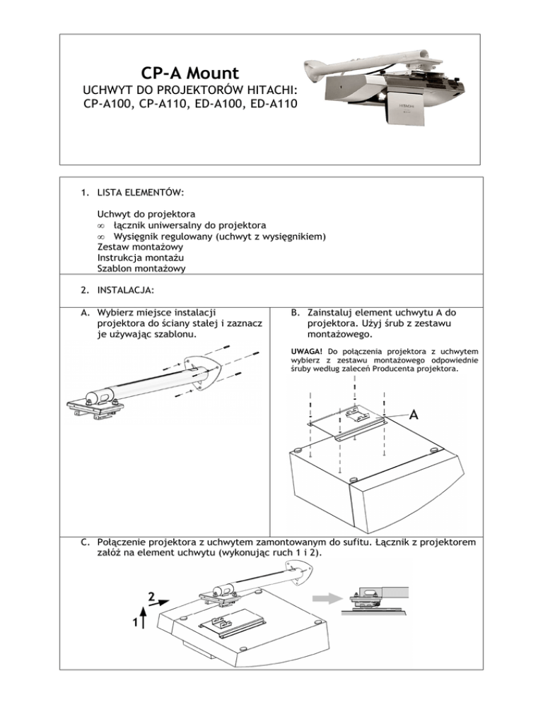 CP-A Mount UCHWYT DO PROJEKTORÓW HITACHI: CP-A100, CP-A110, ED-A100, ED-A110 1. LISTA ELEMENTÓW: Uchwyt do projektora • łącznik uniwersalny do projektora • Wysięgnik regulowany (uchwyt z wysięgnikiem) Zestaw montaŜowy Instrukcja montaŜu Szablon montaŜowy 2. INSTALACJA: A. Wybierz miejsce instalacji projektora do ściany stałej i zaznacz je uŜywając szablonu. B. Zainstaluj element uchwytu A do projektora. UŜyj śrub z zestawu montaŜowego. UWAGA! Do połączenia projektora z uchwytem wybierz z zestawu montaŜowego odpowiednie śruby według zaleceń Producenta projektora. C. Połączenie projektora z uchwytem zamontowanym do sufitu. Łącznik z projektorem załóŜ na element uchwytu (wykonując ruch 1 i 2). 3. USTAWIENIE PROJEKTORA: A. Śruba D słuŜy do regulacji projektora w osi poziomej. Zakres obrotu 12°. B. Komfortowe ustawienie projektora w odpowiedniej płaszczyźnie poprzez odpowiednie dokręcenie śrub regulujących E. C. Włącz projektor i regulując śrubami (oznaczenie E) ustaw projektor tak, aby obraz wyświetlany był równo na ekranie. 4. DANE TECHNICZNE Nazwa produktu: CP-A Mount Regulacja : Regulacja w kaŜdej osi CięŜar uchwytu: 4,3 kg 5. ZAWARTOŚĆ zestawu montaŜowego do projektora : Śruby: Podkładki: Kołki rozporowe: Wkręty: Producent: VIZ-ART Automation tel.+48 22/6138899 www.viz-art.pl M6x12 – 4 szt. M6x20 – 2 szt. Ø6x12 – 4 szt. Ø8x60 – 3 szt. ø8x60 – 3 szt. Ø8x60 z płaskim łbem – 3 szt.