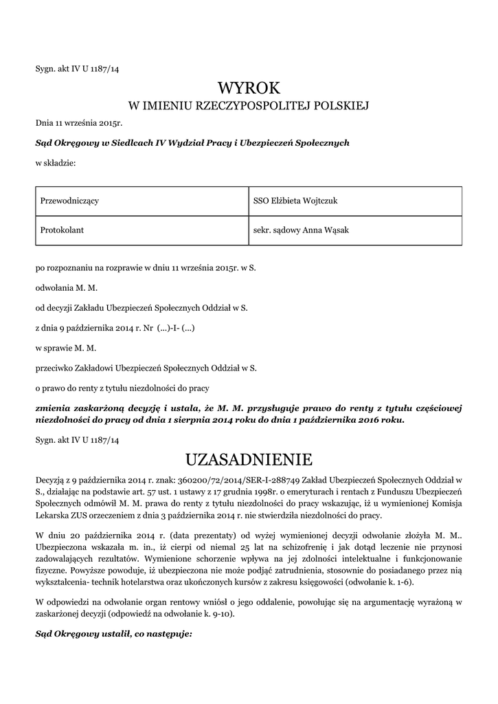 Sygn. akt IV U 1187/14 WYROK W IMIENIU RZECZYPOSPOLITEJ POLSKIEJ Dnia 11 września 2015r. Sąd Okręgowy w Siedlcach IV Wydział Pracy i Ubezpieczeń Społecznych w składzie: Przewodniczący SSO Elżbieta Wojtczuk Protokolant sekr. sądowy Anna Wąsak po rozpoznaniu na rozprawie w dniu 11 września 2015r. w S. odwołania M. M. od decyzji Zakładu Ubezpieczeń Społecznych Oddział w S. z dnia 9 października 2014 r. Nr (...)-I- (...) w sprawie M. M. przeciwko Zakładowi Ubezpieczeń Społecznych Oddział w S. o prawo do renty z tytułu niezdolności do pracy zmienia zaskarżoną decyzję i ustala, że M. M. przysługuje prawo do renty z tytułu częściowej niezdolności do pracy od dnia 1 sierpnia 2014 roku do dnia 1 października 2016 roku. Sygn. akt IV U 1187/14 UZASADNIENIE Decyzją z 9 października 2014 r. znak: 360200/72/2014/SER-I-288749 Zakład Ubezpieczeń Społecznych Oddział w S., działając na podstawie art. 57 ust. 1 ustawy z 17 grudnia 1998r. o emeryturach i rentach z Funduszu Ubezpieczeń Społecznych odmówił M. M. prawa do renty z tytułu niezdolności do pracy wskazując, iż u wymienionej Komisja Lekarska ZUS orzeczeniem z dnia 3 października 2014 r. nie stwierdziła niezdolności do pracy. W dniu 20 października 2014 r. (data prezentaty) od wyżej wymienionej decyzji odwołanie złożyła M. M.. Ubezpieczona wskazała m. in., iż cierpi od niemal 25 lat na schizofrenię i jak dotąd leczenie nie przynosi zadowalających rezultatów. Wymienione schorzenie wpływa na jej zdolności intelektualne i funkcjonowanie fizyczne. Powyższe powoduje, iż ubezpieczona nie może podjąć zatrudnienia, stosownie do posiadanego przez nią wykształcenia- technik hotelarstwa oraz ukończonych kursów z zakresu księgowości (odwołanie k. 1-6). W odpowiedzi na odwołanie organ rentowy wniósł o jego oddalenie, powołując się na argumentację wyrażoną w zaskarżonej decyzji (odpowiedź na odwołanie k. 9-10). Sąd Okręgowy ustalił, co następuje: Wnioskodawczyni M. M. w dniu 11 sierpnia 2014 r. wystąpiła do Zakładu Ubezpieczeń Społecznych Oddział w S. z wnioskiem o ponowne ustalenie prawa do renty z tytułu niezdolności do pracy (wniosek k. 154-156 akt organu rentowego). Składając powyższy wniosek, M. M. była uprawniona do pobierania renty z tytułu częściowej niezdolności do pracy od 1 października 2012 r. do dnia 31 lipca 2014 r. (decyzja z dnia 21 sierpnia 2012 r. k. 150 akt organu rentowego). Rozpoznając wniosek organ rentowy skierował wnioskodawczynię na badanie przez Lekarza Orzecznika ZUS, który w orzeczeniu z 17 września 2014 r. ustalił, że M. M. jest częściowo niezdolna do pracy nadal do 30 września 2016 r. (k. 158 akt organu rentowego). ZUS zgłosił do powyższego orzeczenia zarzut wadliwości, wobec czego ubezpieczona została zbadana przez Komisję Lekarską ZUS. Wymieniony organ w orzeczeniu z dnia 3 października 2014 r. stwierdził, że M. M. nie jest niezdolna do pracy (k. 161 akt organu rentowego). Powyższe stało się podstawą do wydania przez organ rentowy zaskarżonej decyzji z 9 października 2014 r., na podstawie której Zakład Ubezpieczeń Społecznych Oddział w S. odmówił wnioskodawczyni prawa do renty z tytułu niezdolności do pracy (decyzja k. 164 akt organu rentowego). Biegli lekarze: ortopeda, neurolog oraz psychiatra w opinii sporządzonej na zlecenie sądu stwierdzili, że M. M. cierpi na schizofrenię, padaczkę z napadami rzadkimi, okresowy zespół bólowy kręgosłupa L/S na podłożu zmian dyskopatycznych po leczeniu operacyjnym dyskopatii L5-S1. Wymienione schorzenia w ocenie biegłych powodują, iż ubezpieczona jest częściowo niezdolna do pracy nadal w okresie do października 2016 r. Biegli wskazali, że powodem orzeczonej częściowej niezdolności do pracy jest toczący się od lat 90-tych proces schizofreniczny wymagający wielu hospitalizacji psychiatrycznych. Biegli podali, że analiza dokumentacji medycznej z (...) w W. wskazuje na to, że w obrazie klinicznym badanej dominują negatywne objawy procesu schizofrenicznego, które mimo stosowania bardzo wysokich dawek neuroleptyków bardzo zaburzają przystosowanie i funkcjonowanie społeczne ubezpieczonej (opinia k.18-19). Ubezpieczona, ur. (...) z zawodu jest technikiem hotelarstwa, ukończyła również kursy z zakresu księgowości (okoliczności niesporne). Pracowała w charakterze pomocy biurowej (świadectwo pracy k. 127 akt organu rentowego). Sąd Okręgowy zważył, co następuje: Odwołanie M. M. jest zasadne i zasługuje na uwzględnienie. Zgodnie z art. 57 ust. 1 i 2 ustawy z 17 grudnia 1998r. o emeryturach i rentach z Funduszu Ubezpieczeń Społecznych (Dz. U. z 2013 r., poz. 1440 ze zm.) renta z tytułu niezdolności do pracy przysługuje ubezpieczonemu, który spełnił łącznie następujące warunki: jest niezdolny do pracy, ma wymagany okres składkowy i nieskładkowy, a niezdolność do pracy powstała w okresach, o których mowa w art. 6 ust. 1 pkt 1 i 2, pkt 3 lit. b, pkt 4, 6, 7 i 9, ust. 2 pkt 1, 3-8 i 9 lit. a, pkt 10 lit. a, pkt 11-12, 13 lit. a, pkt 14 lit. a i pkt 15-17 oraz art. 7 pkt 1-3, 5 lit. a, pkt 6 i 12, albo nie później niż w ciągu 18 miesięcy od ustania tych okresów, przy czym ostatniego wymogu nie stosuje do ubezpieczonego, który udowodnił okres składkowy i nieskładkowy wynoszący co najmniej 20 lat dla kobiety lub 25 lat dla mężczyzny oraz jest całkowicie niezdolny do pracy. Stosownie do treści art. 12 ust. 1, 2 i 3 przytoczonej ustawy, niezdolną do pracy jest osoba, która całkowicie lub częściowo utraciła zdolność do pracy zarobkowej z powodu naruszenia sprawności organizmu i nie rokuje odzyskania zdolności do pracy po przekwalifikowaniu, przy czym całkowicie niezdolną do pracy jest osoba, która utraciła zdolność do wykonywania jakiejkolwiek pracy, a częściowo niezdolną do pracy jest osoba, która w znacznym stopniu utraciła zdolność do pracy zgodnej z poziomem posiadany