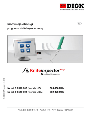 Instrukcja obsługi Nr 9 8500 3971 wersja 2 / 8-2013 programu Knifeinspector easy Nr art. 9 8510 000 (wersja UE) 865-868 MHz Nr art. 9 8510 001 (wersja USA) 902-928 MHz ____________________________________________________________________________________ Friedr. Dick GmbH & Co KG Postfach 1173 73777 Deizisau GERMANY Instrukcja obsługi Knifeinspector easy Copyright © 2013-2016 Friedr. Dick GmbH & Co. KG Niniejsza instrukcja obsługi jest chroniona prawami autorskimi; wszelkie prawa zastrzeżone. Powielanie niniejszej instrukcji obsługi, również fragmentaryczne, dozwolone jest wyłącznie za zgodą firmy Friedr. Dick GmbH & Co. KG. Nieprzestrzeganie powyższego zastrzeżenia pociąga za sobą roszczenia odszkodowawcze i może spowodować sankcje karne. 2 z 30 Instrukcja obsługi Knifeinspector easy Spis treści 1. Odpowiedzialność za produkt................................................................................................... 4 2. Wymagania systemowe ........................................................................................................... 4 3. Zawartość zestawu .................................................................................................................. 5 4. Instalacja programu.................................................................................................................. 6 5. Aktualizacja oprogramowania .................................................................................................. 7 6. Rejestracja oprogramowania .................................................................................................... 8 7. Pierwsze kroki: program Knifeinspector easy ........................................................................... 9 7.1 Logowanie ........................................................................................................................ 9 7.2 Menu główne (opis zarządzania narzędziami) ................................................................. 10 7.3 Pasek menu .................................................................................................................... 11 7.4 Pasek statusu ................................................................................................................. 12 Zarządzanie danymi (zarządzanie pracownikami) .................................................................. 13 8. 8.1 Tworzenie profilu nowego pracownika ............................................................................ 13 8.2 Uprawnienia .................................................................................................................... 14 8.3 Wyszukiwanie pracownika .............................................................................................. 14 8.4 Przypisywanie nazwy użytkownika i hasła....................................................................... 15 8.5 Modyfikowanie danych pracownika ................................................................................. 15 8.6 Usuwanie danych pracownika ......................................................................................... 16 8.7 Importowanie danych pracownika ................................................................................... 16 8.7.1 Przygotowanie danych w edytorze ........................................................................... 16 8.7.2 Przygotowanie danych w Microsoft Excel................................................................. 17 8.7.3 Import przygotowanego pliku CSV ........................................................................... 18 Wydawanie narzędzi .............................................................................................................. 19 9. 10. Status narzędzi ................................................................................................................... 22 10.1 Szczegółowy status danego narzędzia............................................................................ 22 10.2 Status większej liczby narzędzi ....................................................................................... 23 11. Raporty ............................................................................................................................... 25 11.1 Narzędzia wydane .......................................................................................................... 25 11.2 Narzędzia dostępne ........................................................................................................ 26 11.3 Narzędzia w serwisie ...................................................................................................... 27 11.4 Narzędzia przekazane do utylizacji ................................................................................. 28 12. Tworzenie kopii bezpieczeństwa ........................................................................................ 29 12.1 Kopiowanie danych ......................................................................................................... 29 12.2 Odtwarzanie danych ....................................................................................................... 30 13. Glosariusz .......................................................................................................................... 30 14. Pomoc techniczna .............................................................................................................. 30 3 z 30 Instrukcja obsługi Knifeinspector easy 1. Odpowiedzialność za produkt Obowiązują nasze ogólne warunki handlowe, które można pobrać ze strony www.dick.de. 2. Wymagania systemowe Procesor: Dual Core Hyper-Threading (4) lub lepszy Pamięć operacyjna RAM ≥ 2 GB Ilości wolnego miejsca na dysku twardym ≥ 3 GB (na partycji podstawowej) Rozdzielczość monitora ≥ 1024x768 Połączenie z internetem Port USB 2.0 System operacyjny (32-bitowy lub 64-bitowy): MS-Windows® XP (Service Pack 3 lu